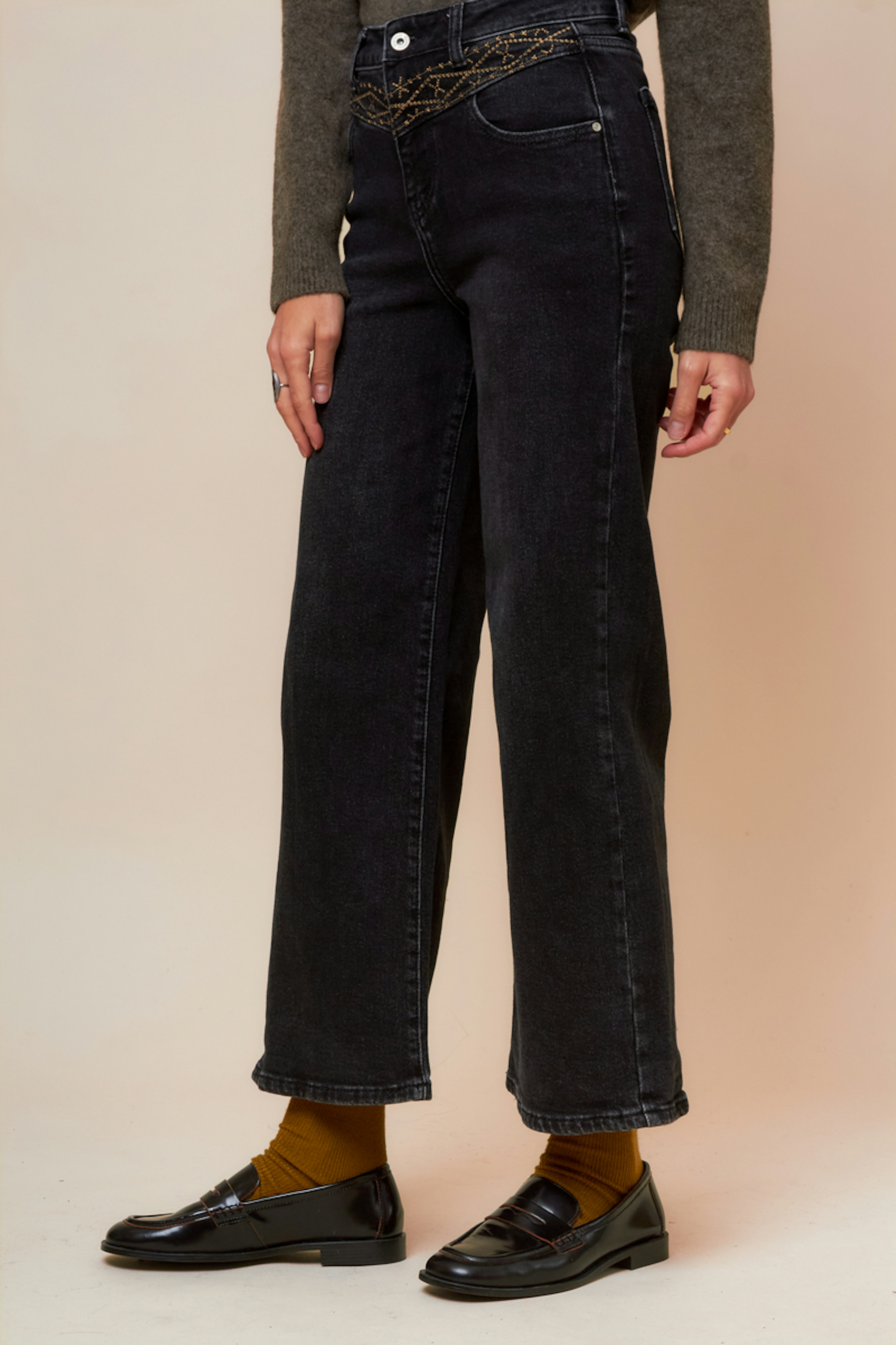 Pour un look audacieux et décontracté, associez ce jean large taille haute avec une chemise ajustée et des sneakers à motifs pour une touche de fun. Parfait en toute saison. • Jean large • Taille haute flatteuse • Coupe ample et confortable • Détail brodé à la ceinture • Noir classique et polyvalent