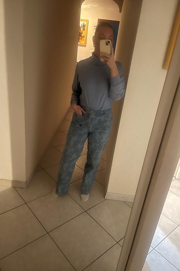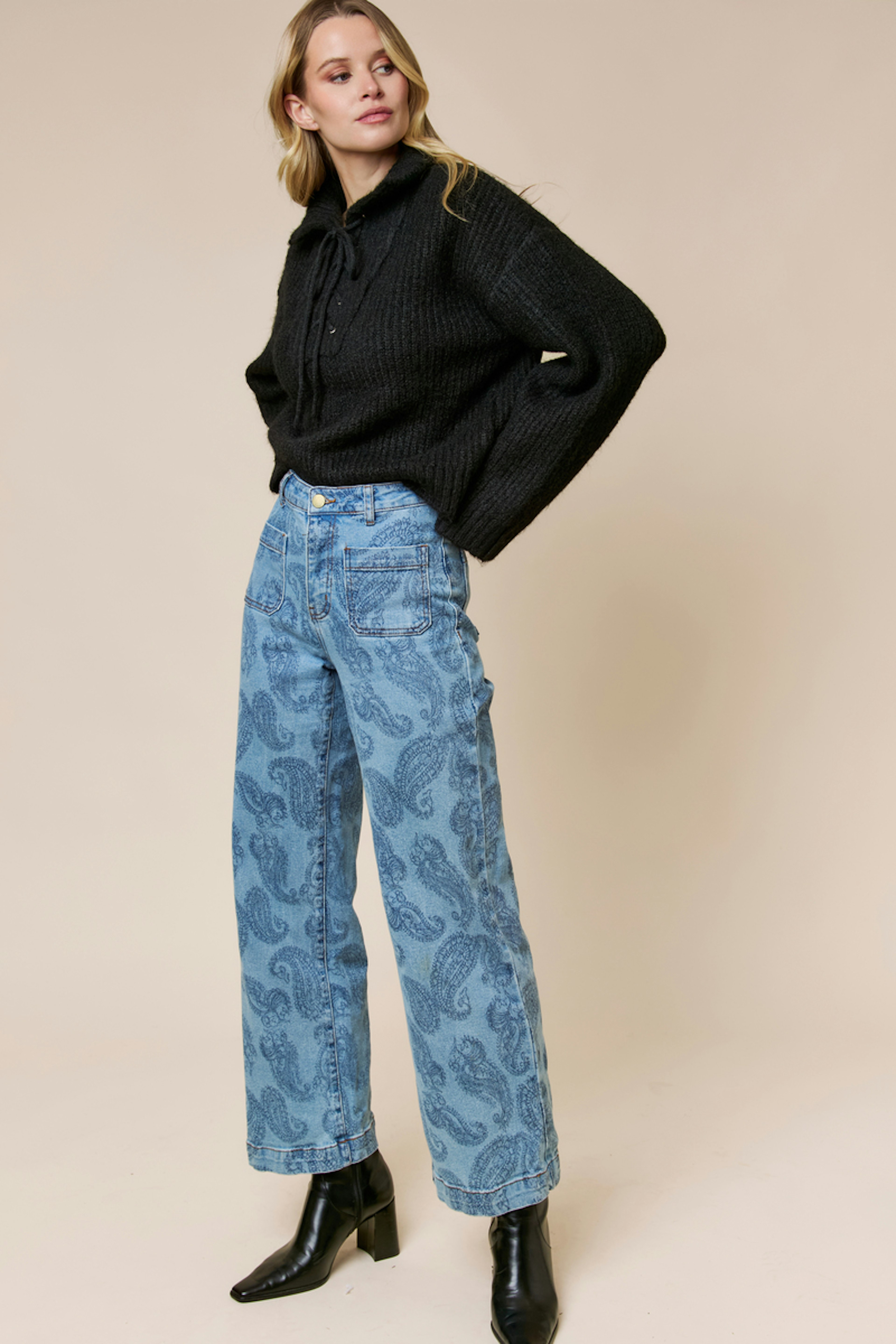 Associez-le à un chemisier léger et des bottines pour un look bohème chic, parfait pour les journées décontractées. • Jean wide leg • Taille haute flatteuse • Imprimé paisley • Coupe décontractée • Évasé vers le bas
