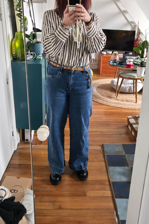 Associez ce jean ร une chemise en lin pour un look chic dรฉcontractรฉ. Ajoutez des sandales ร talons pour l'รฉtรฉ ou des bottines pour l'hiver. Parfait en toute saison. โข Coupe large et fluide โข Taille haute flatteuse โข Longueur au-dessus de la cheville โข Denim doux et confortable โข Teinte bleue polyvalente