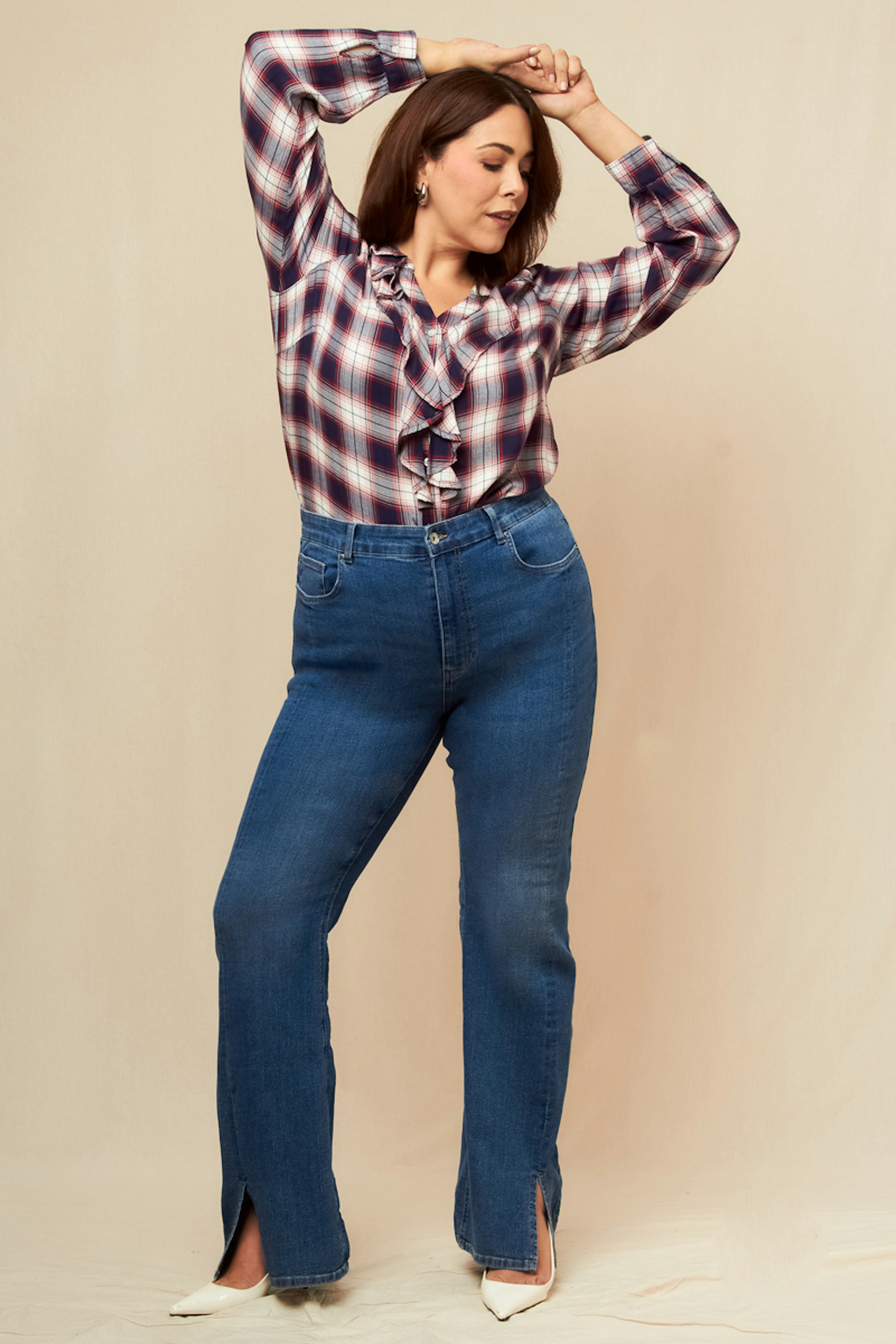 Optez pour un look chic en associant ce jean à une blouse fluide et des escarpins pour une touche élégante. Parfait en toute saison. • Jean évasé • Taille haute • Fermeture à crochets et zip • Fentes frontales • Passants pour ceinture