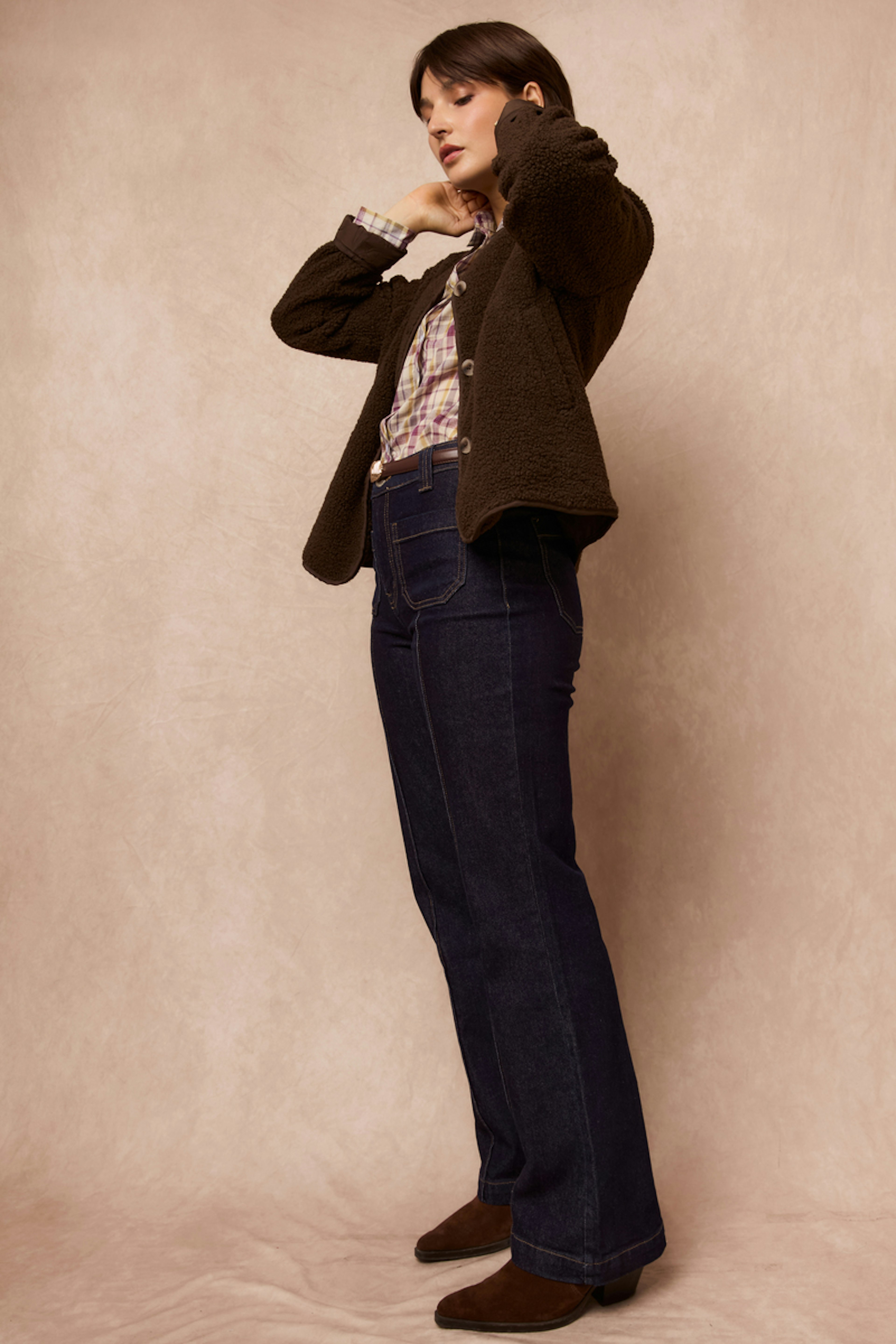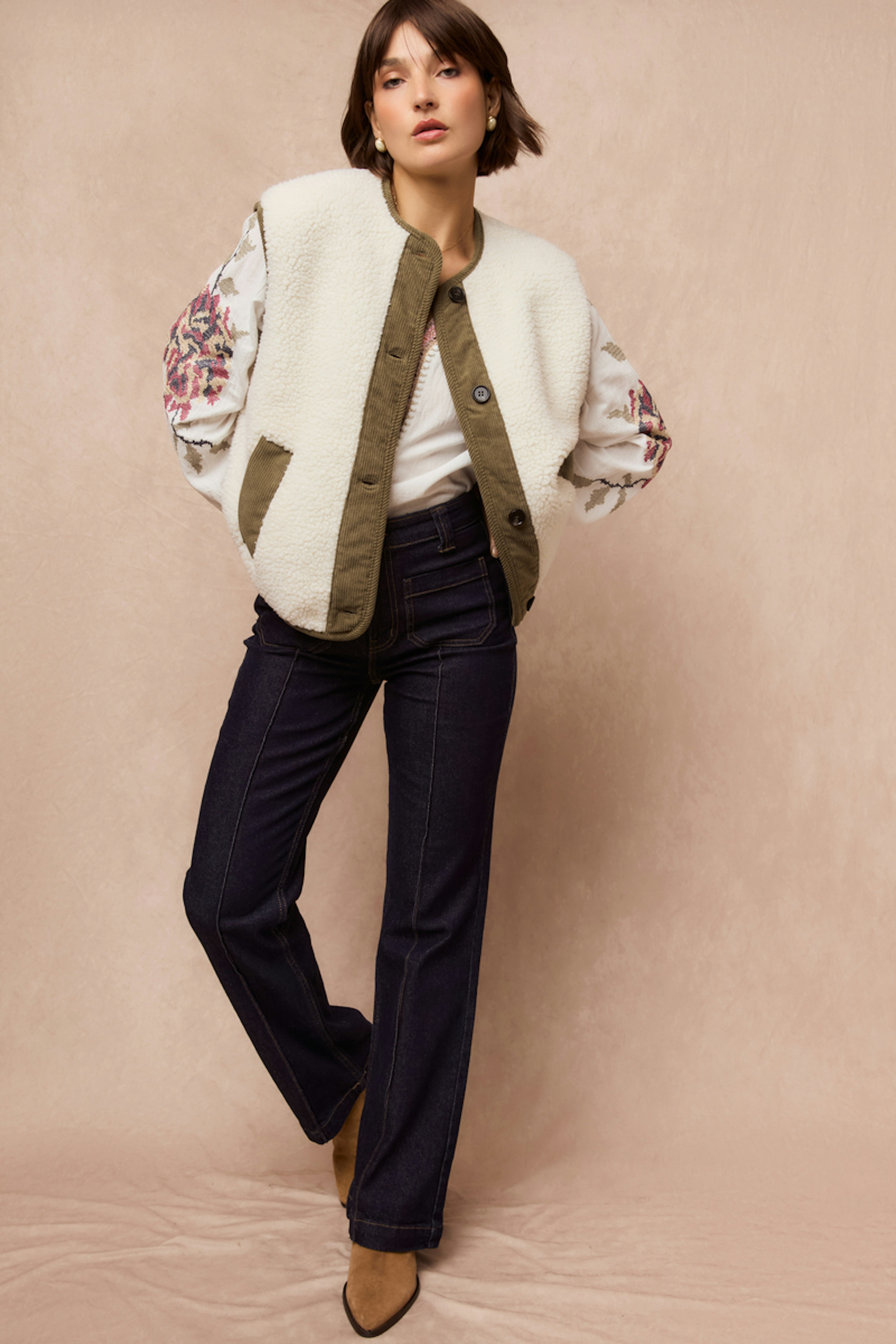 Associez ce jean flared avec une blouse légère et des bottines pour un look chic et décontracté, parfait en toute saison. • Jean flared • Coupe évasée • Taille haute • Passants de ceinture • Braguette à boutons
