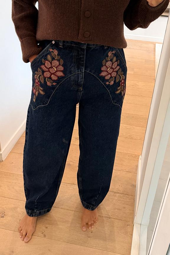 Associez ce jean avec un haut uni pour accentuer son imprimé floral. Parfait pour toutes les occasions! • Jean en denim • Coupe large • Taille haute • Imprimé floral • Bleu profond