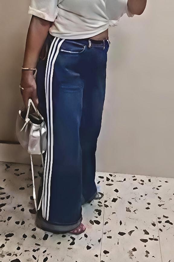 Optez pour une chemise blanche et des bottines élégantes pour un look chic. Idéal pour toutes les saisons. • Jean à larges jambes • Taille standard • Longueur pleine • Bandes latérales blanches • Coton confortable