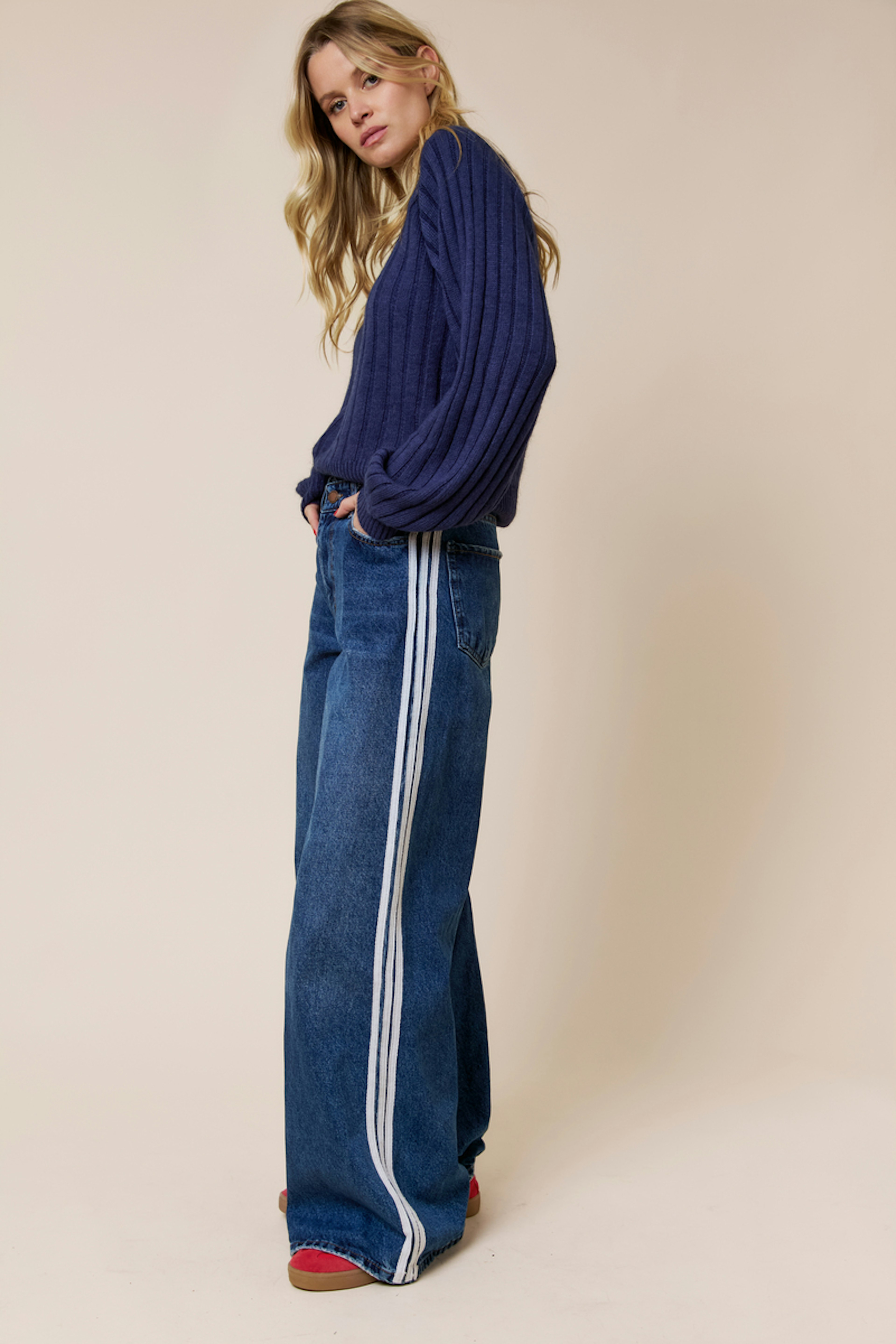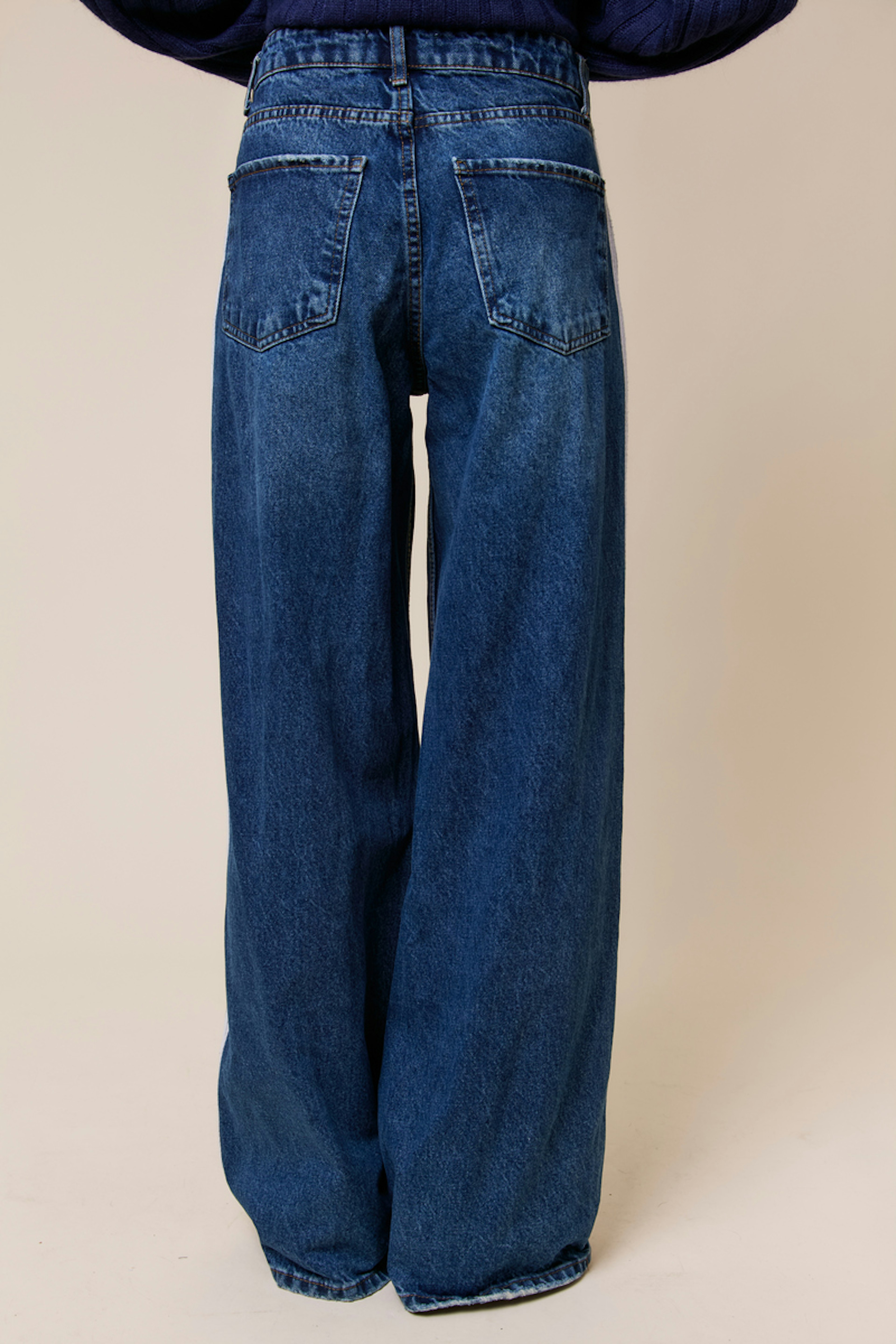 Optez pour une chemise blanche et des bottines élégantes pour un look chic. Idéal pour toutes les saisons. • Jean à larges jambes • Taille standard • Longueur pleine • Bandes latérales blanches • Coton confortable