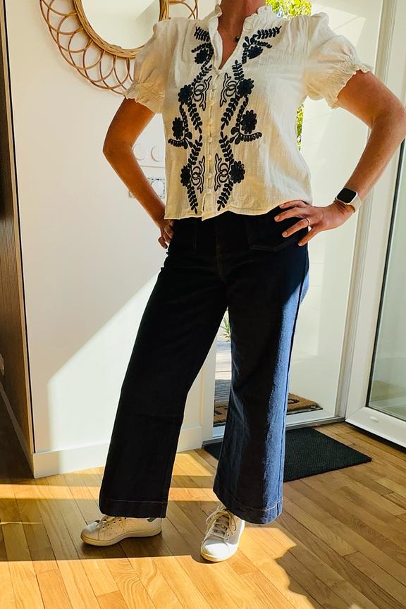 Pour un look chic sans effort, associez ce jean avec un chemisier fluide et des bottines en cuir. Ajoutez des accessoires dorés pour une touche de sophistication. • Jeans coupe droite • Taille mi-haute • Jambe légèrement évasée • Longueur aux chevilles • Délavage bleu intemporel