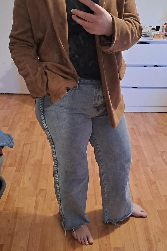 Optez pour ce jean avec une blouse fluide et des accessoires dorés pour une touche chic. Parfait en toute saison. • Coupe droite classique • Jambes larges et fluides • Détail tressé sur les côtés • Taille mi-haute • Finition ourlet brut