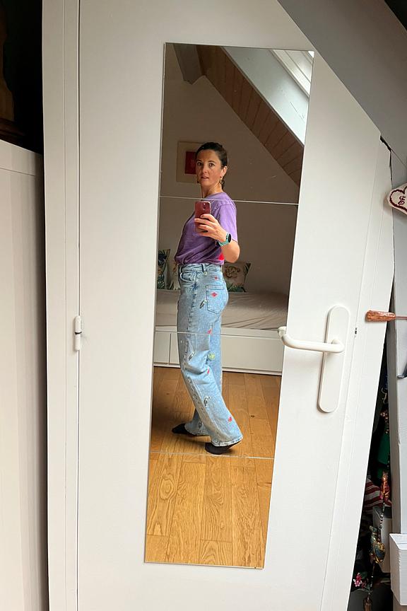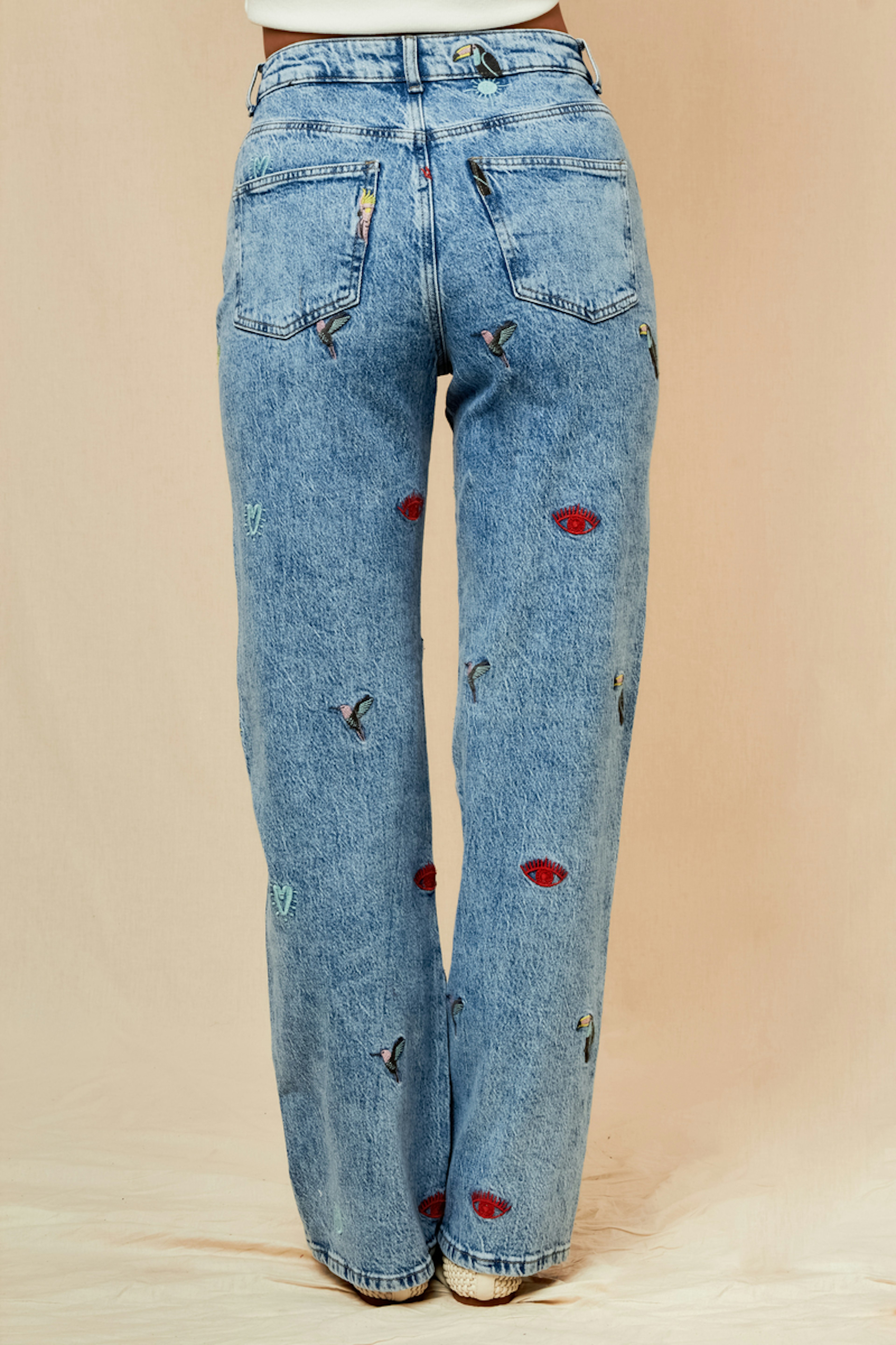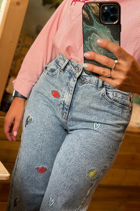 Associez ce jean avec un haut simple et des accessoires audacieux pour un look moderne. Parfait en toute saison. • Jean à motif imprimé • Coupe tempérée et confortable • Taille standard • Jambes légèrement évasées • Détails colorés brodés