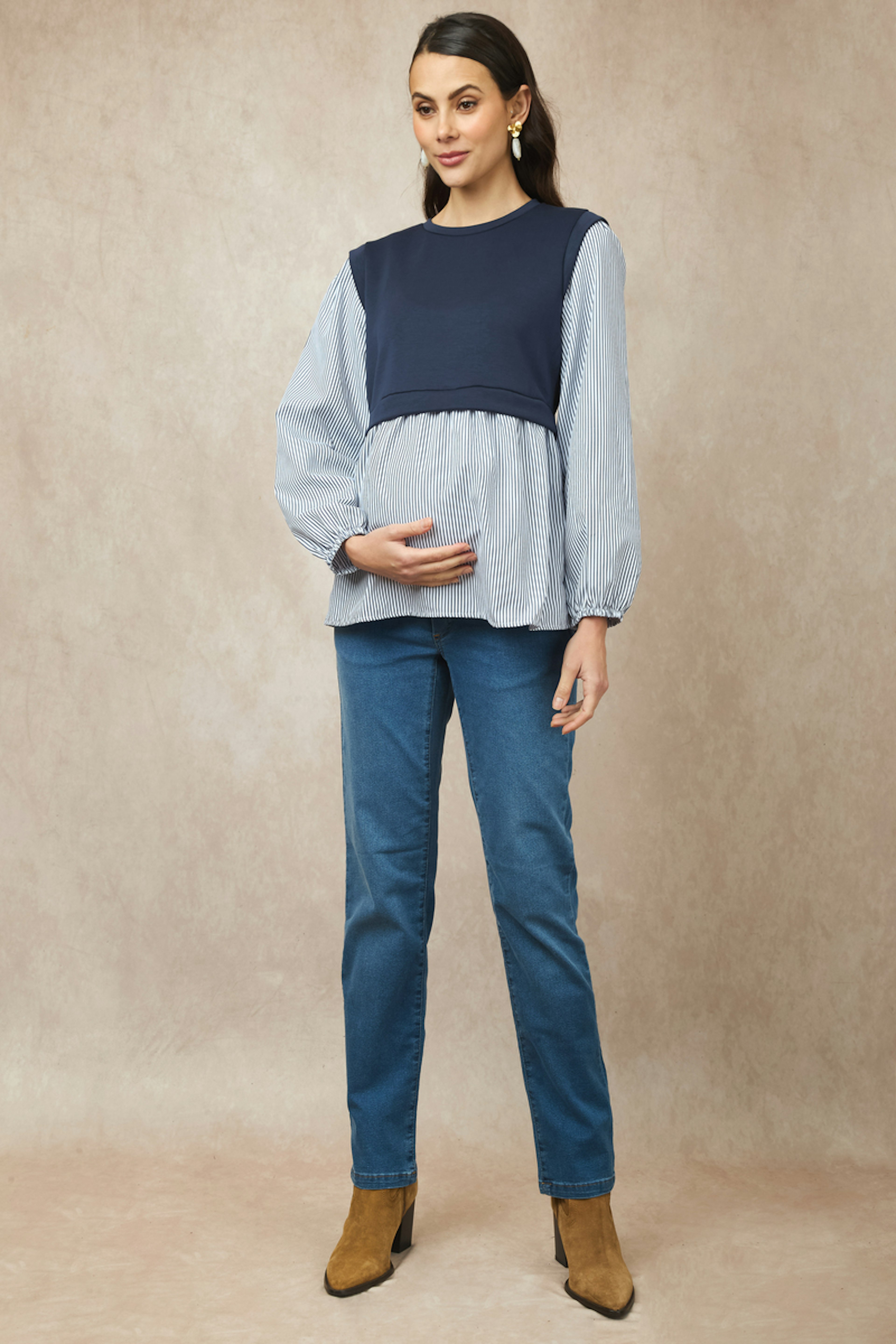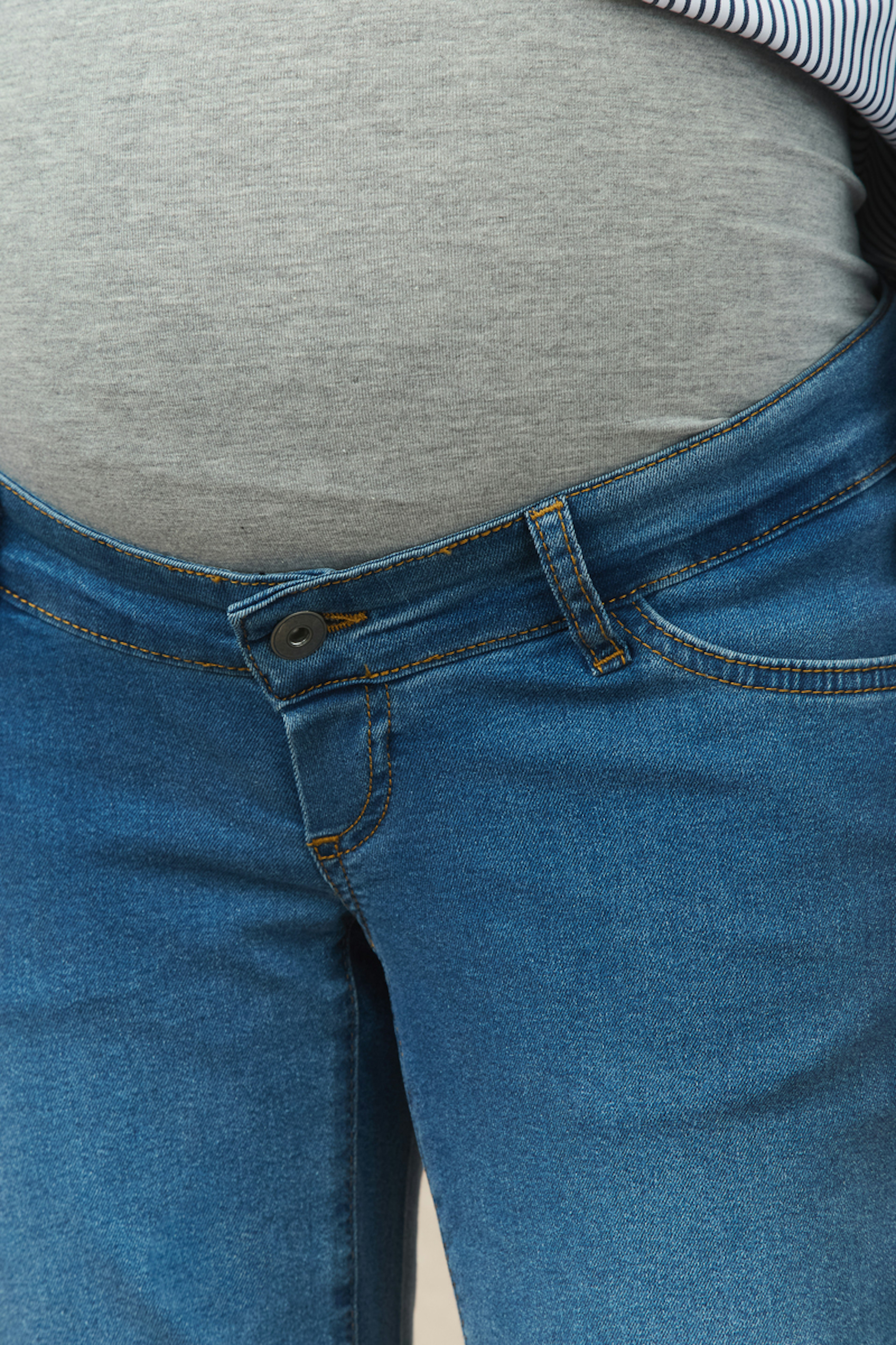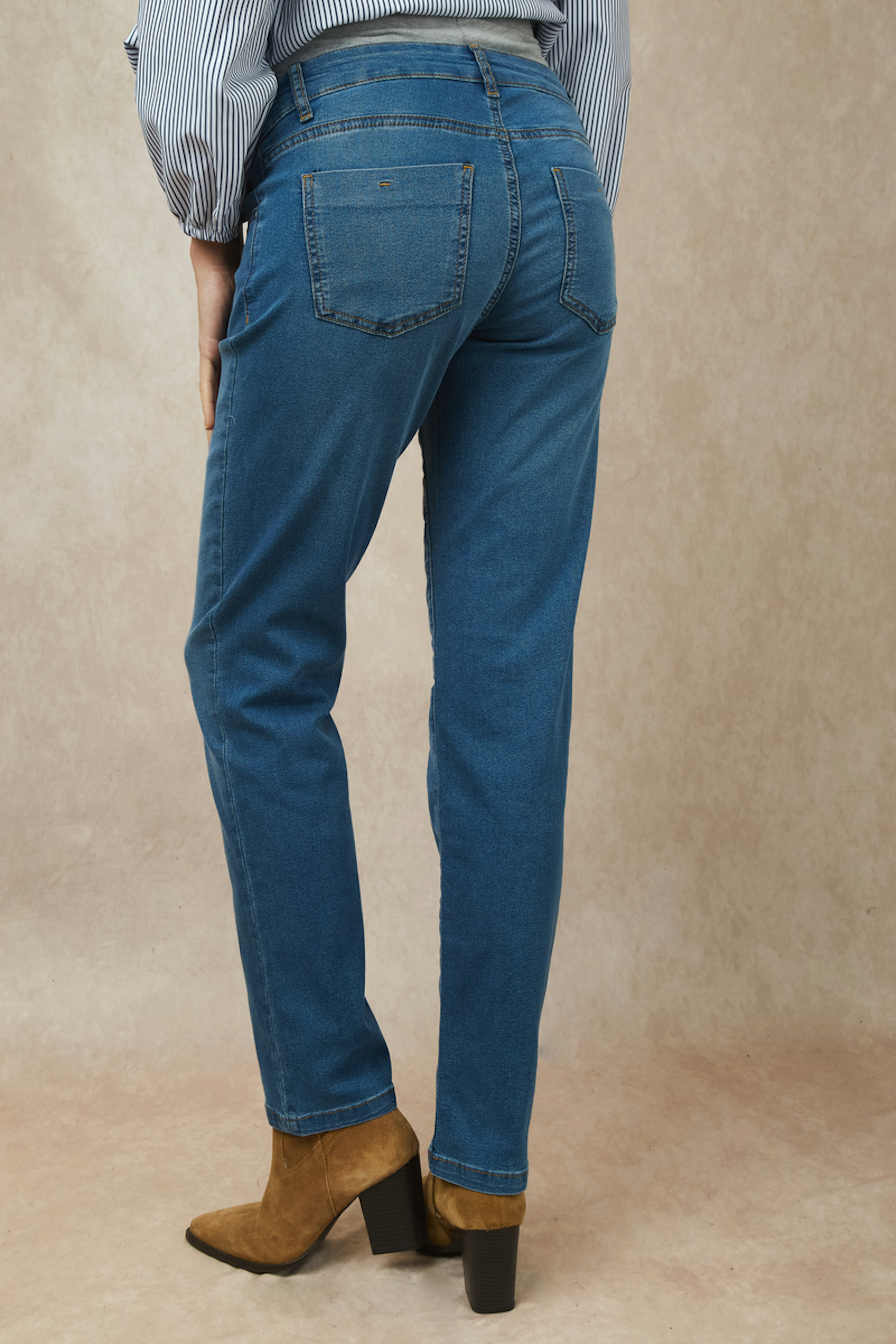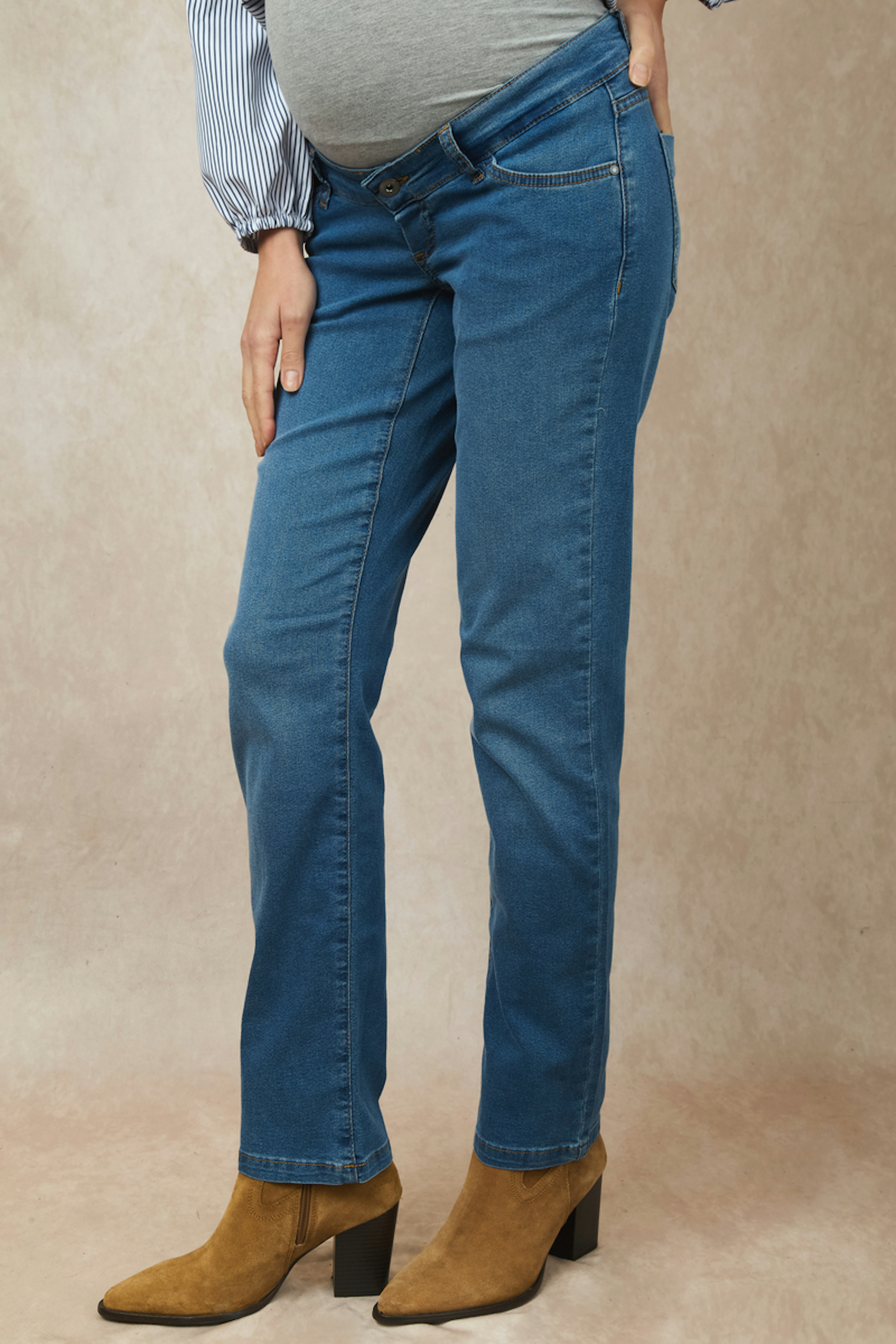 Associez ce jean avec un pull douillet et des bottines pour un style confortable et chic en hiver. • Jean maternité • Coupe droite • Ceinture élastique • Bleu denim • Détail poches avant