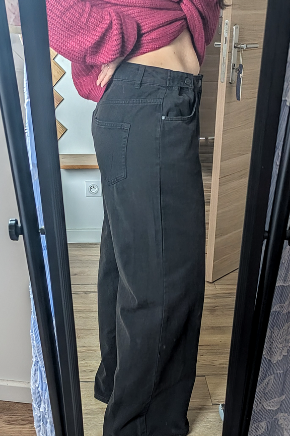 “Jean large mais bien ajusté à la taille, très confortable.”