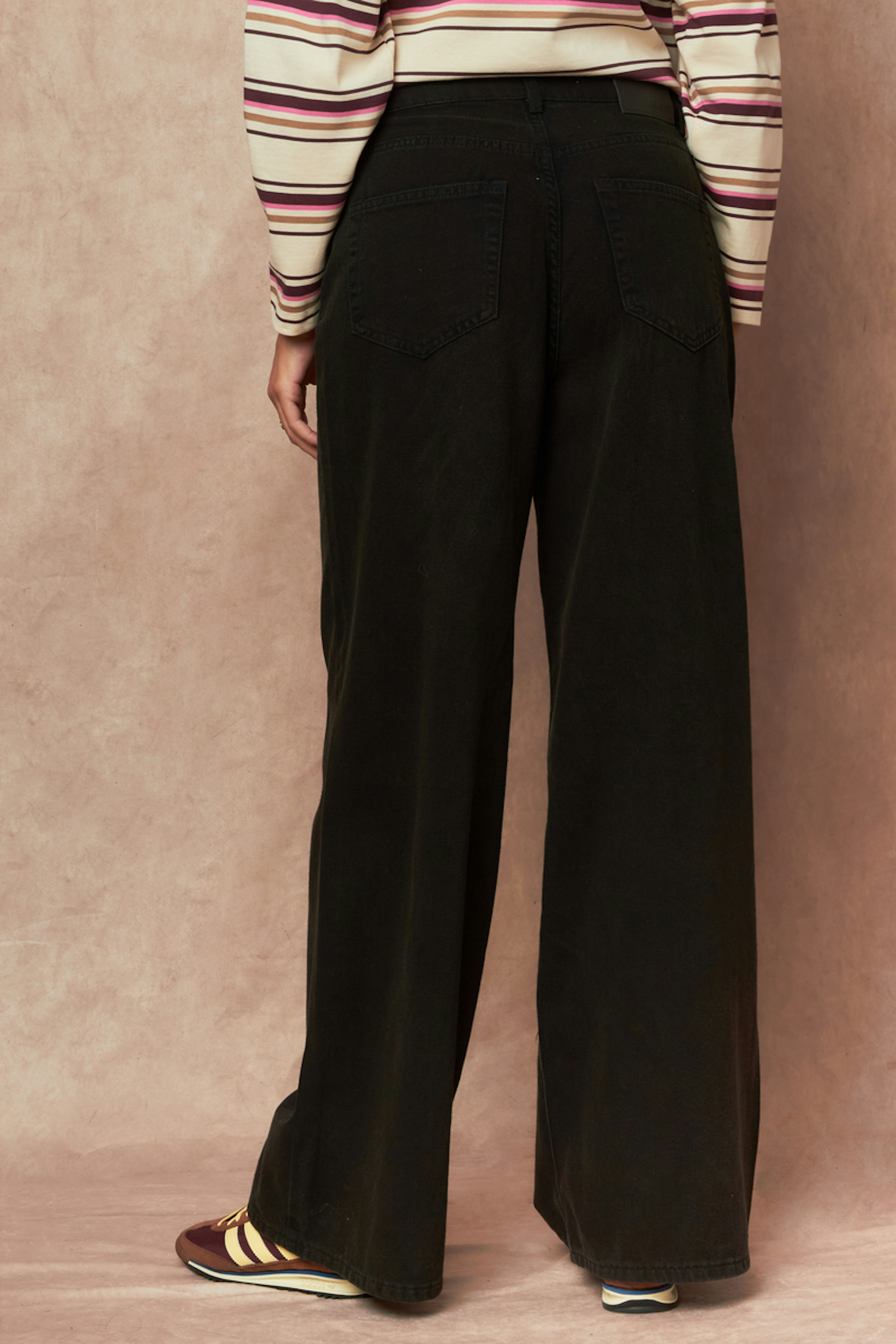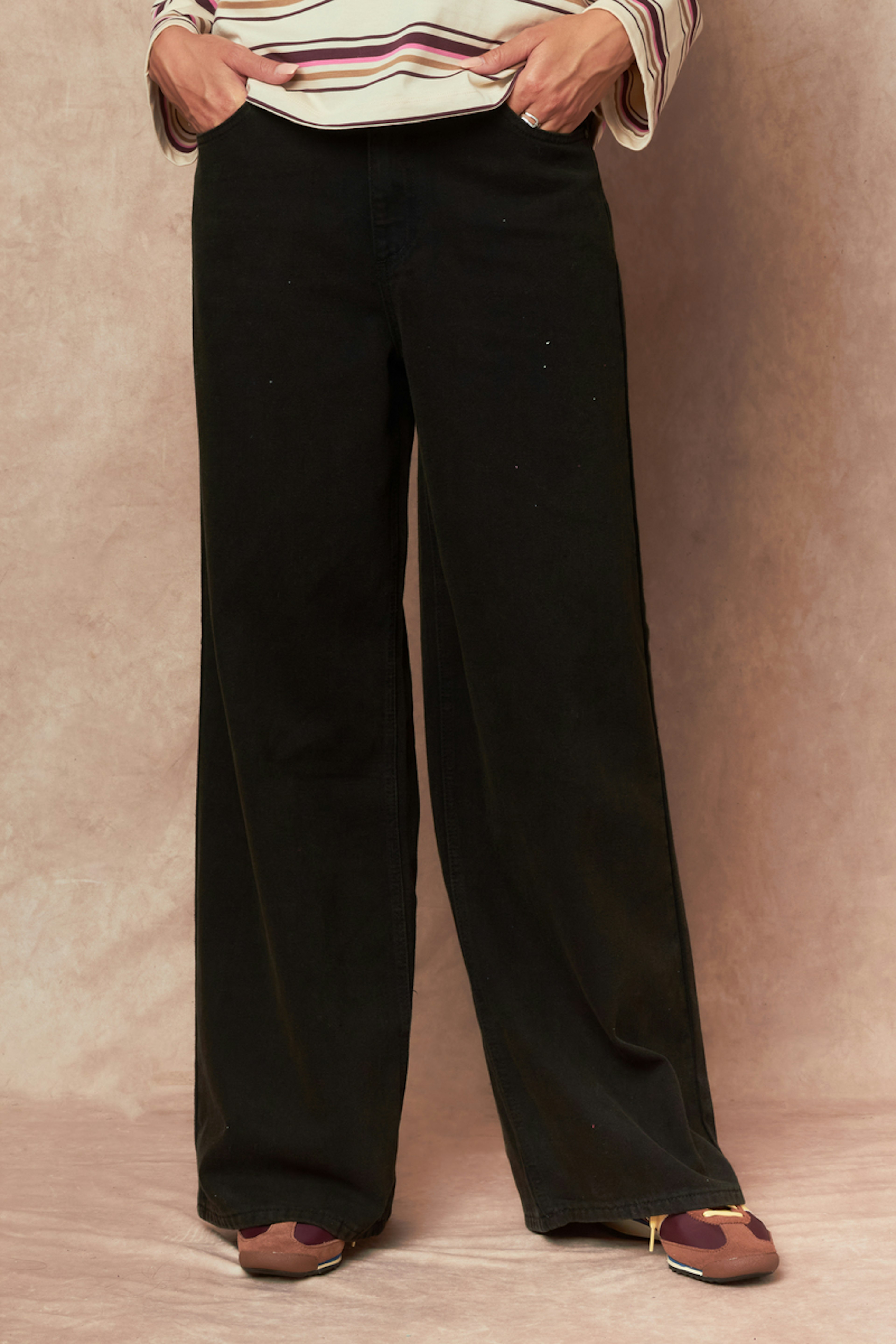 Associez ce jean ample noir à un haut ajusté pour créer une silhouette équilibrée et moderne. Complétez avec des baskets minimalistes pour une allure urbaine et stylée. • Jeans large en coton • Coupe wide leg • Taille haute féminine • Jambes longues amples • Noir classique intemporel