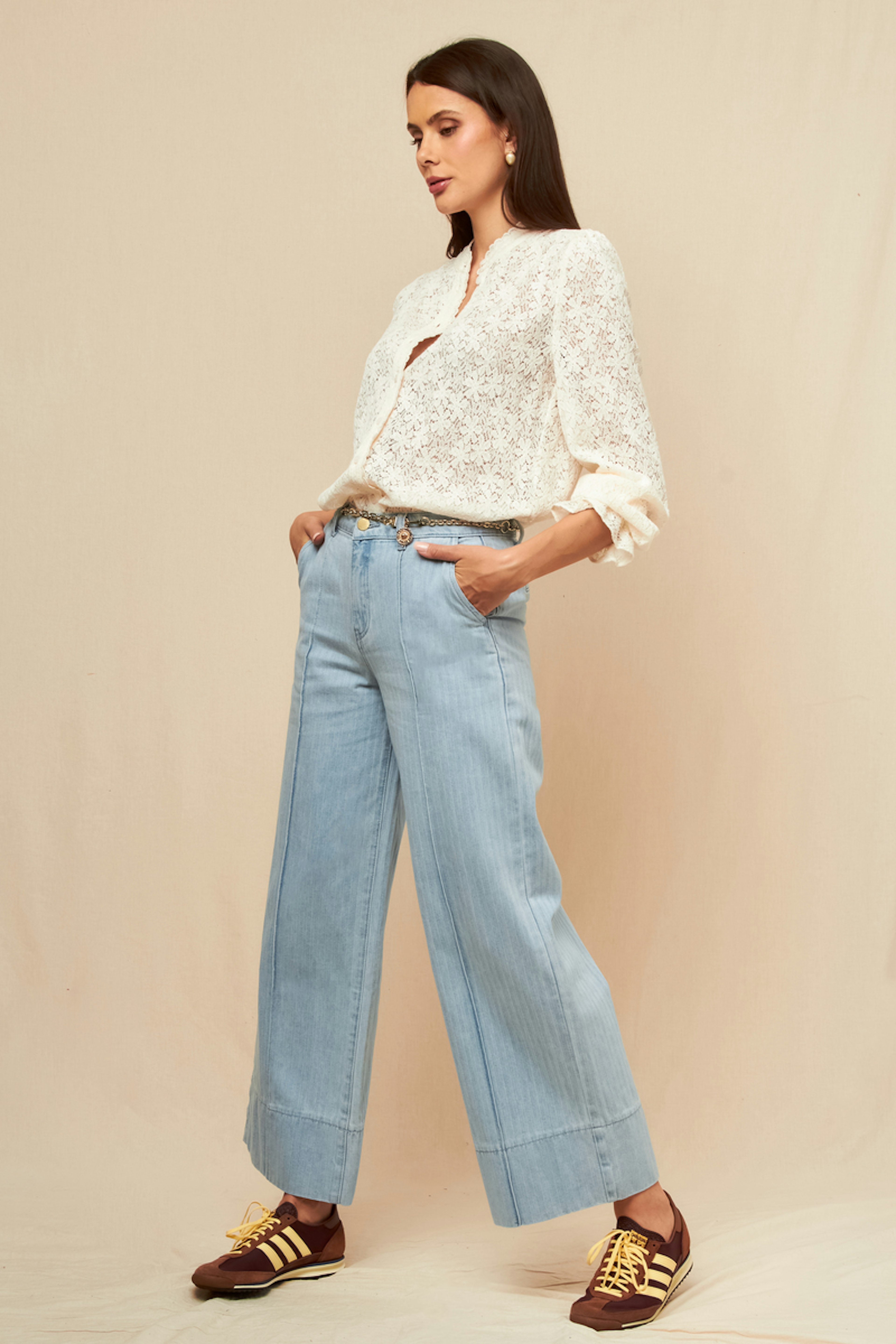 Associez ce jean avec un haut ajusté et des accessoires dorés pour un look chic et décontracté. Parfait en toute saison. • Pantalon en coton • Taille haute flatteuse • Coupe droite élégante • Longueur cheville moderne • Délicat motif à fines rayures