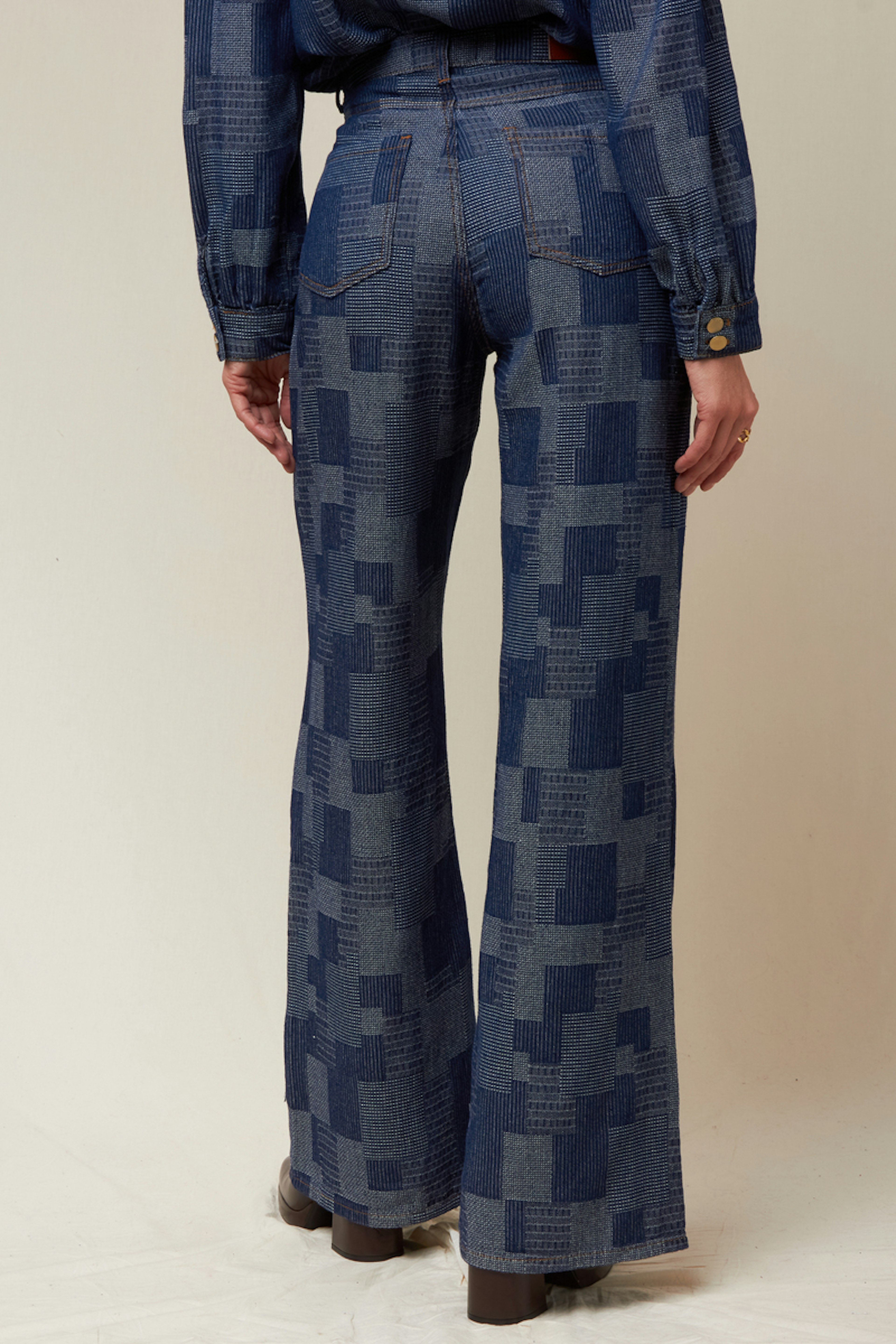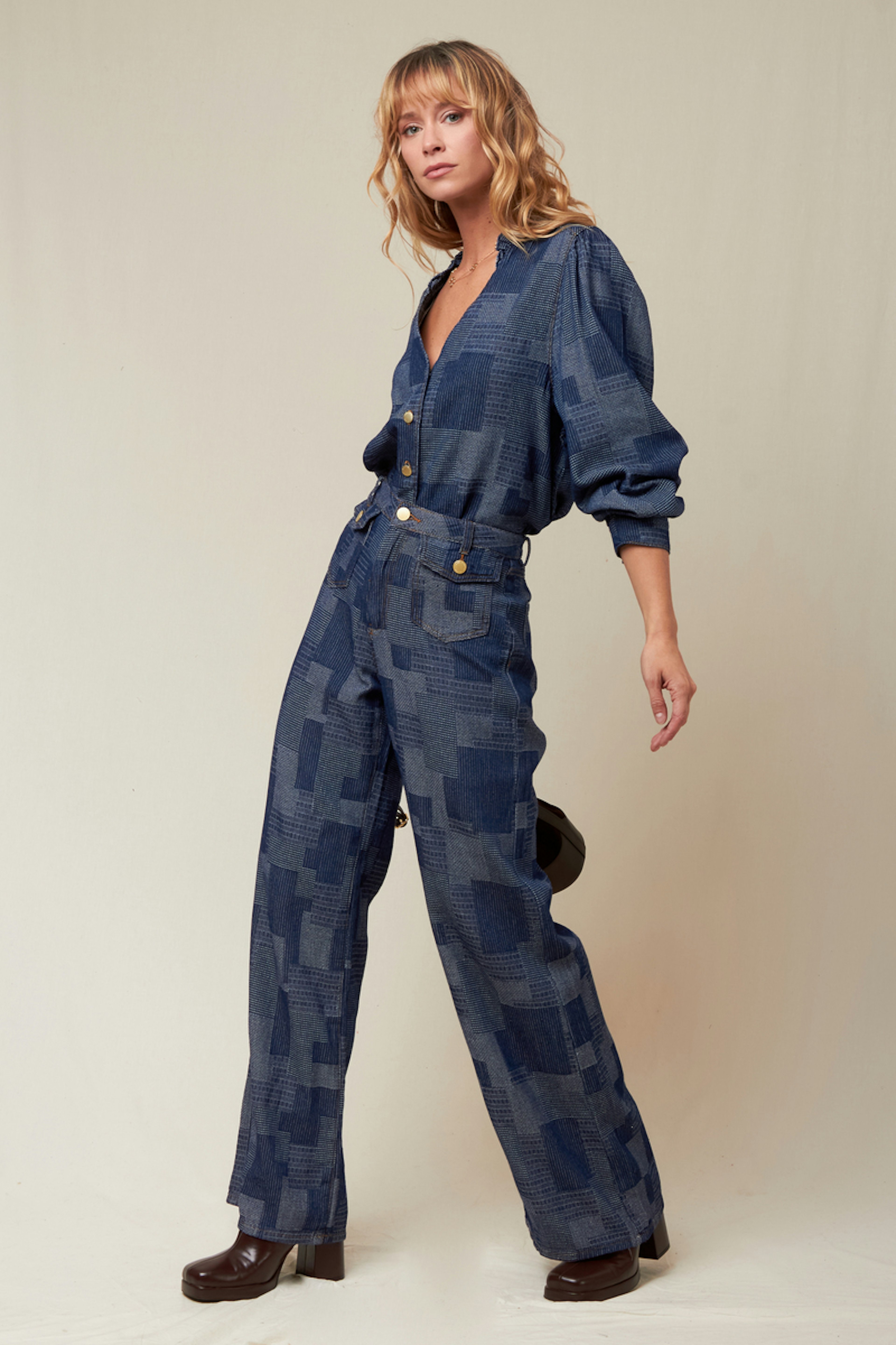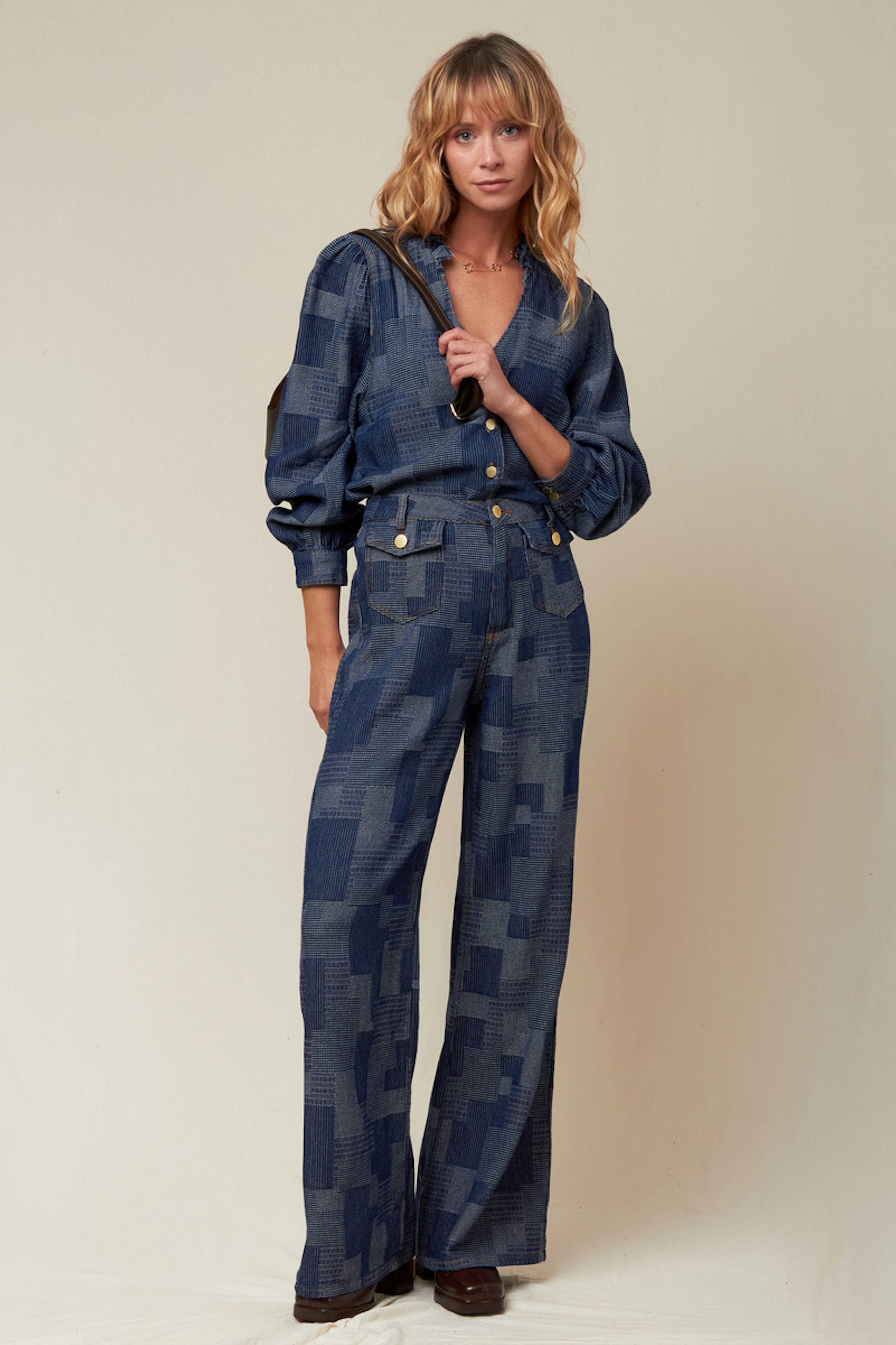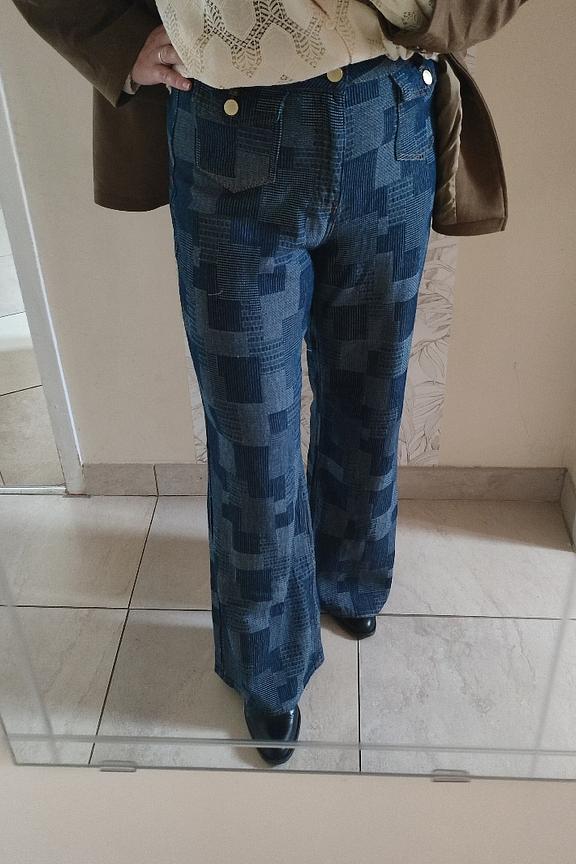 Associez ce jean à un pull ajusté et des bottines pour un look chic. Parfait en toute saison. • Jean à motif patchwork • Coupe large et fluide • Taille haute flatteuse • Ourlets longs • Texture en coton doux