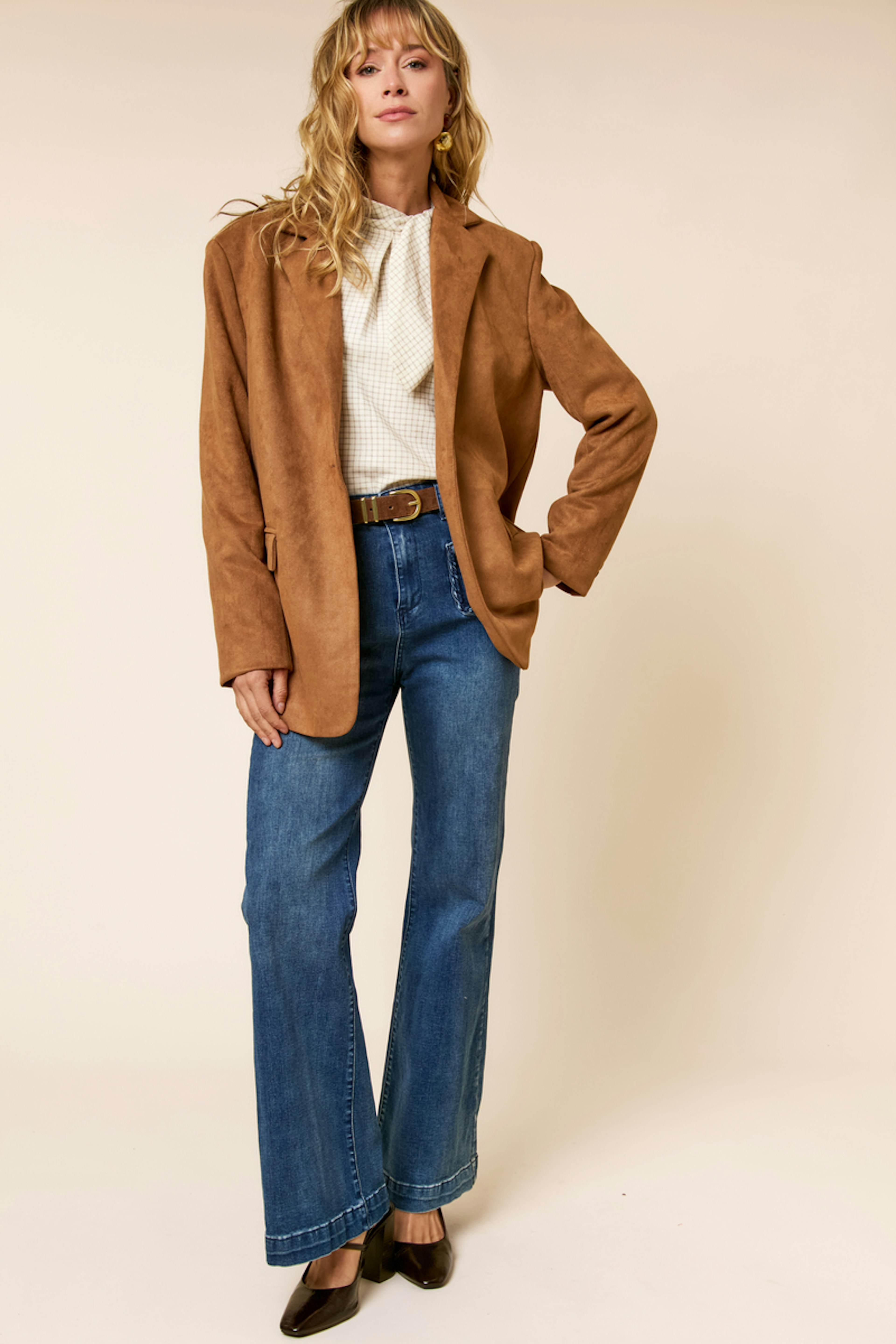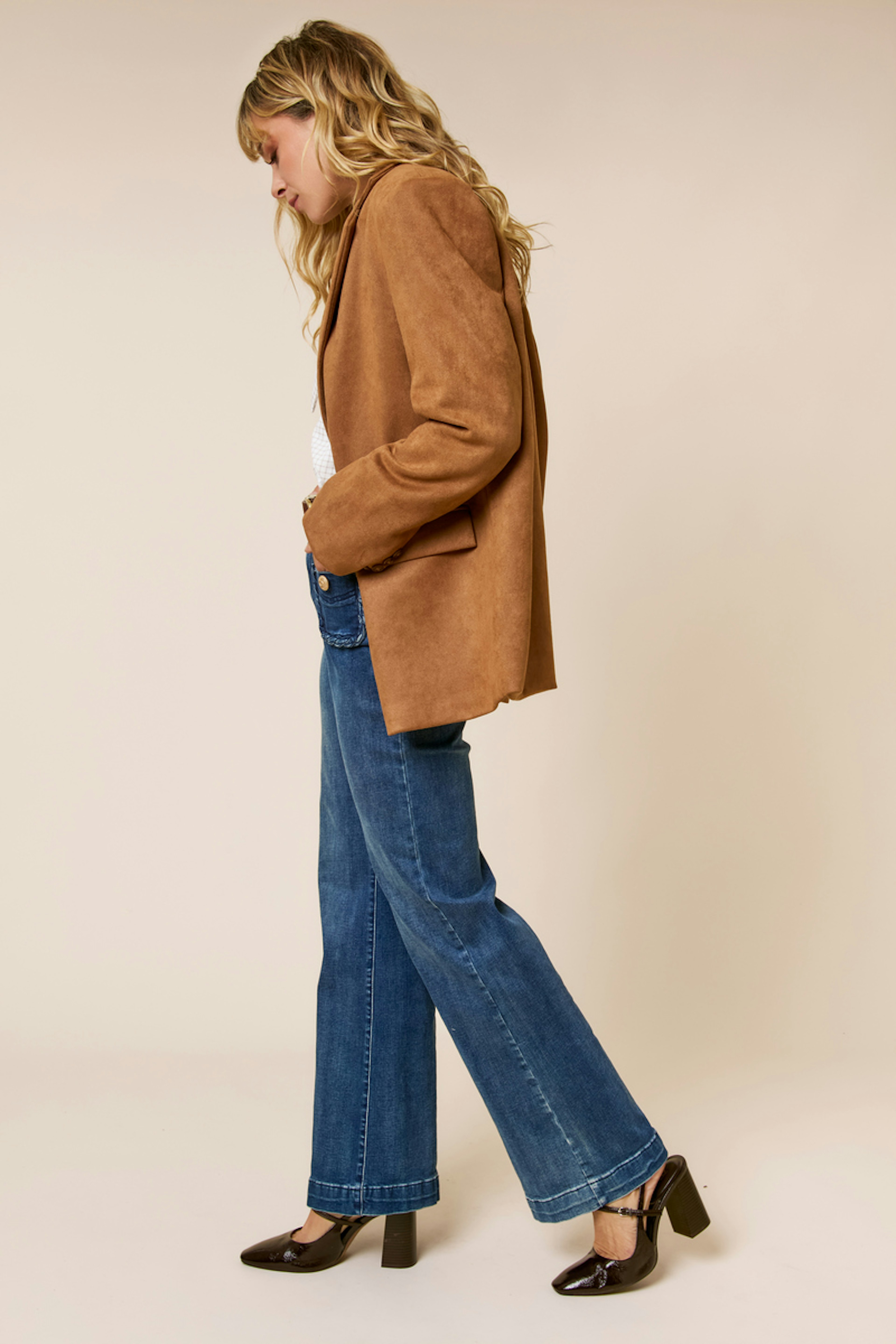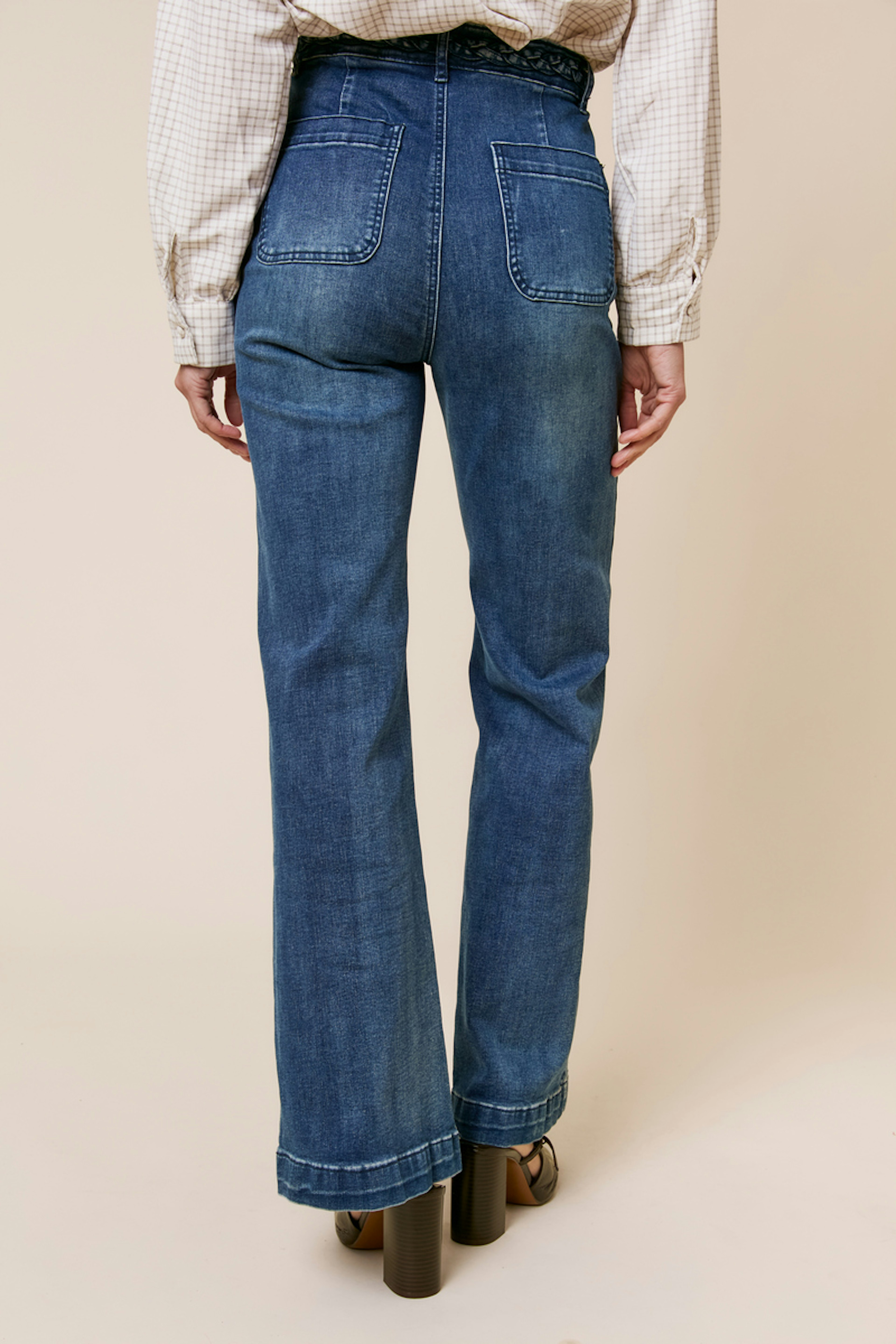 Associez ce jean à des bottines et une blouse légère pour un look chic et décontracté, parfait pour toutes les saisons. • Jean flare • Taille haute flatteuse • Large au niveau des jambes • Poches plaquées • Fermeture à bouton doré
