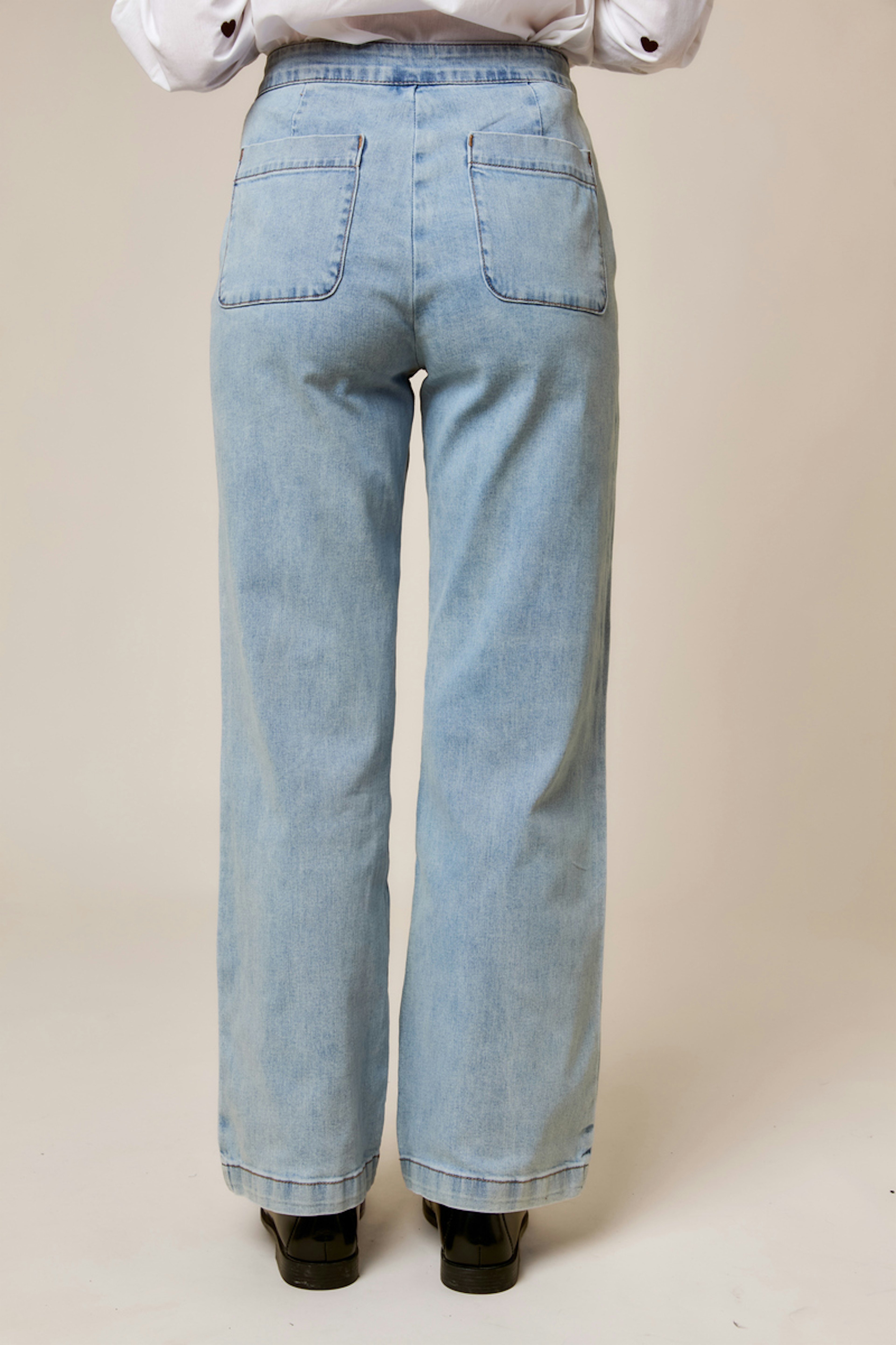 Complétez ce jean avec une blouse fluide et des talons pour une allure chic et décontractée. Parfait en toute saison. • Jean wide leg • Coupe large et ample • Taille haute flatteuse • Détails de boutons dorés • Denim bleu lumineux