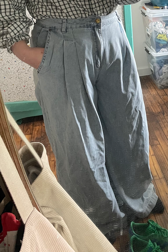 Associez ce jean à une blouse fluide et des sandales pour un look estival décontracté. • Jean large en coton • Taille haute flatteuse • Jambes larges et fluides • Pliés pour une touche sophistiquée • Bleu clair idéal pour l'été