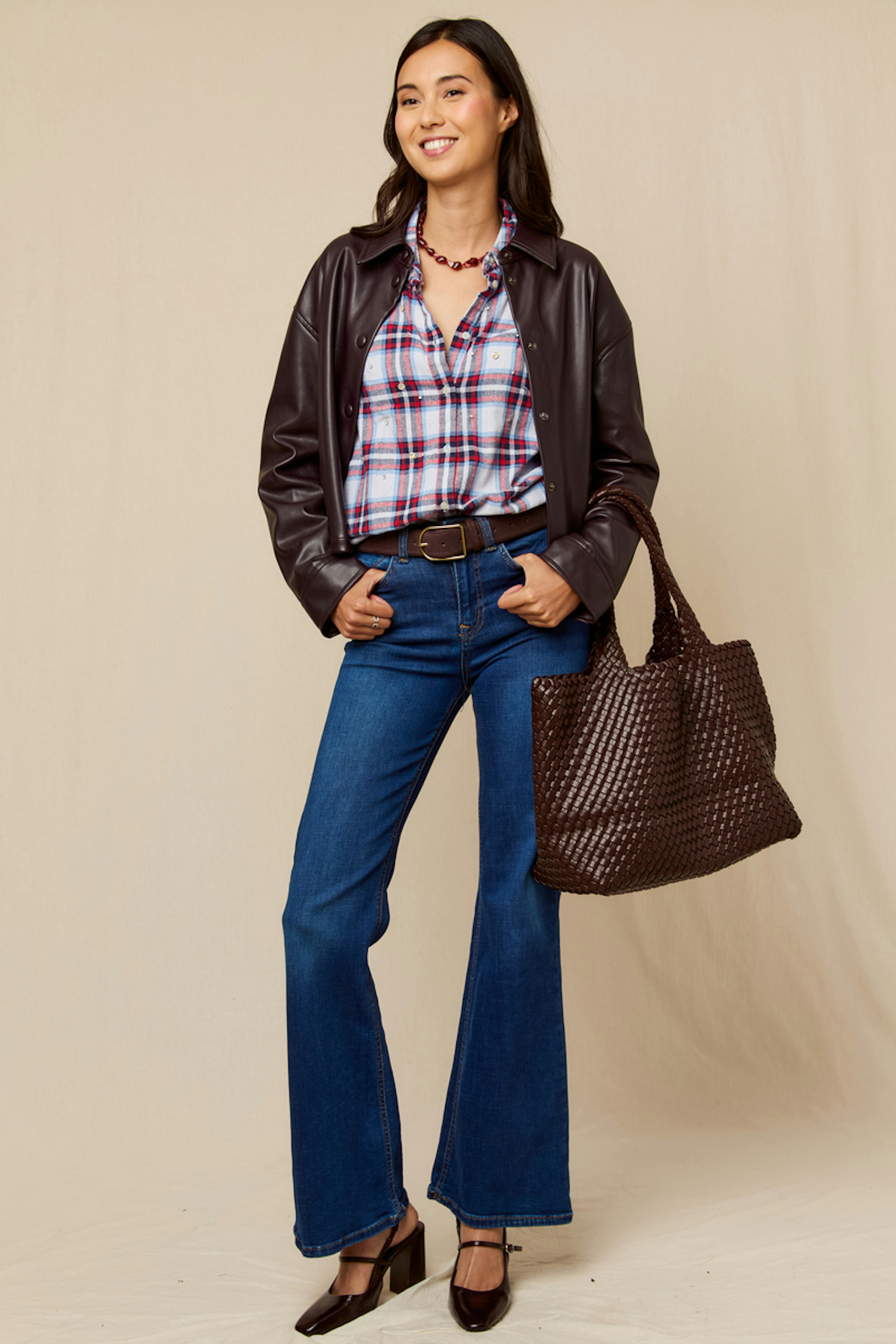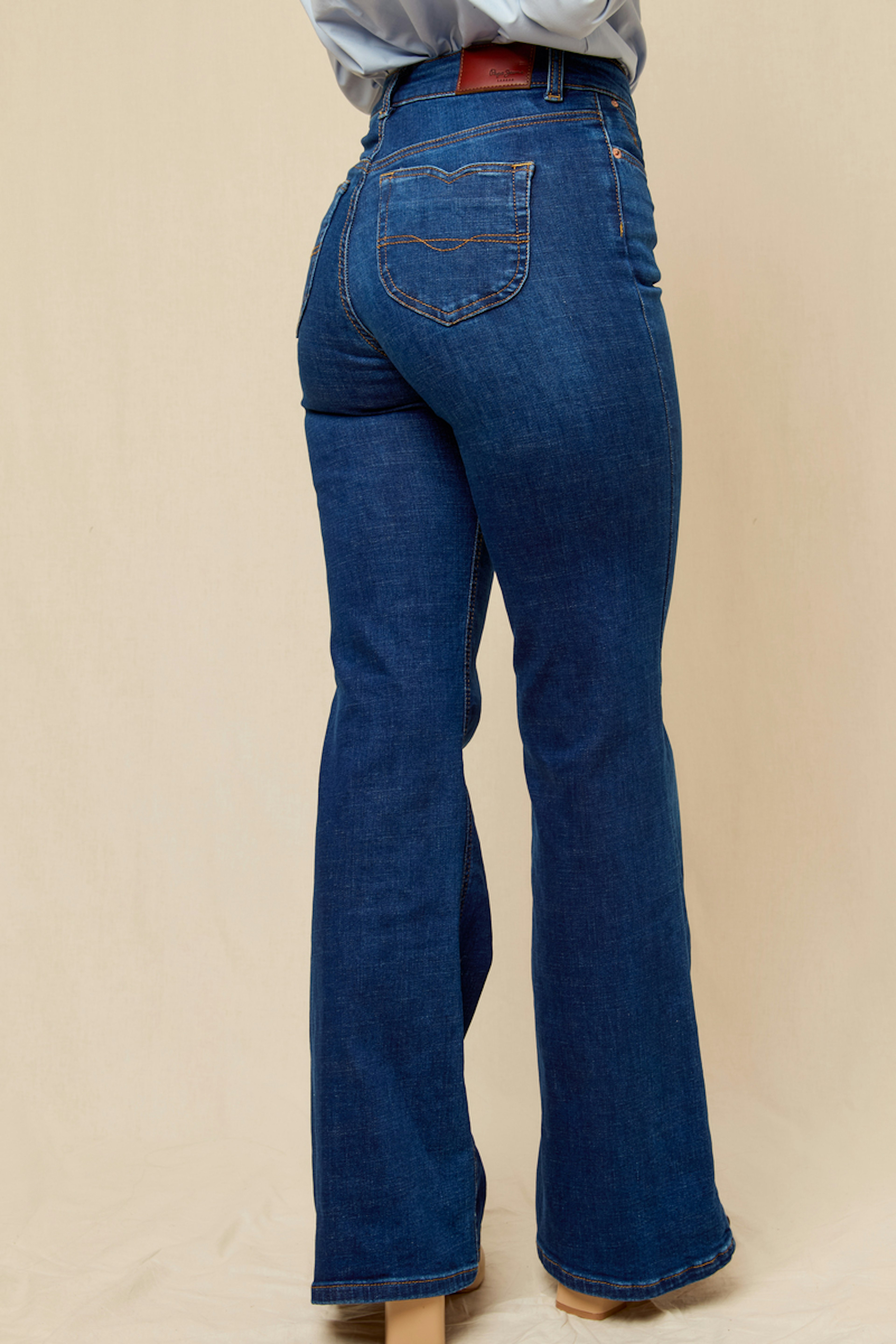 Pour un style chic, associez ce jean avec des escarpins et un haut en soie. Un blazer structuré complétera parfaitement ce look. • Jean flare • Jambe évasée • Taille haute • Bleu classique • Détails discrets