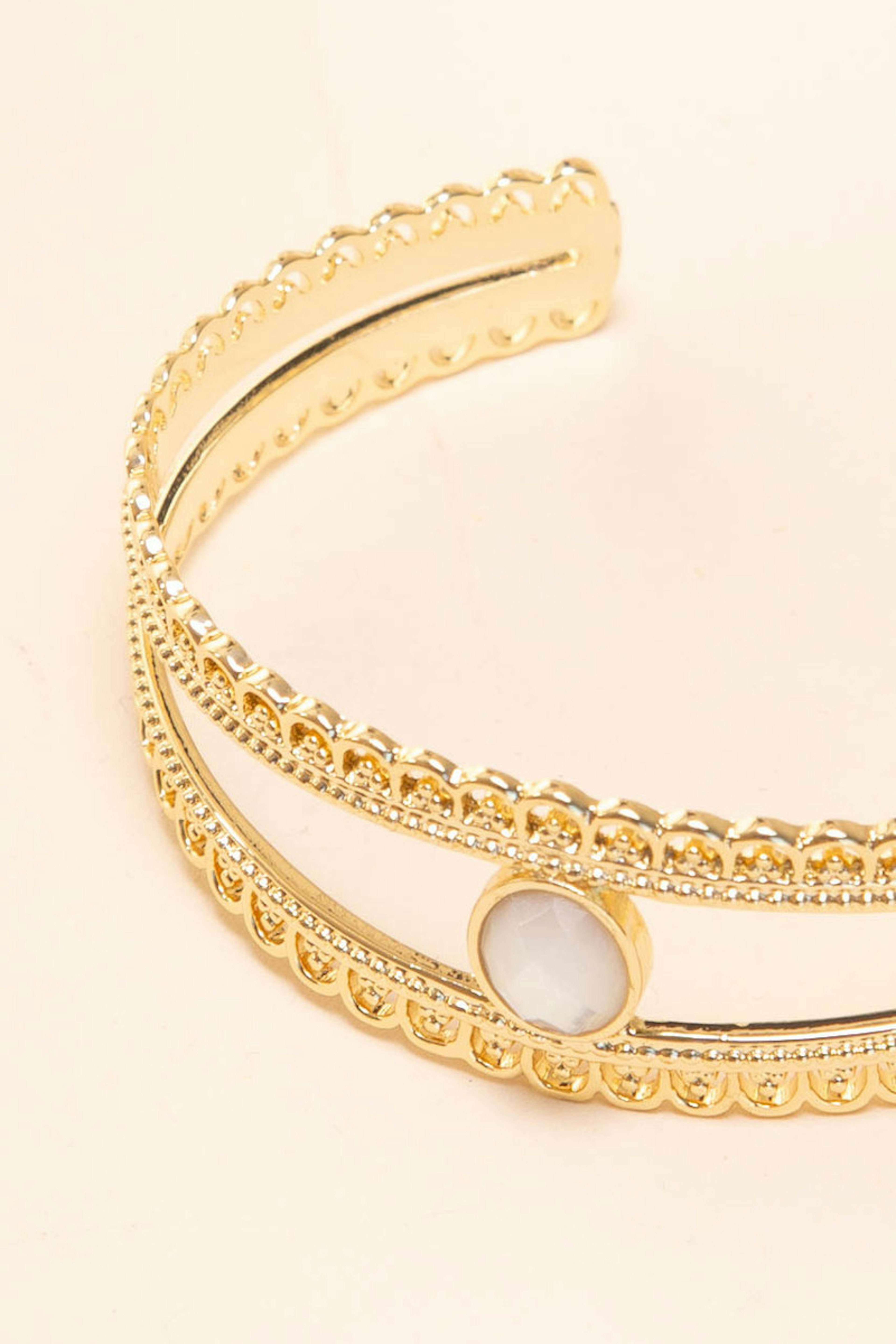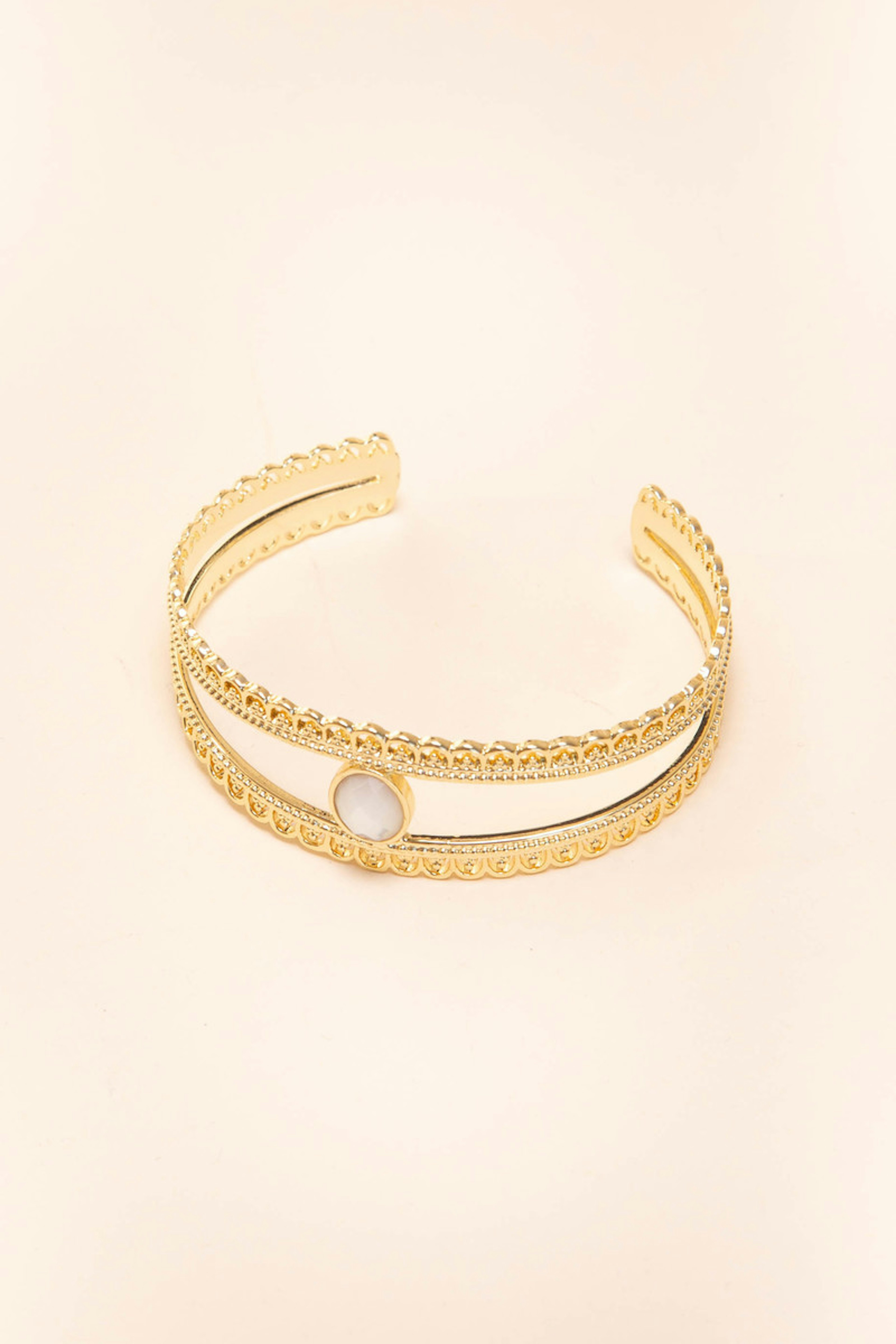 Cette manchette au design inspirรฉ de l'Orient habillera joliment votre poignet avec sa dรฉlicate pierre ronde facettรฉe. Emma & Chloรฉ propose des bijoux dessinรฉs et crรฉรฉs dans leur atelier parisien. La marque apporte une attention particuliรจre au design ainsi qu'au choix des matรฉriaux.