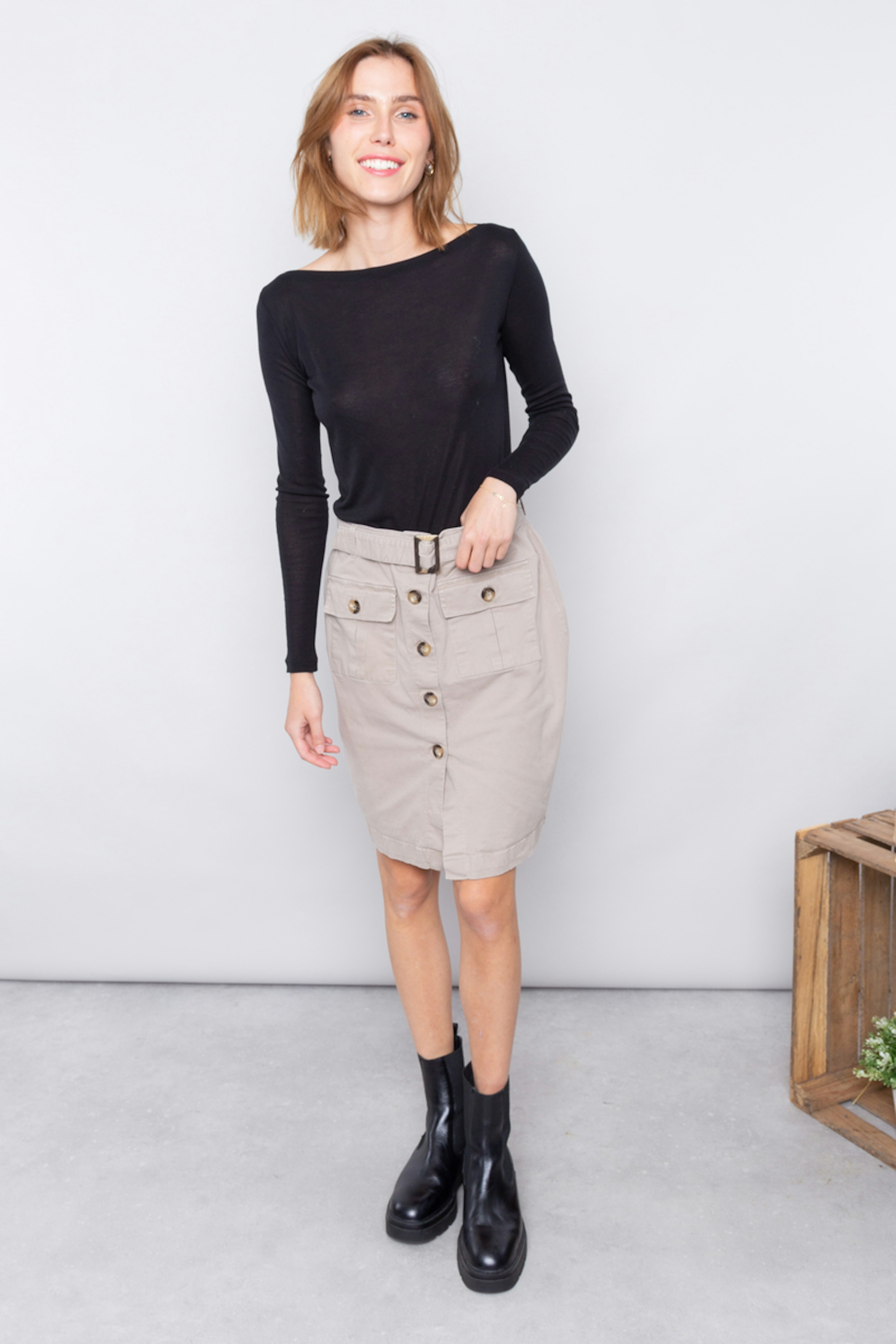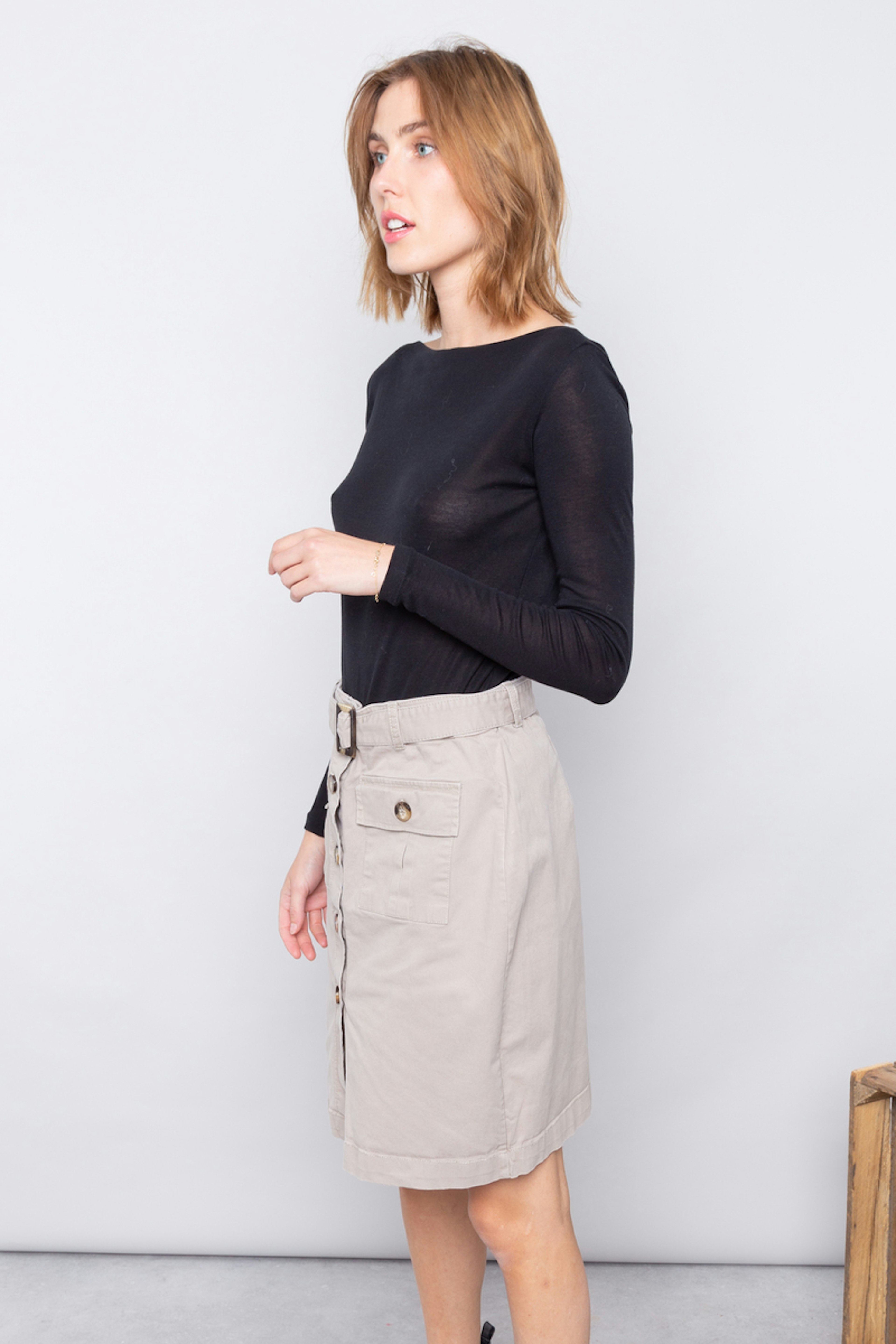 โ€ข Jupe mi-longue au-dessus des genoux โ€ข Couleur unie : beige โ€ข Ceinturรฉe โ€ข Ouverture boutonnรฉe tout le long de la devanture de la jupe โ€ข 2 poches sur la devanture โ€ข Petite feinte sur le devant en bas de jupe