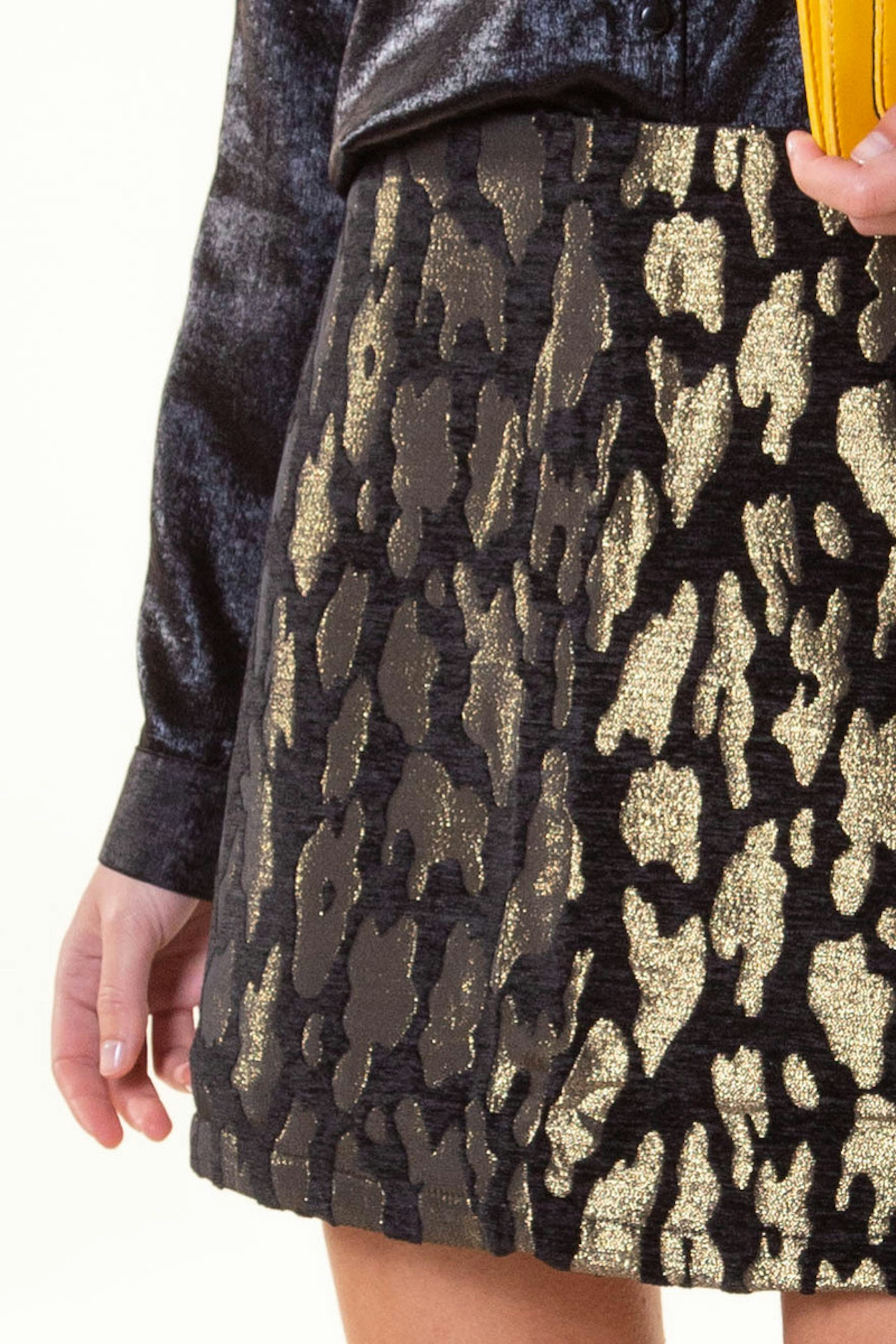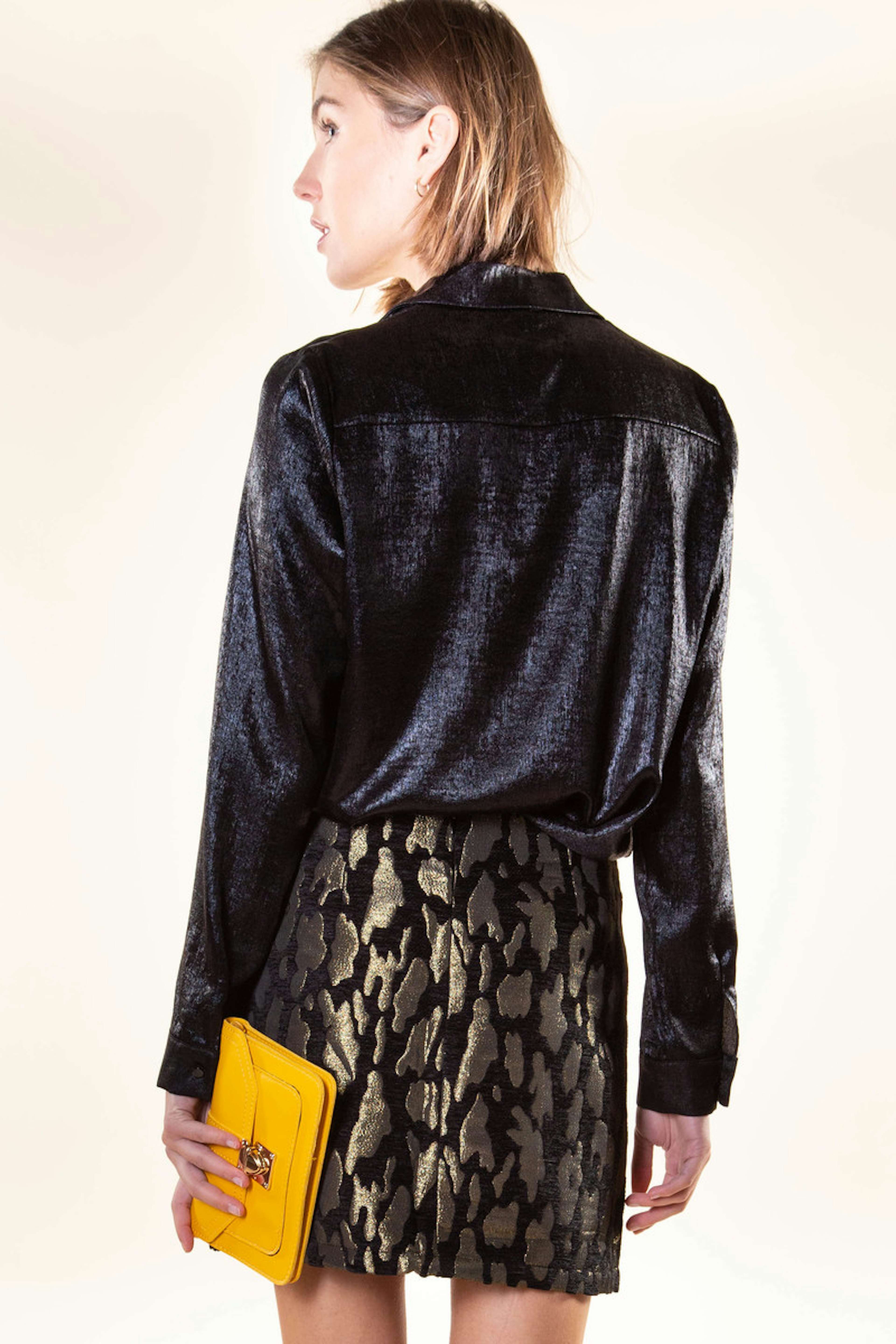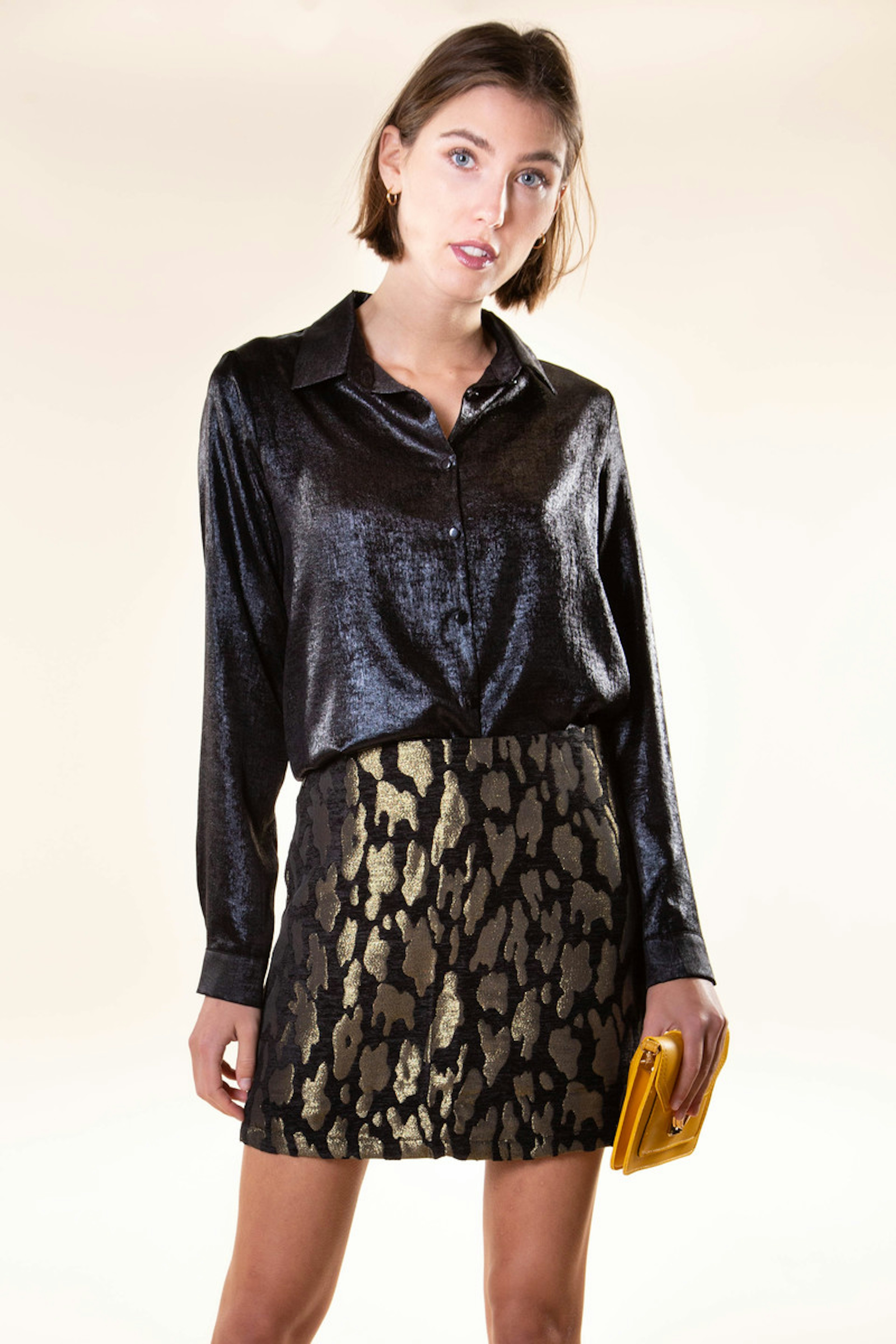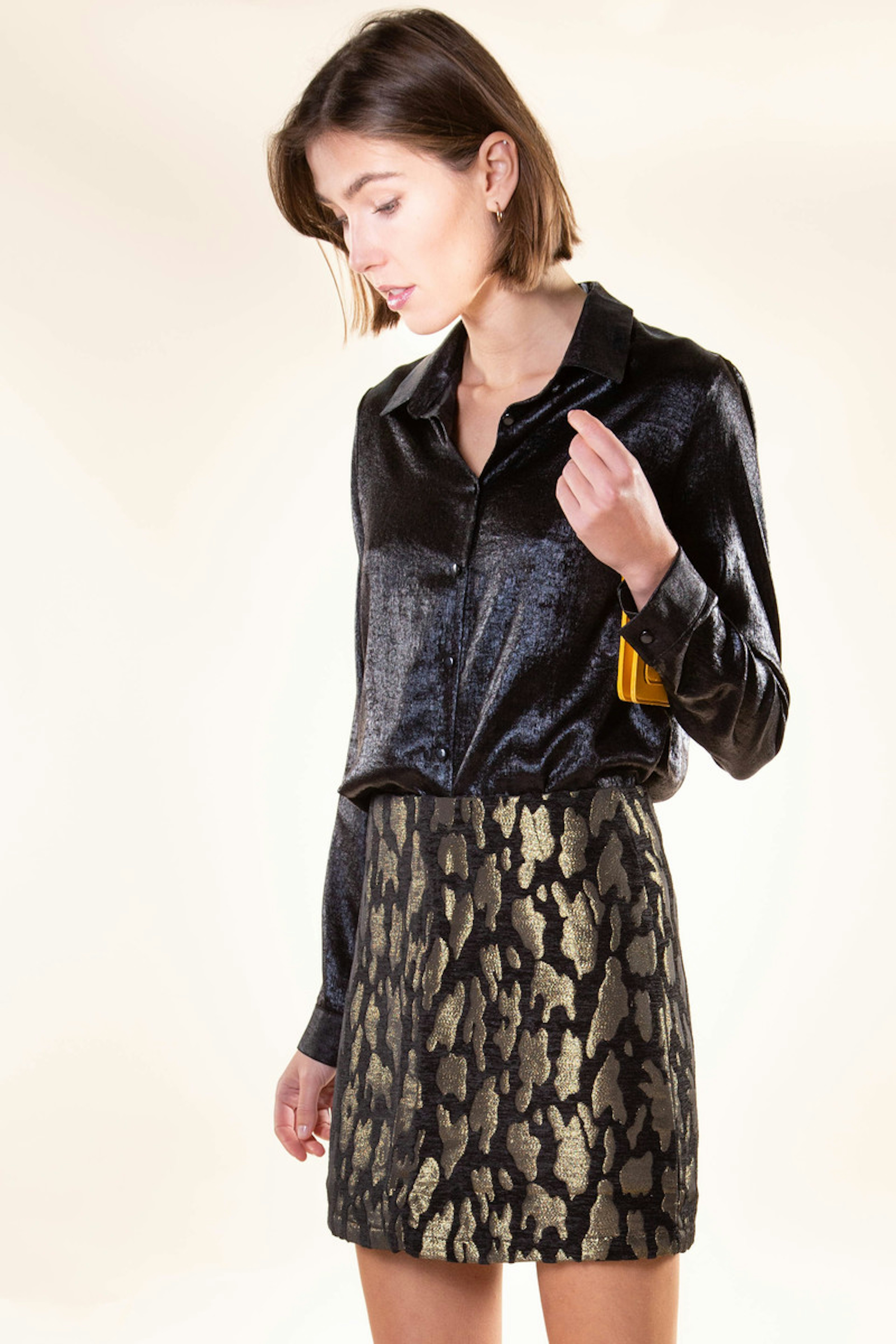 La mini jupe Aniston noir et dorรฉ est parfaite pour vos looks du soir ! Elle est assez courte, vous pouvez la porter avec ou sans collants.