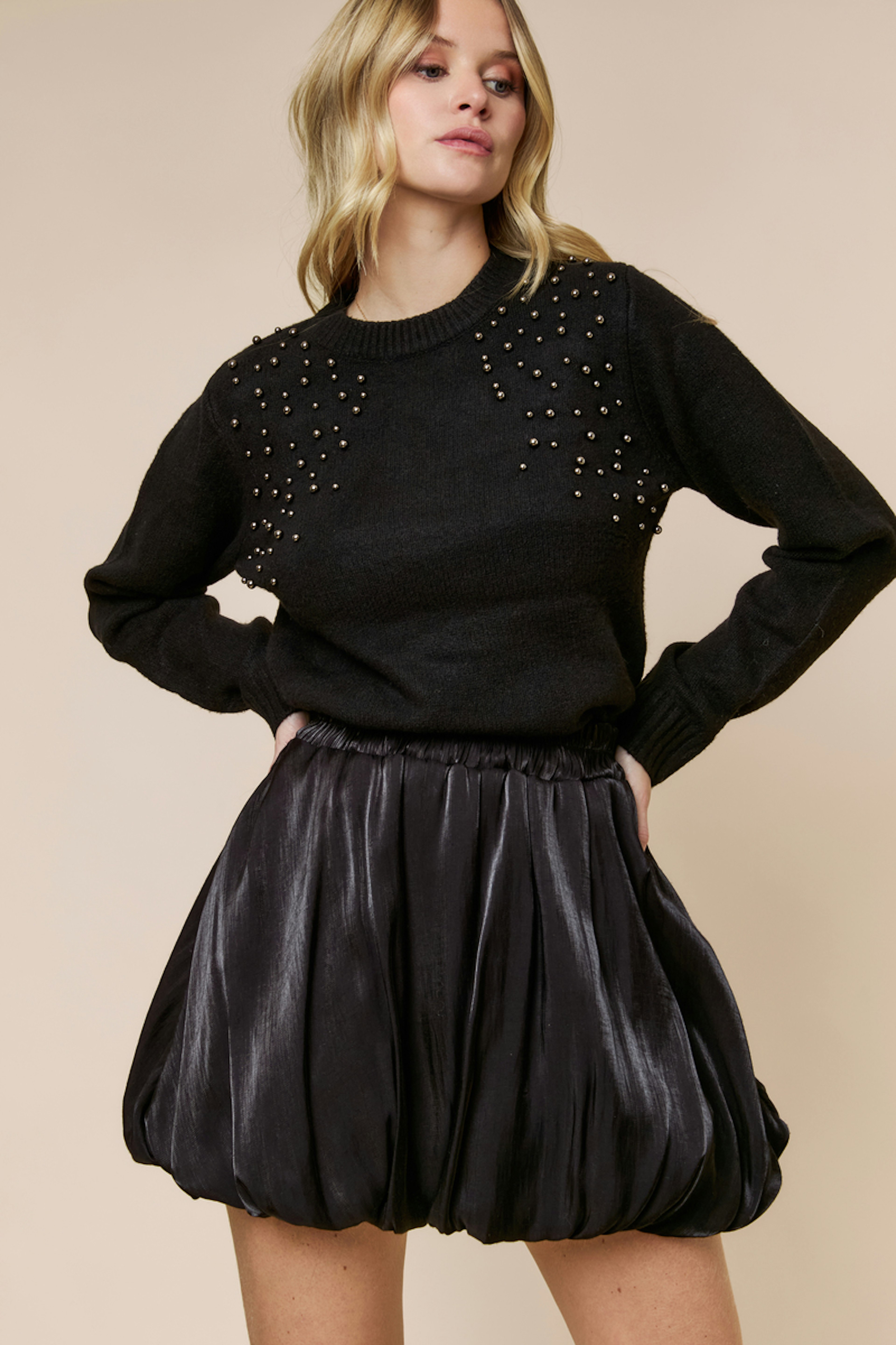 Pour un look chic et décontracté, associez cette jupe noire avec un pull en laine oversize et des bottes en daim. Parfaite pour les journées d'hiver. • Jupe courte • Taille élastique • Coupe bouffante • Ourlet resserré • Matière douce et fluide