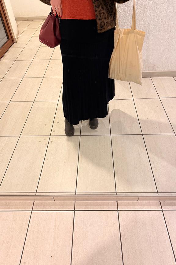 Portez cette jupe élégante avec un haut ajusté et des bottes à talons pour un look chic et intemporel, parfait en toute saison. • Jupe longue • Coupe fluide • Taille haute • Finitions côtelées • Couleur noire