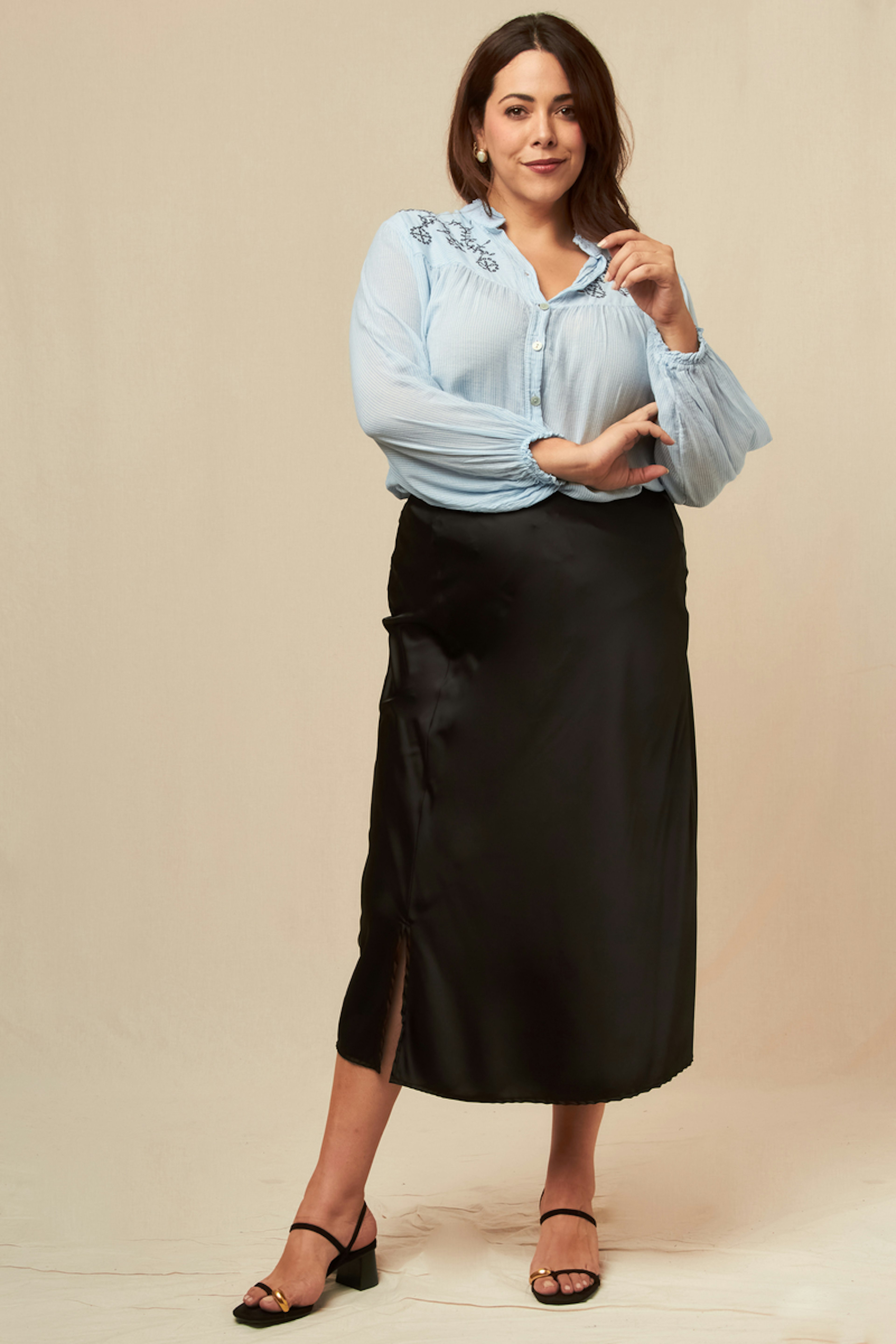Optez pour cette jupe satinée noire pour une touche d'élégance intemporelle. Associez-la avec un haut en dentelle crème et des escarpins pour une allure chic, ou avec un t-shirt graphique et des baskets pour une tenue décontractée. Parfait en toute saison. • Jupe satinée • Coupe midi • Taille haute élastique • Fente latérale