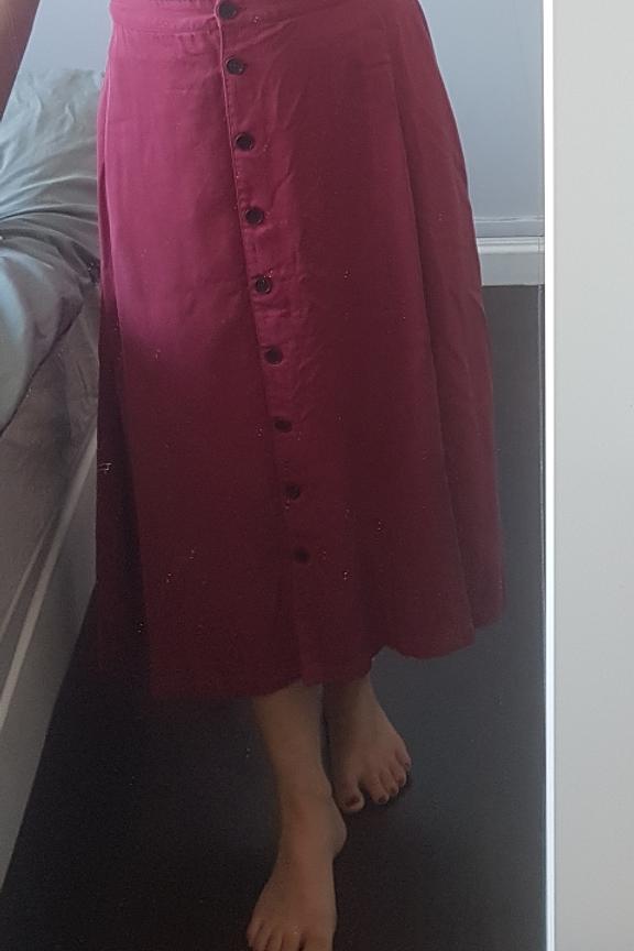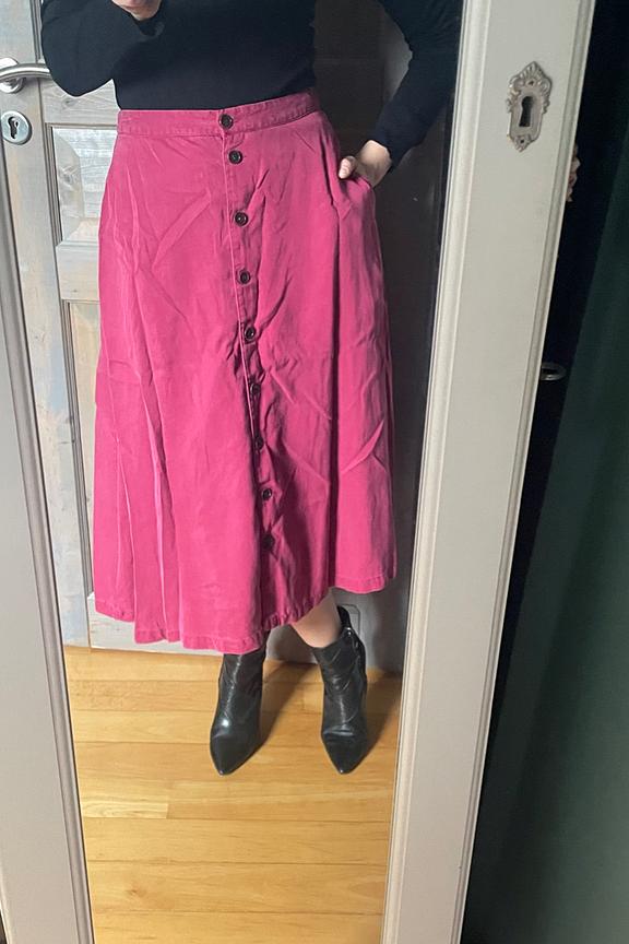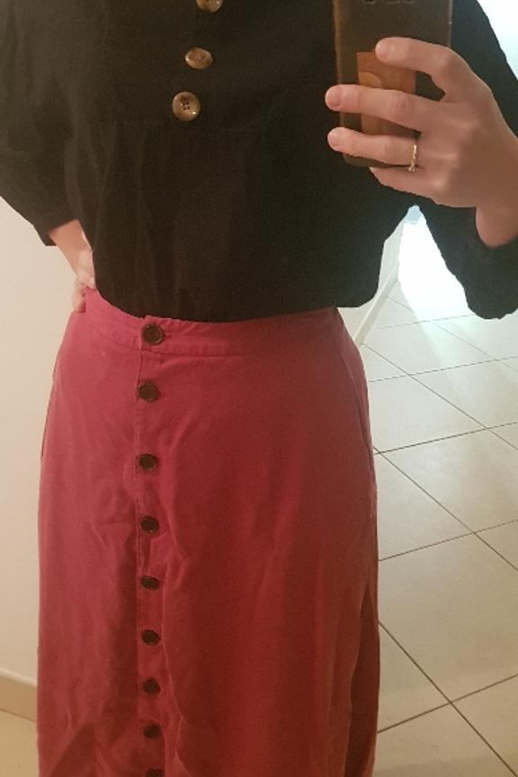 โ€ข Jupe mi-longue au-dessous du genou couleur rose fushia โ€ข Boutonnรฉe sur la devanture โ€ข Poches latรฉrales