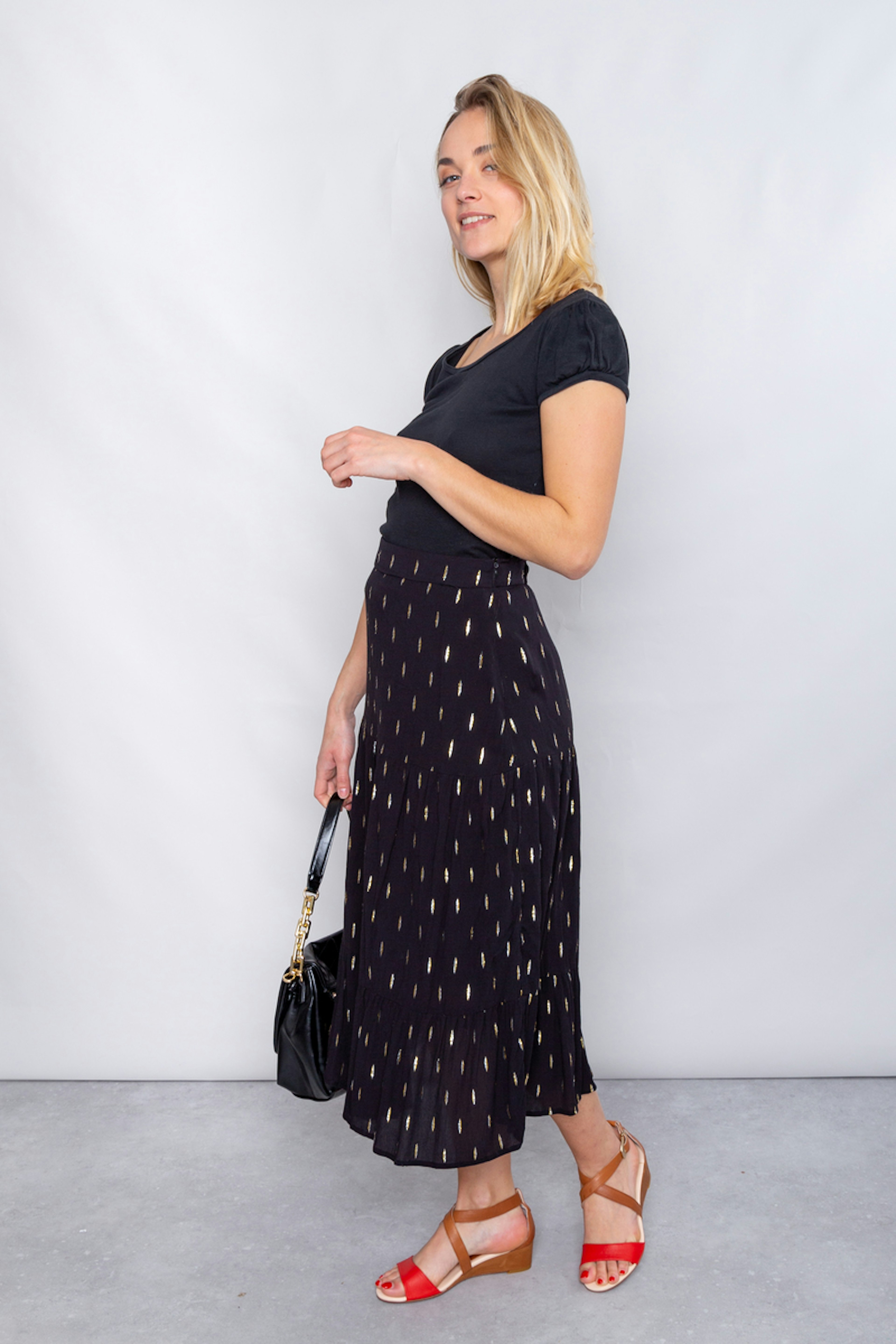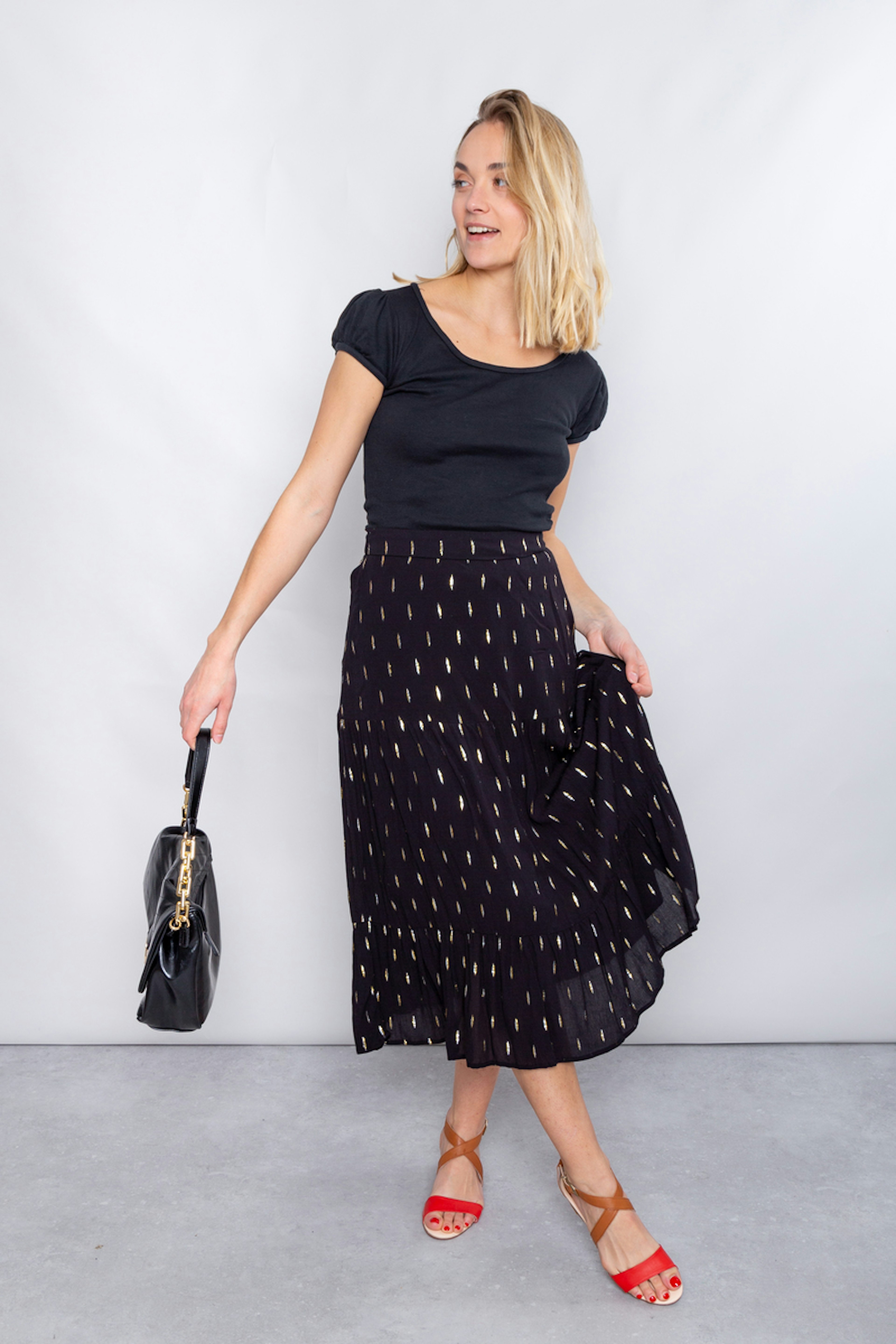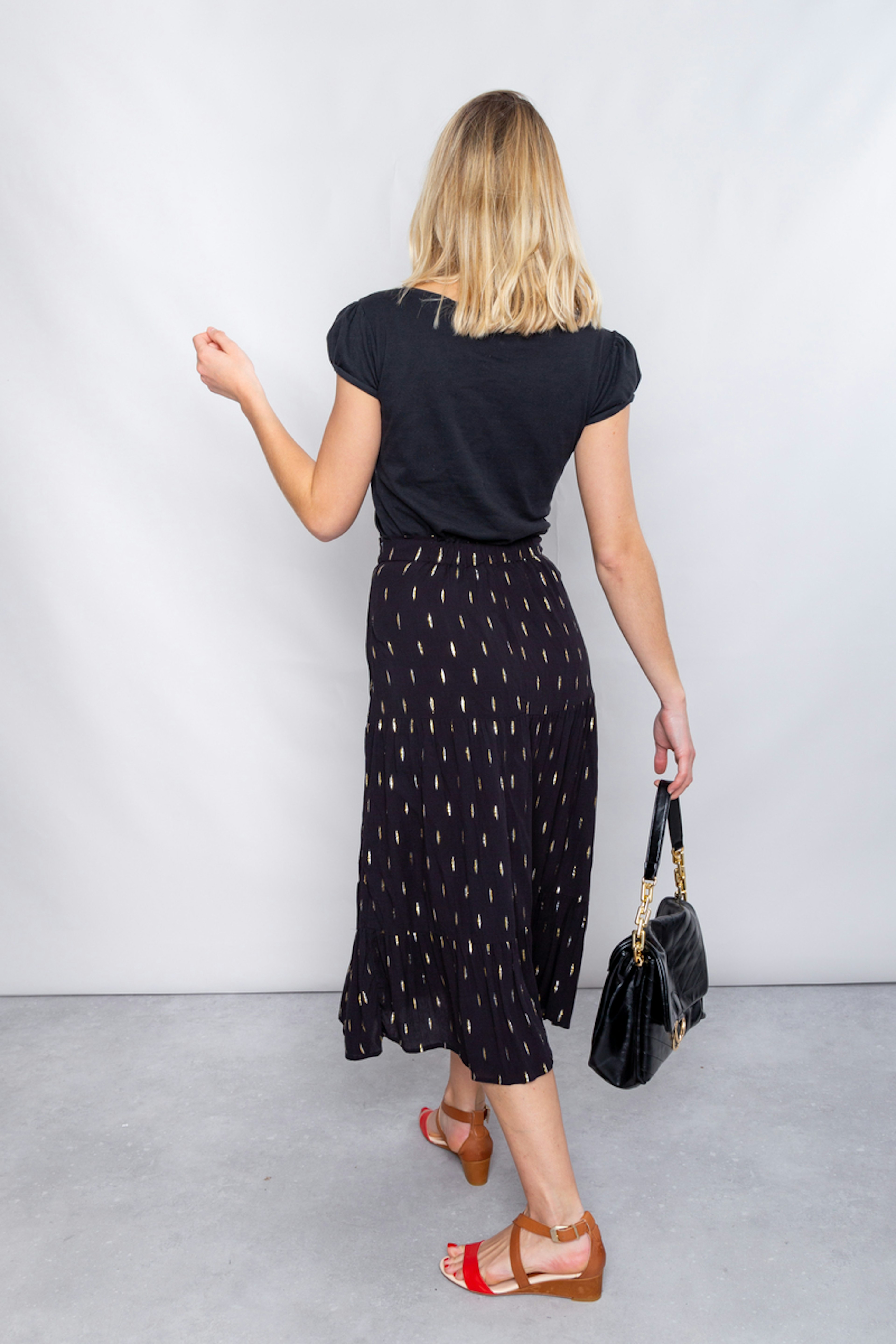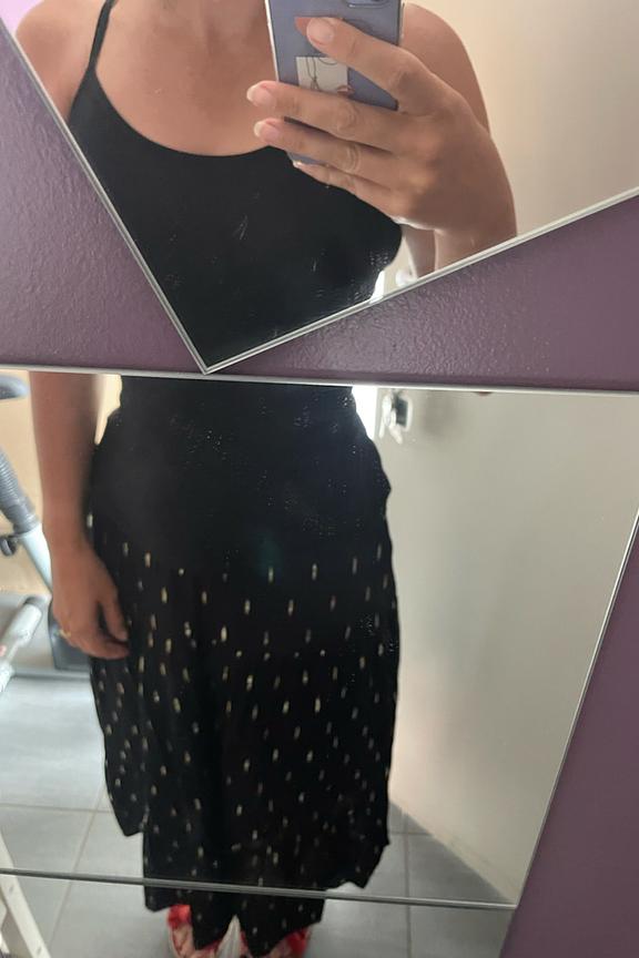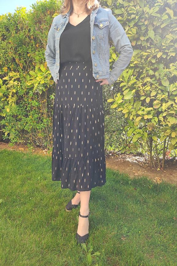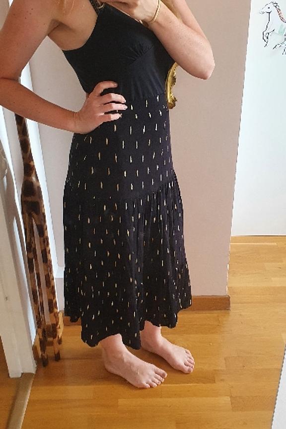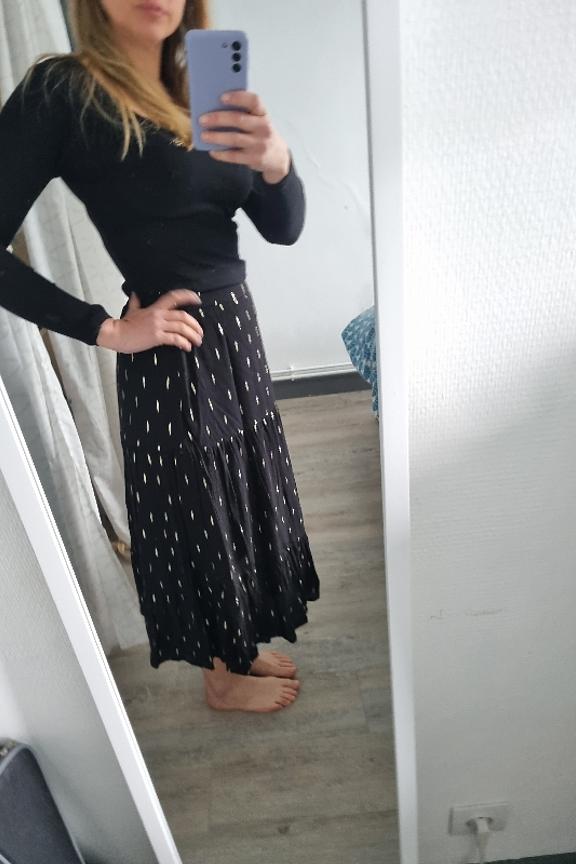 โข Jupe bohรจme midi รฉvasรฉe noire โข Ceinture รฉlastiquรฉe โข Tissu en viscose avec dรฉtails dorรฉs โข A porter avec de jolies sandales