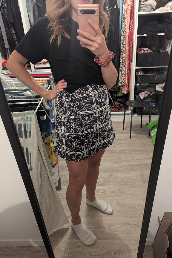 Associez cette jupe imprimée avec un simple t-shirt blanc et des bottes en daim pour un look décontracté mais élégant. Ajoutez un chapeau de paille pour une touche bohème estivale ou un cardigan moelleux pour les jours plus frais. Parfait en toute saison ! • Jupe courte • Coupe portefeuille • Motif imprimé