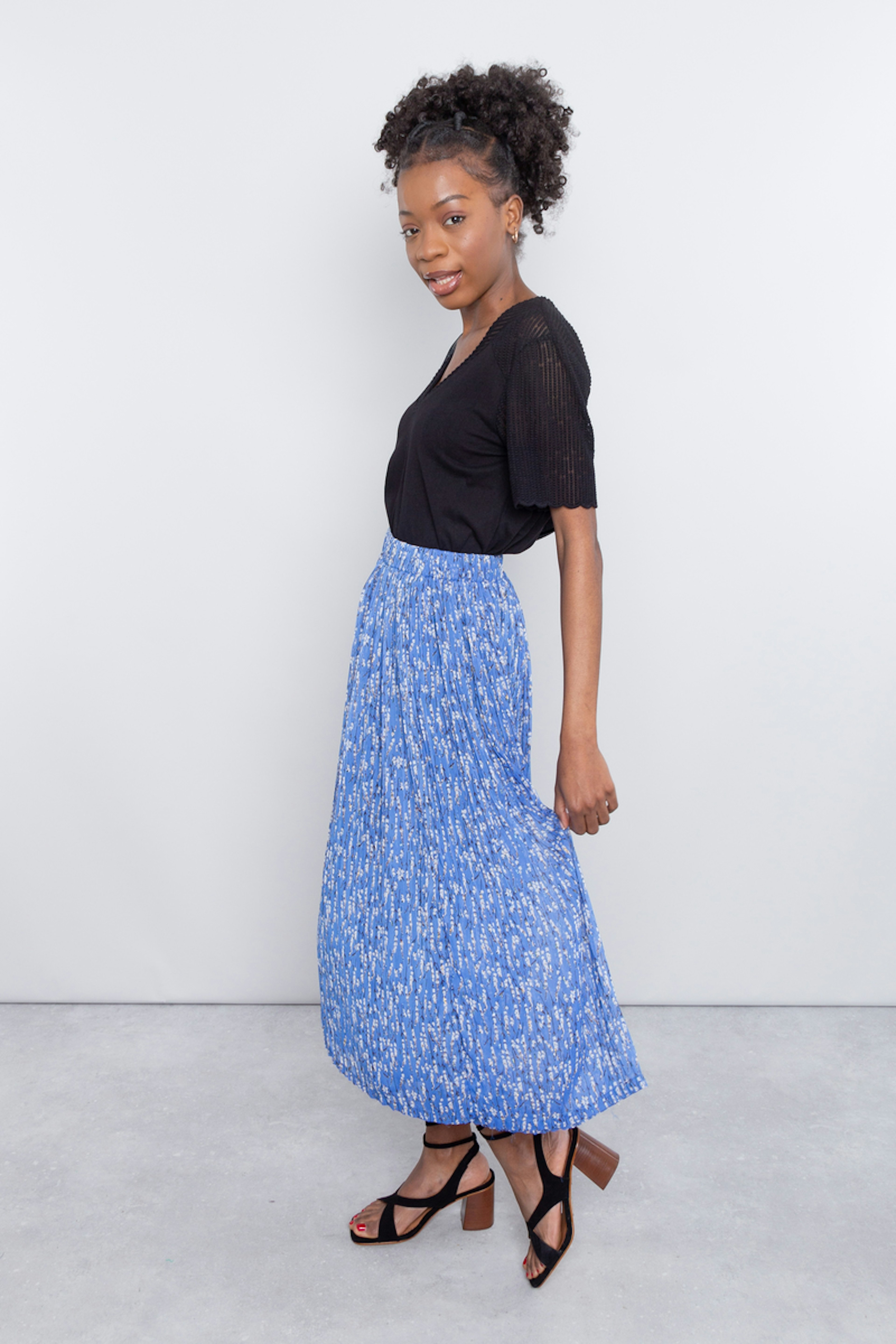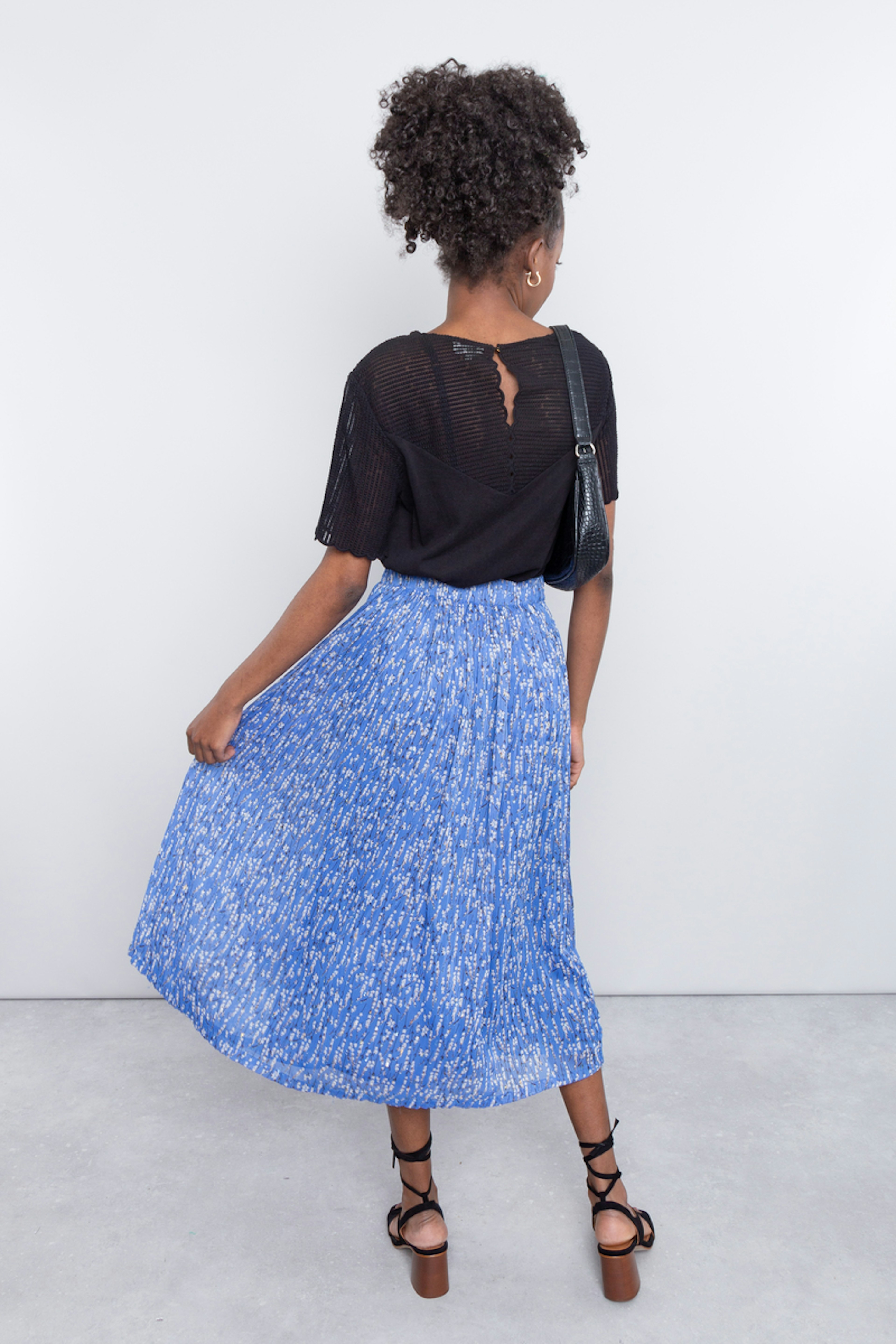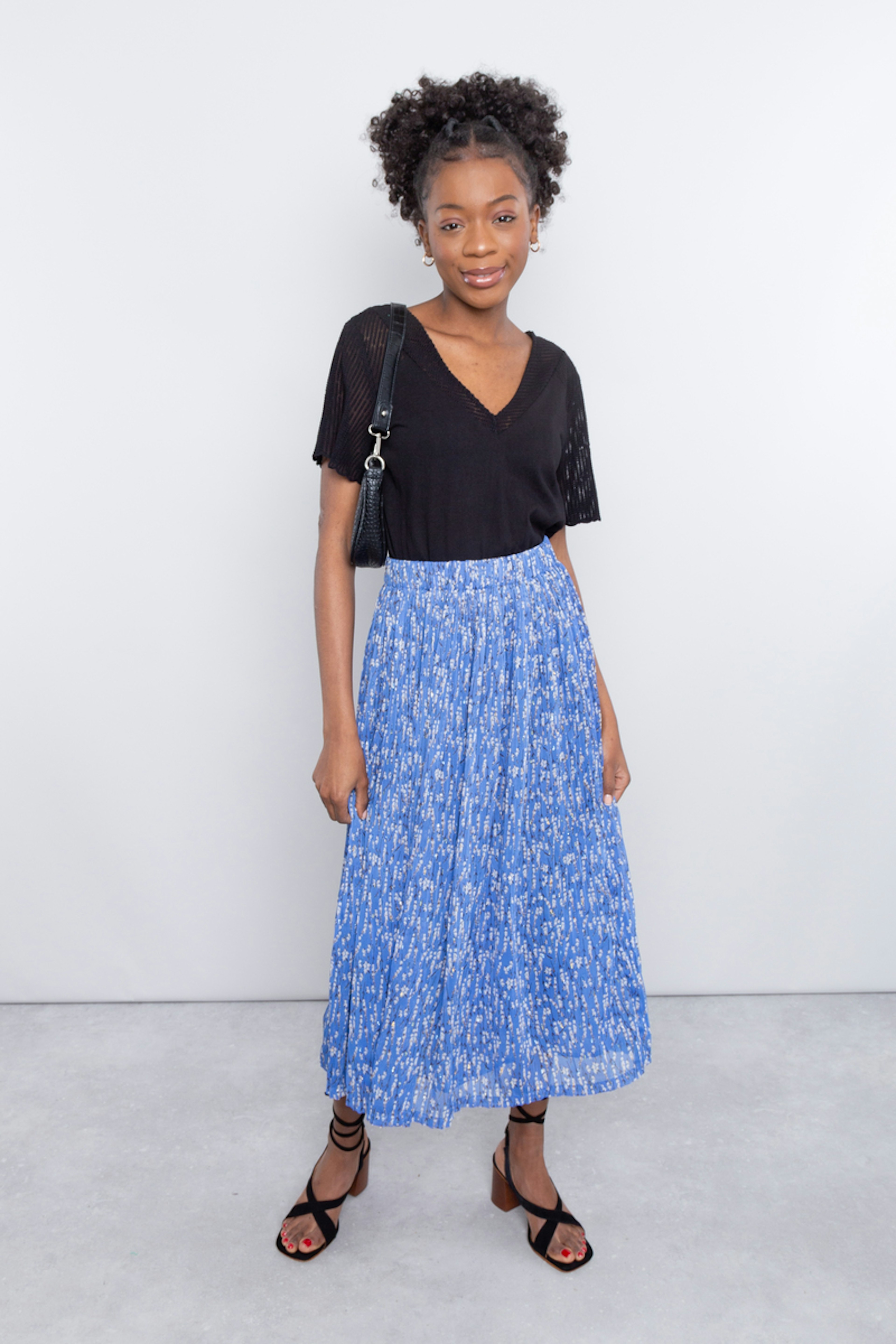 Craquez pour cette jolie jupe plissรฉe fluide ร l'imprimรฉ printanier. Elle donnera un cotรฉ romantique ร vos tenues.