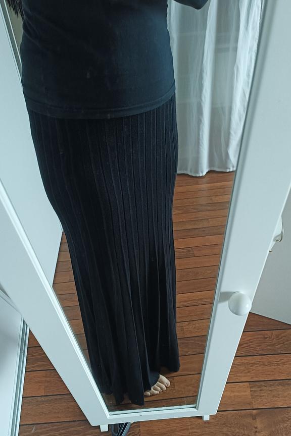โข Jupe longue รฉvasรฉe en maille bicolore noire et bleu โข Jeu de plis โข Taille รฉlastiquรฉe โข Longueur : 95 cm