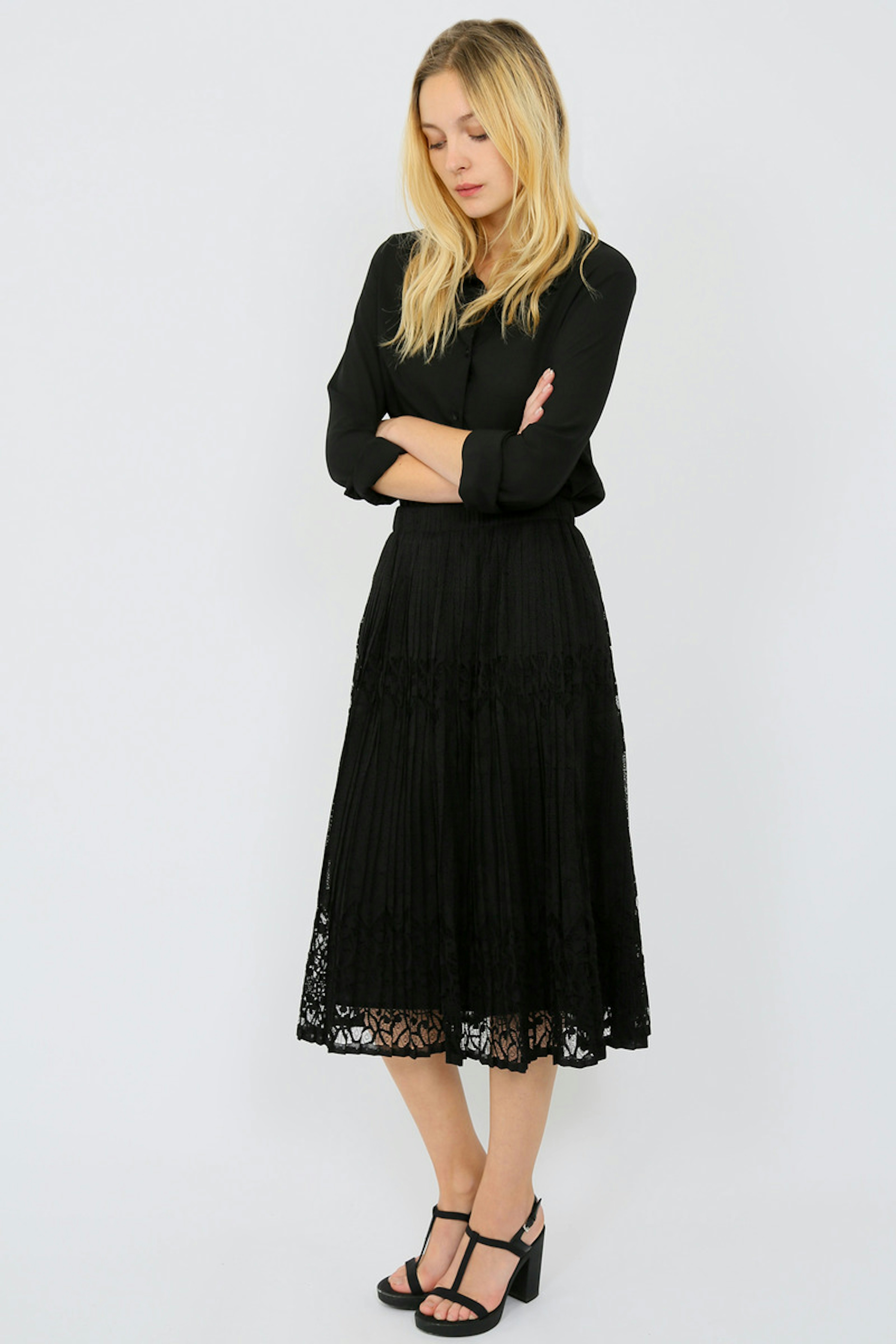 SEE U SOON Jupe รฉlastique mi-longue en dentelle. <b>Tailles:</b> S, M, L <b>Couleur:</b> Noir