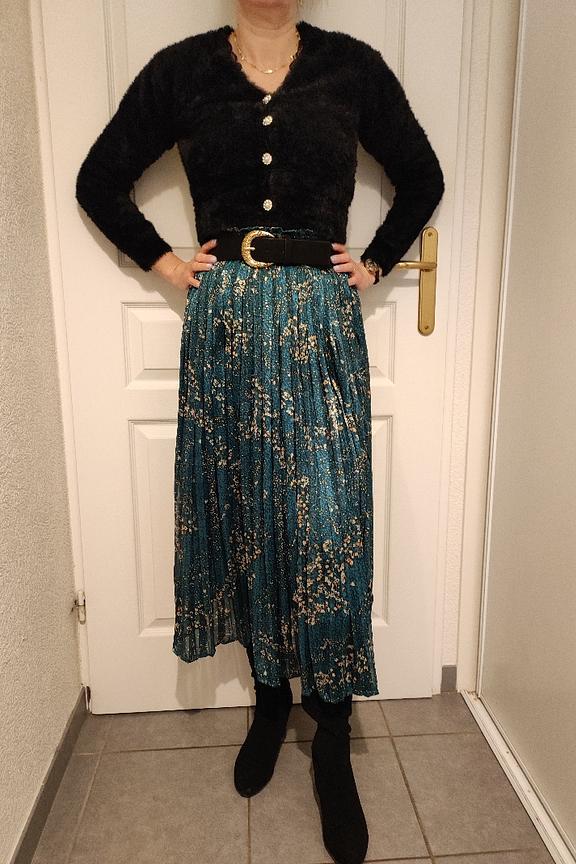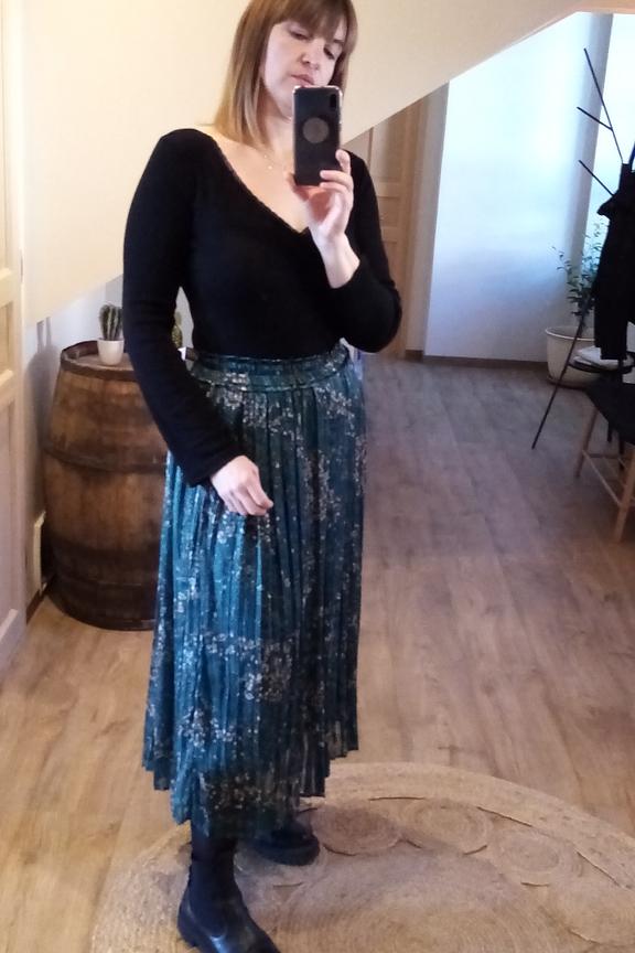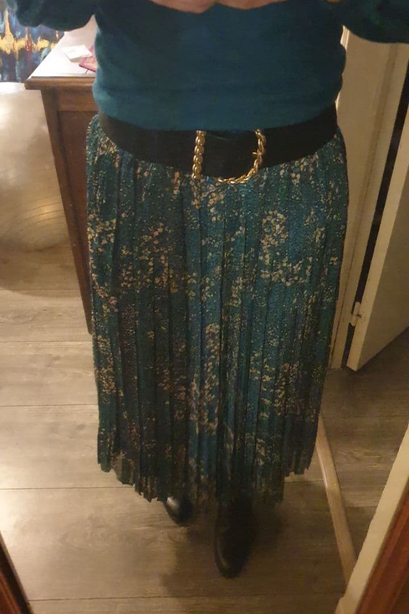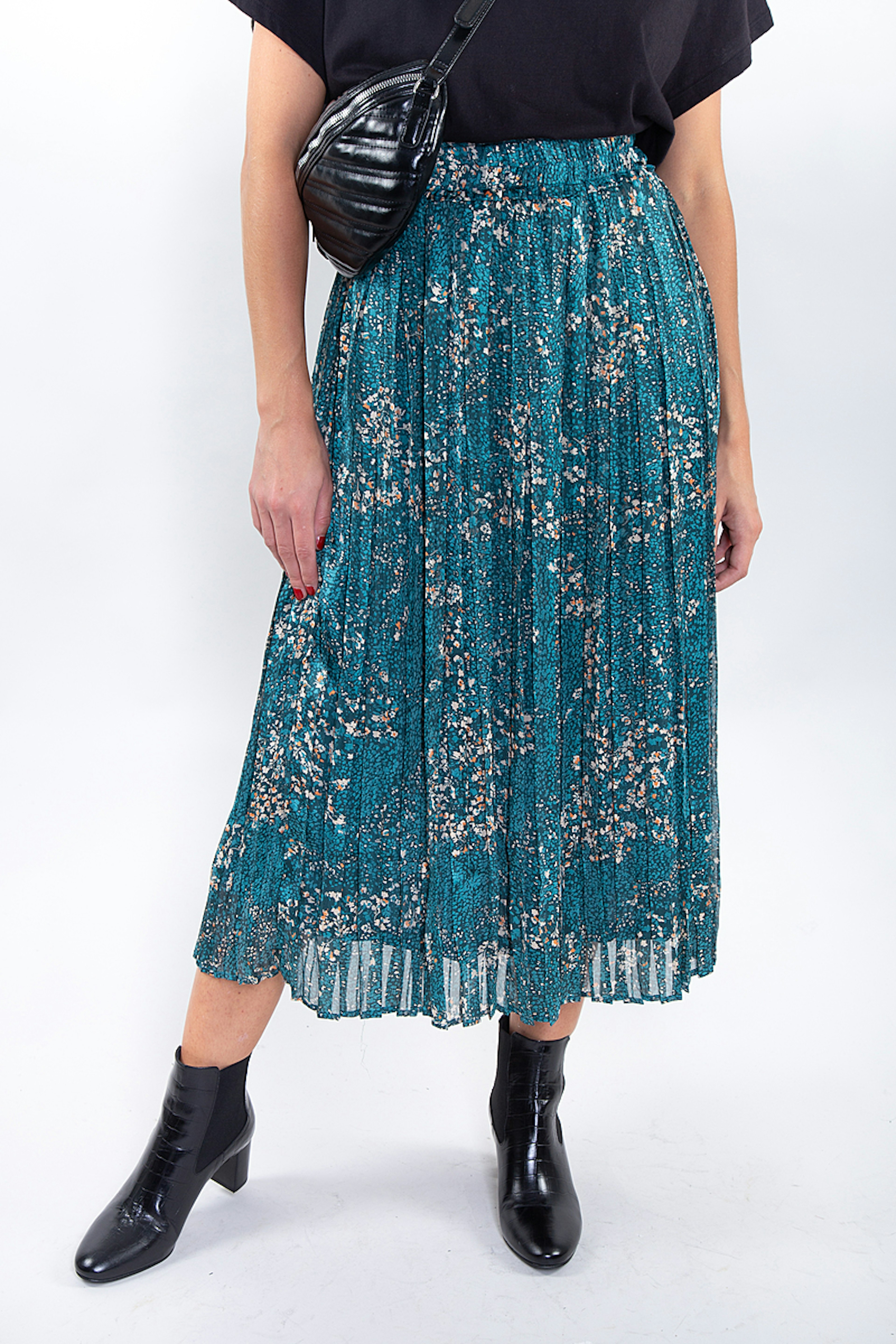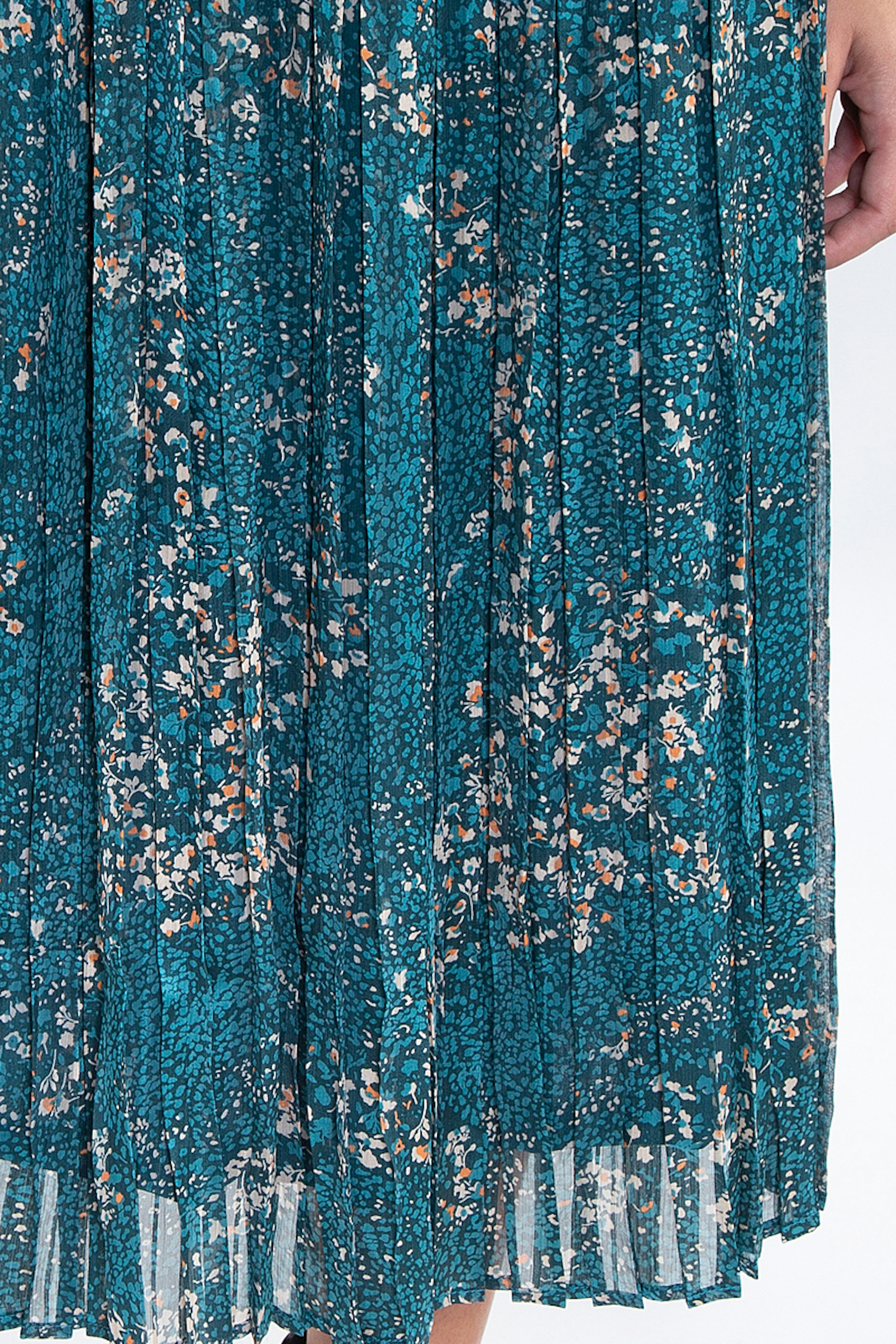 โข Jupe longue plissรฉe โข Couleur bleu-vert โข Imprimรฉ fleuri โข Doublure