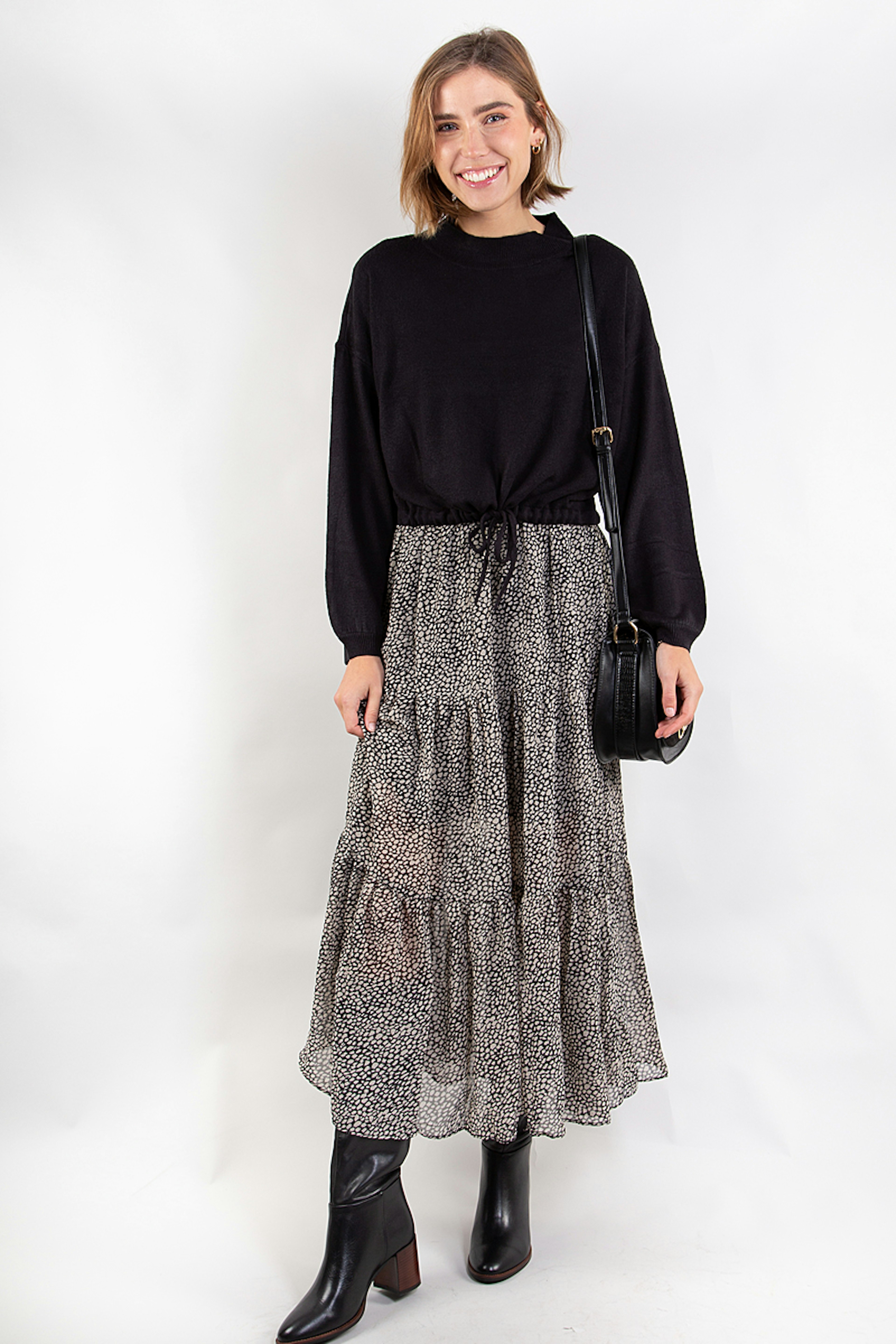 โข Jupe longue ร รฉtages volantรฉs noire avec imprimรฉ effet lรฉopard blanc โข Taille รฉlastiquรฉe โข A porter avec des bottes noires et un pull pour un look d'hiver bohรจme