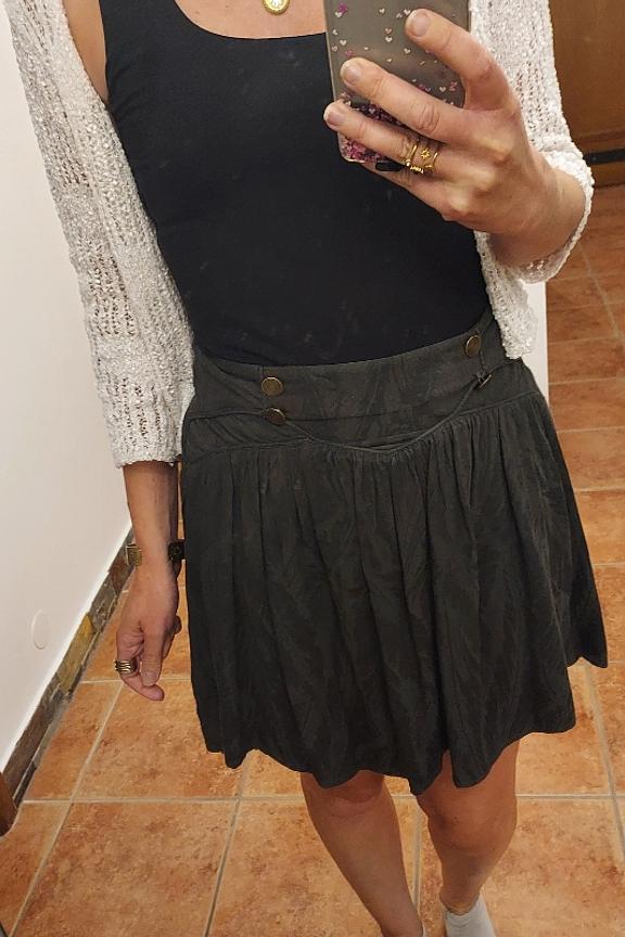 โข Jupe courte kaki โข Ceinture smockรฉe dans le dos โข Dรฉtail de galon et boutons dรฉcoratifs sur le devant โข Tissu jacquard โข Tissu composรฉ de viscose รฉcovero et de rayon certifiรฉ FSC โข Certification oeko-tex