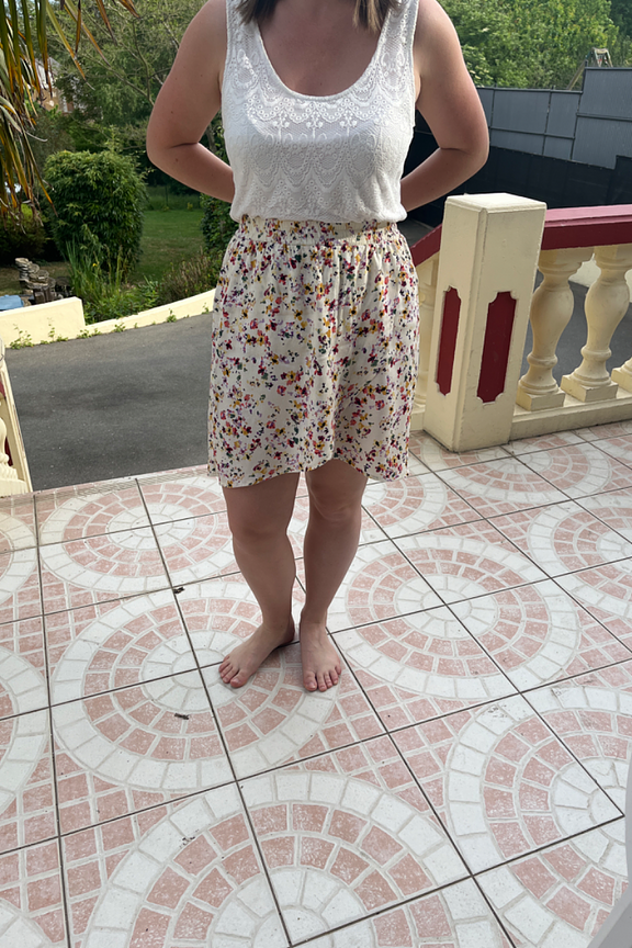 โข Jupe courte portefeuille imprimรฉ fleuri sur fond beige โข Taille mi-haute รฉlastiquรฉe