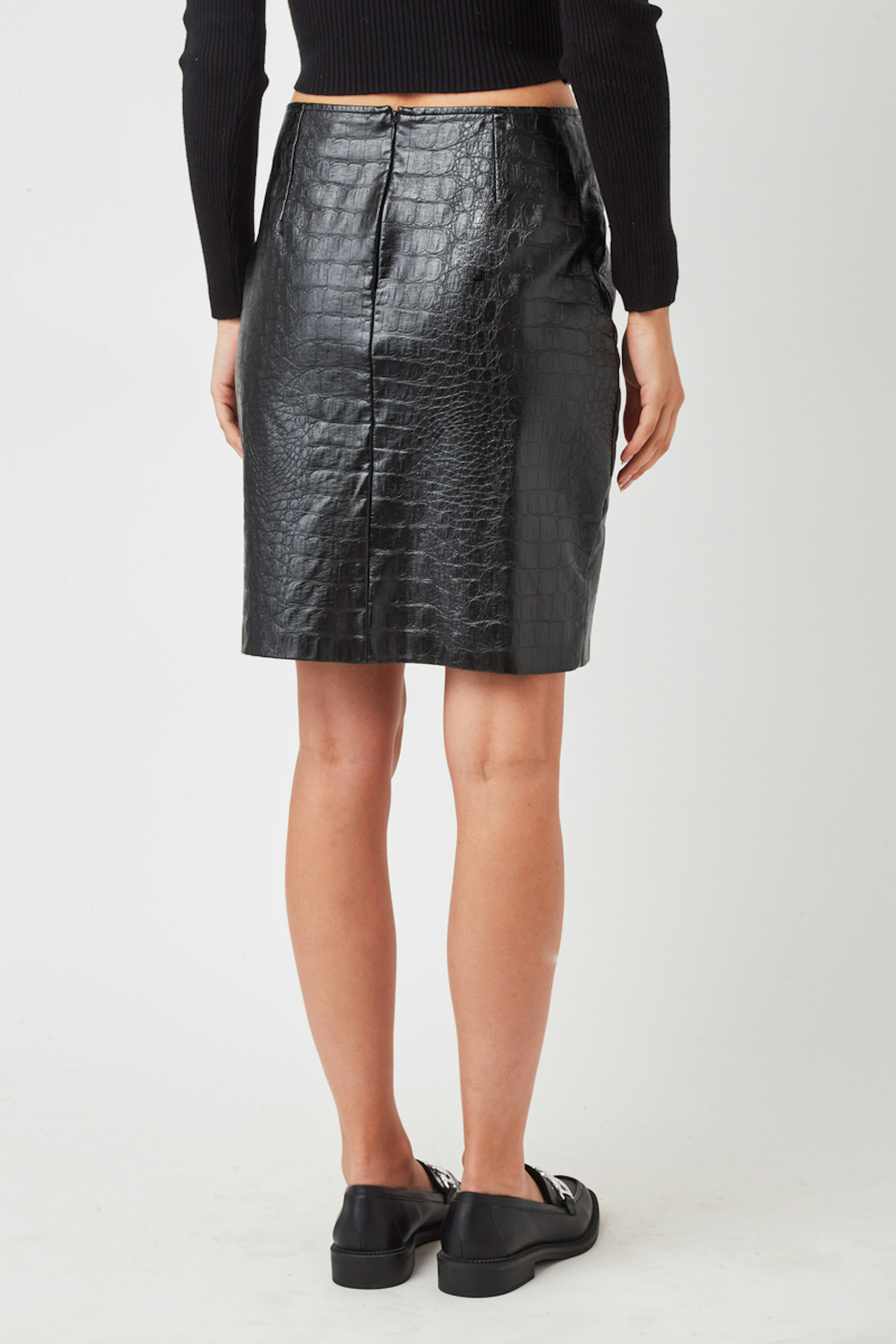 โข Jupe noire en simili-cuir effet croco โข Taille haute โข Coupe portefeuille โข Longueur au-dessus du genou