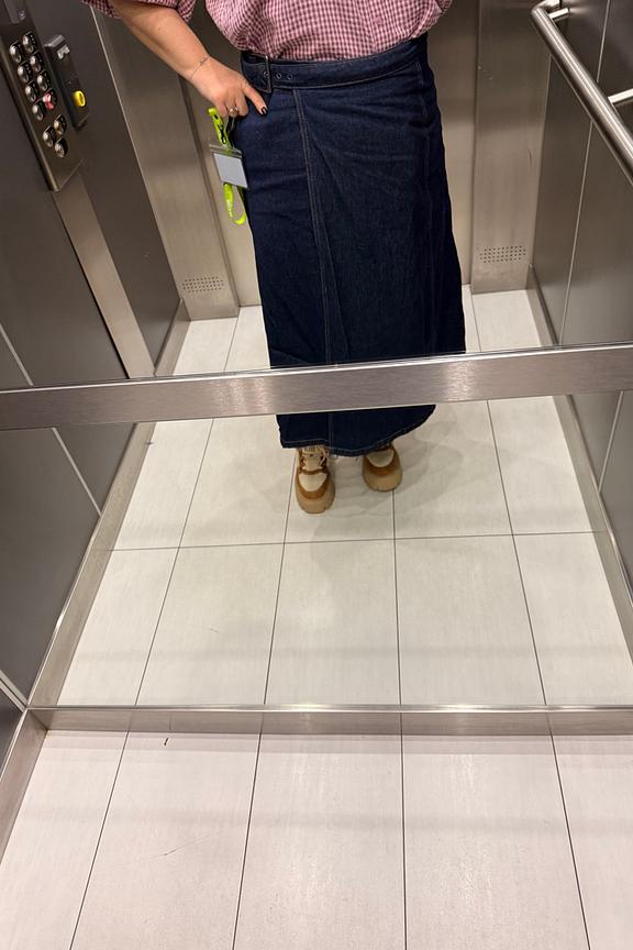 Associez cette jupe avec un chemisier fluide et des bottines pour un look chic en toutes circonstances. • Jupe en denim • Coupe croisée • Fente avant • Ceinture avec boucle • Longueur mi-mollet