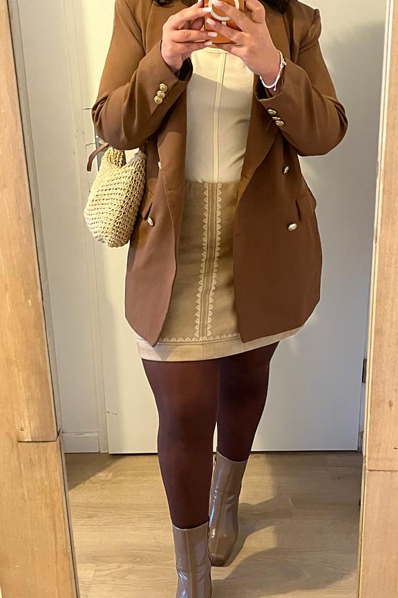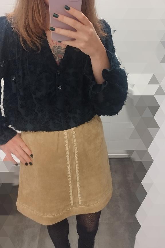 Cette jupe beige est idéale pour toutes les saisons. Associez-la avec un pull col roulé pour l’hiver ou un t-shirt léger pour les jours plus doux. • Jupe courte en suédine • Taille haute flatteuse • Coupe trapèze élégante • Ourlet subtilement brodé • Fermeture éclair invisible
