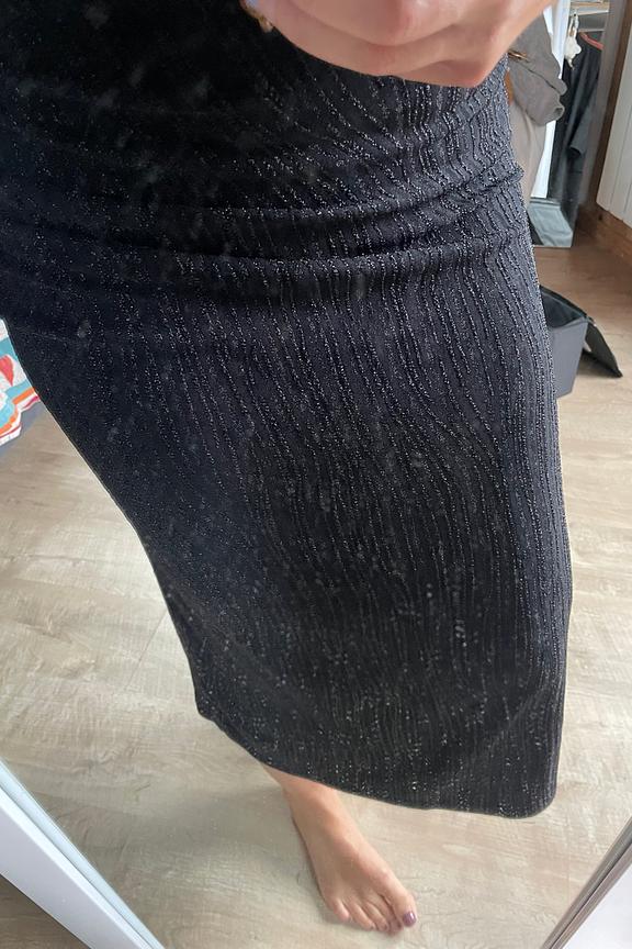Ajoutez une touche de glamour à votre tenue avec cette jupe. Associez-la à un chemisier en soie et des talons pour une élégance intemporelle. Parfaite en toute saison. • Jupe midi à paillettes • Effet drapé • Fendue sur le côté • Ceinture plate à l'avant • Jupe asymétrique