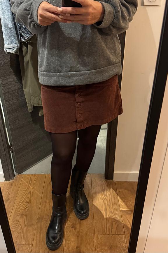 Associez cette jupe en velours ร  un pull col roulรฉ et des bottes hautes pour un look cosy d'hiver. โ€ข Jupe courte en velours cรดtelรฉ โ€ข Coupe ajustรฉe โ€ข Fermeture boutonnรฉe devant โ€ข Poches plaquรฉes โ€ข Couleur marron chaleureuse