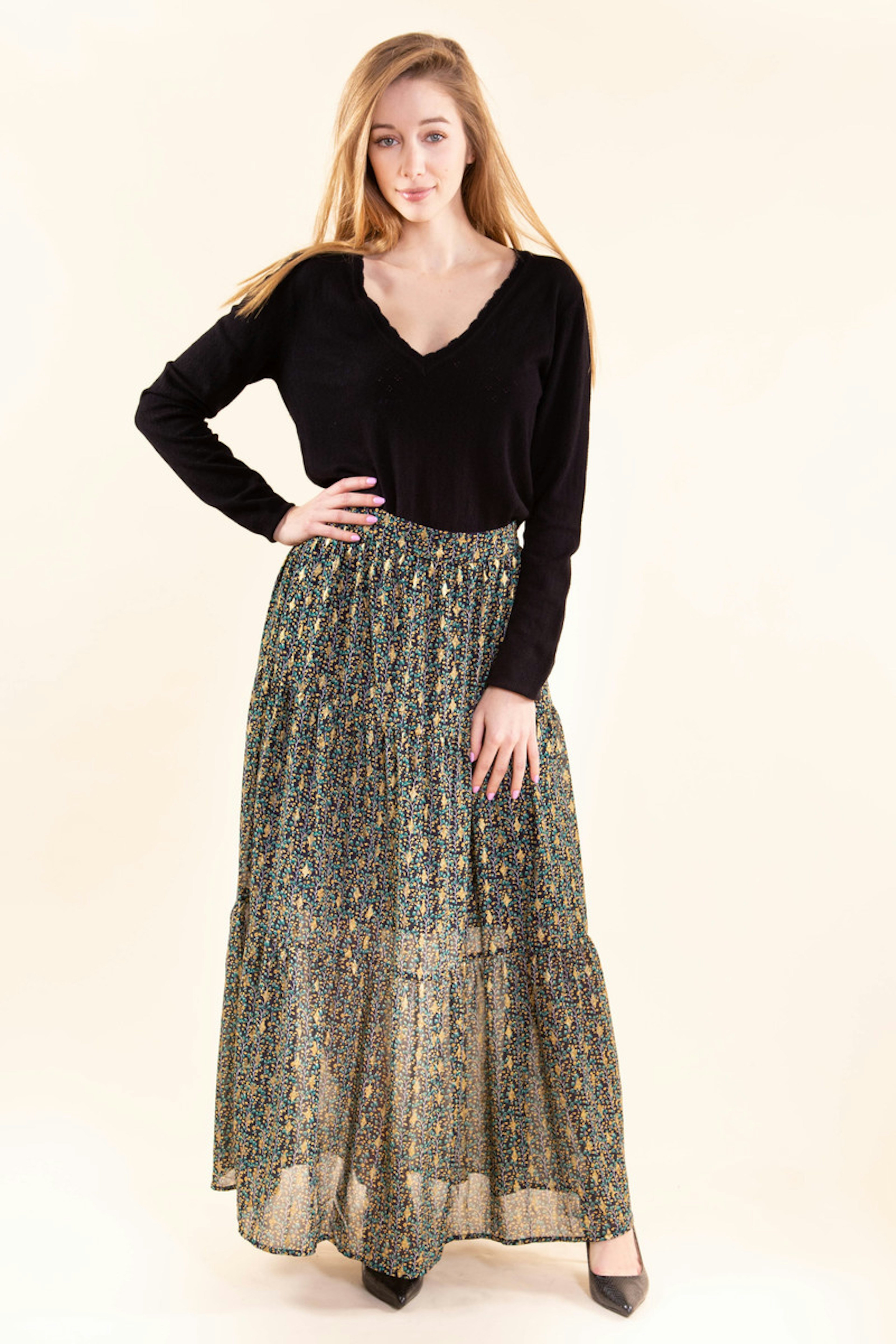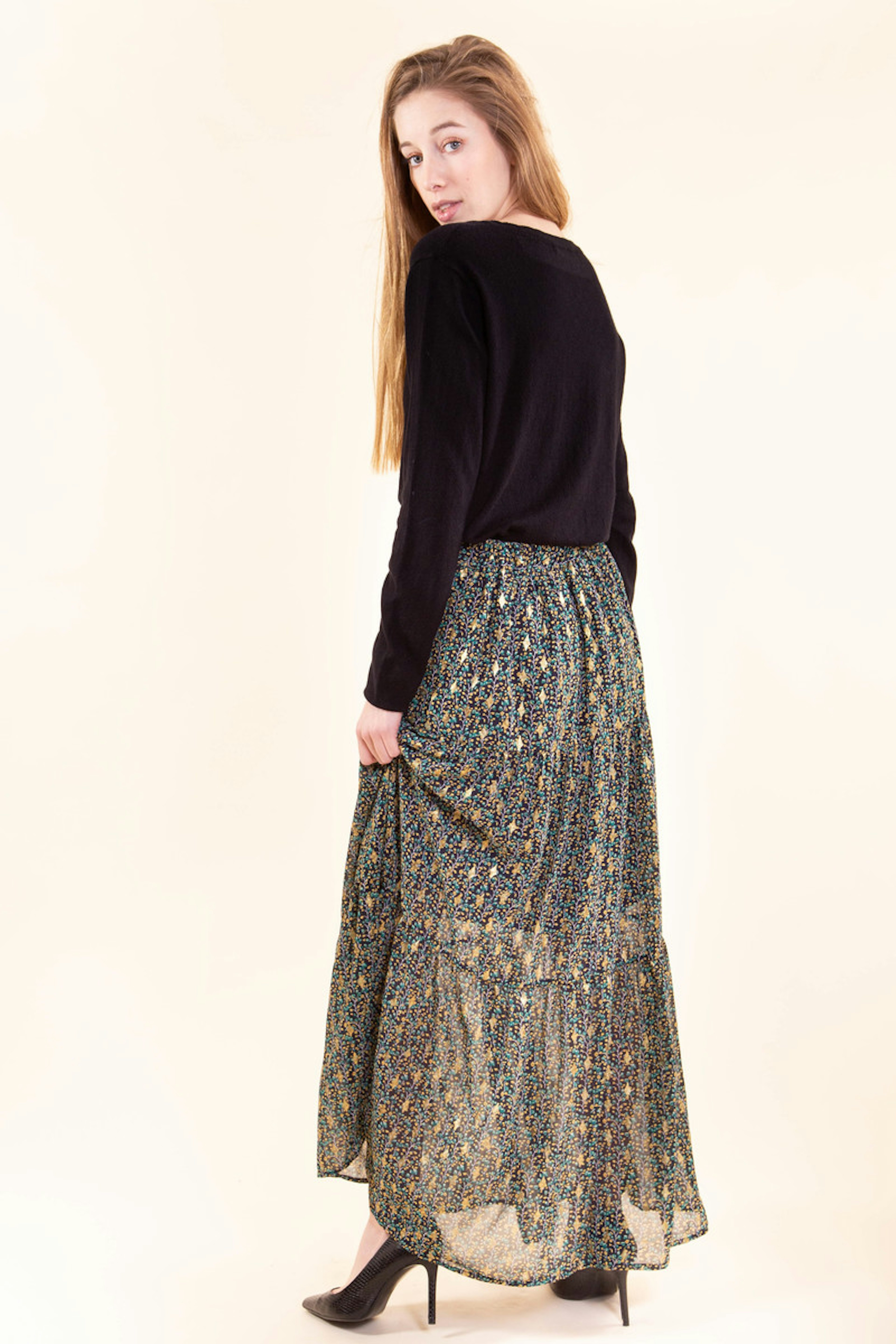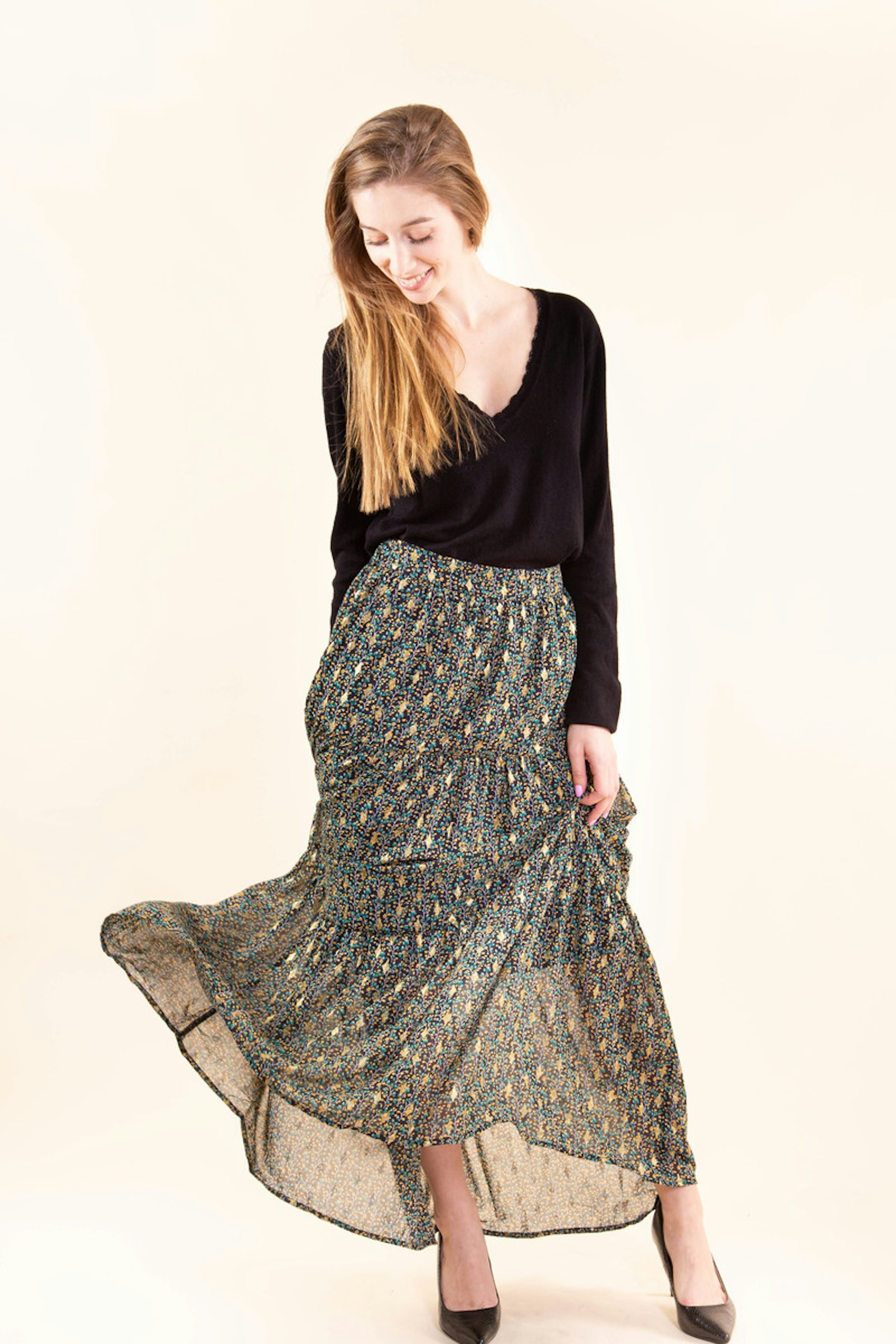 On a craquรฉ pour cette jupe longue bohรจme. Son jeu de transparence est mis en valeur grรขce ร sa doublure unie. Pour juger de la longueur de la jupe, notre mannequin fait 1M62 et porte du S.