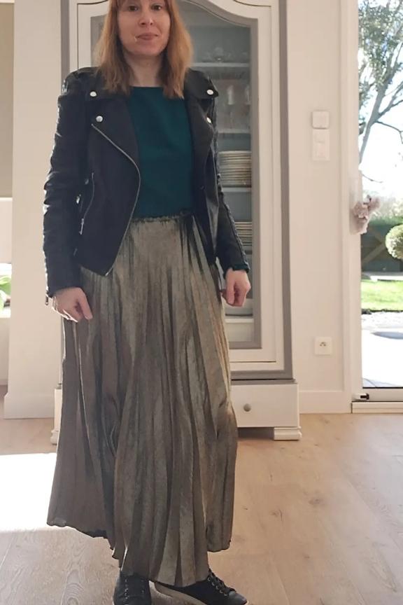 โข Jupe midi plissรฉe โข Couleur or โข Taille รฉlastique โข Coupe droite et รฉvasรฉe