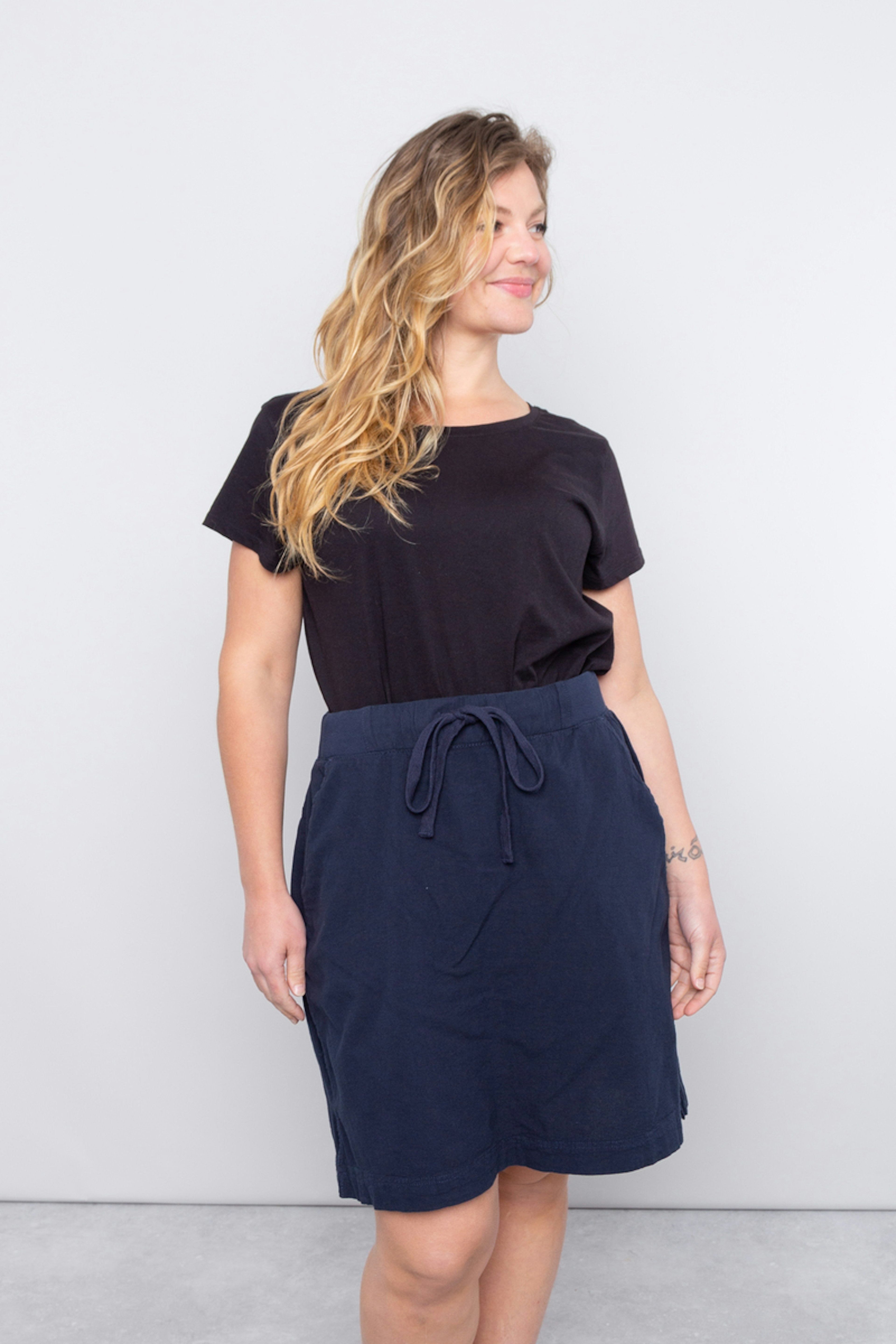 โข Jupe courte en coton โข Coloris bleu marine โข Taille รฉlastiquรฉe avec lien de serrage sur le devant โข Longueur au-dessus du genou