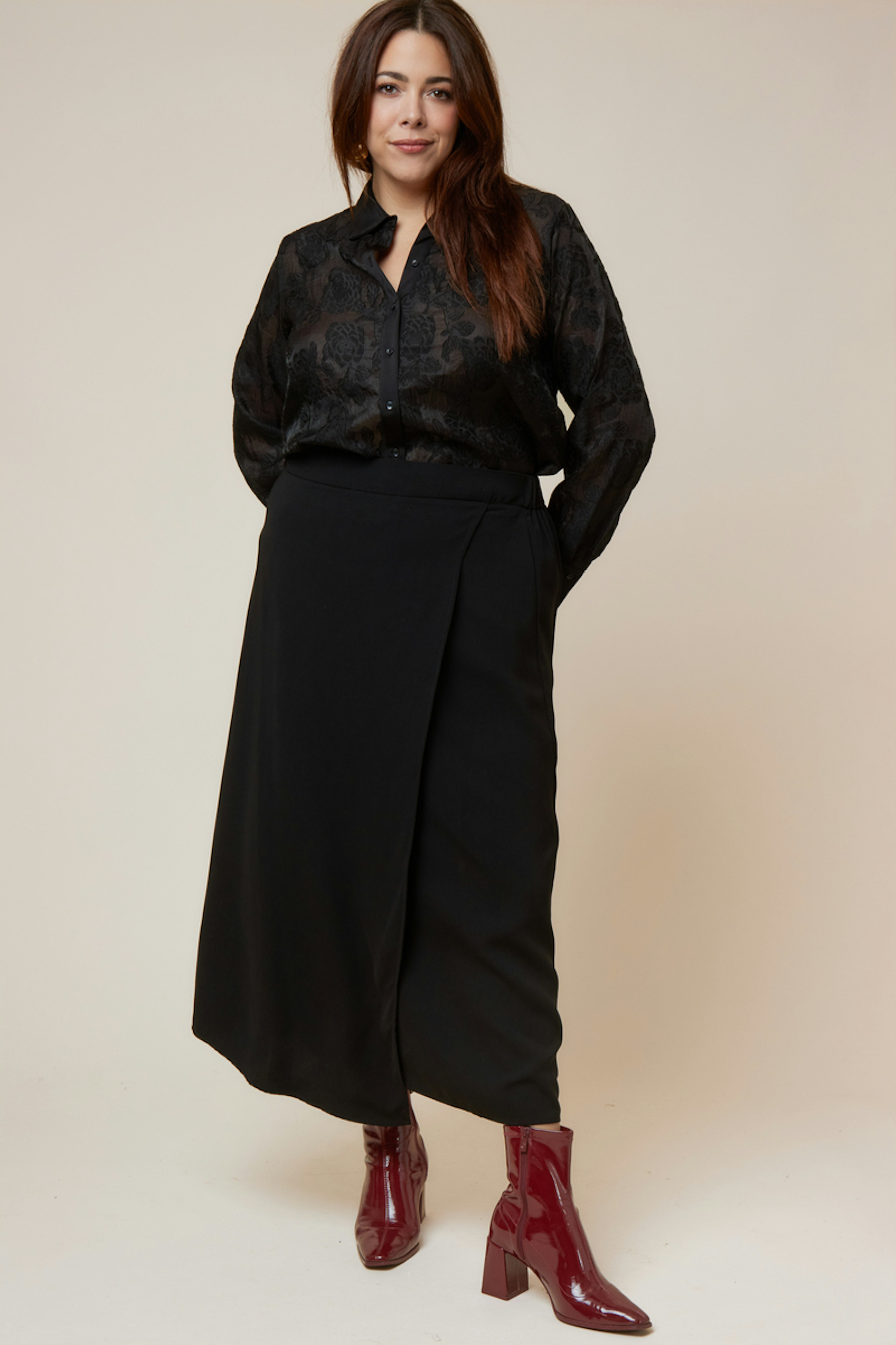 Associez cette jupe élégante avec une blouse en soie et des bottines à talons pour un look chic parfait en toute saison. • Jupe longue • Coupe fluide • Taille haute • Fente latérale • Noir unicolore