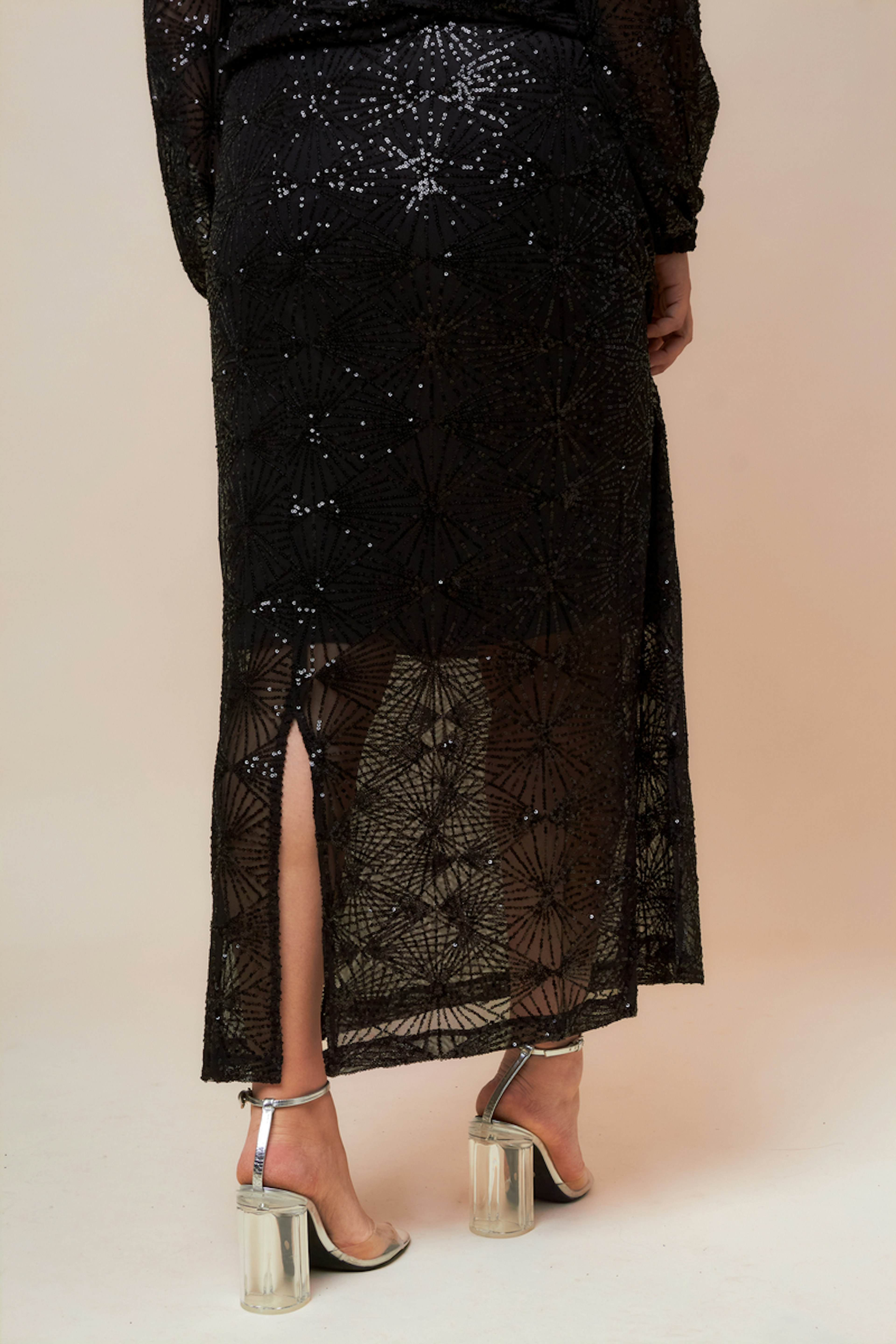 Associez cette jupe avec un haut en soie et des escarpins noirs pour une allure chic hivernale. • Jupe longue en tissu fluide • Coupe droite élégante • Taille haute flatteuse • Motif géométrique • Texture légèrement transparente