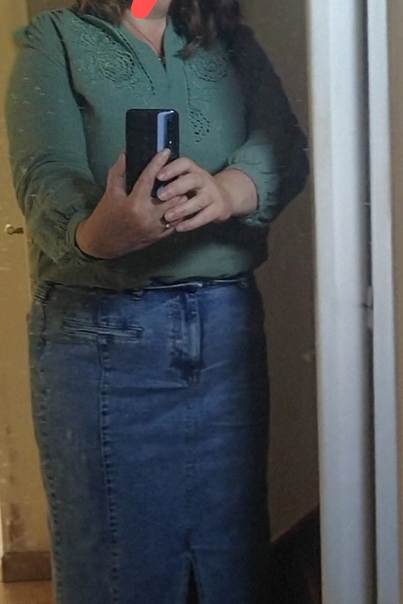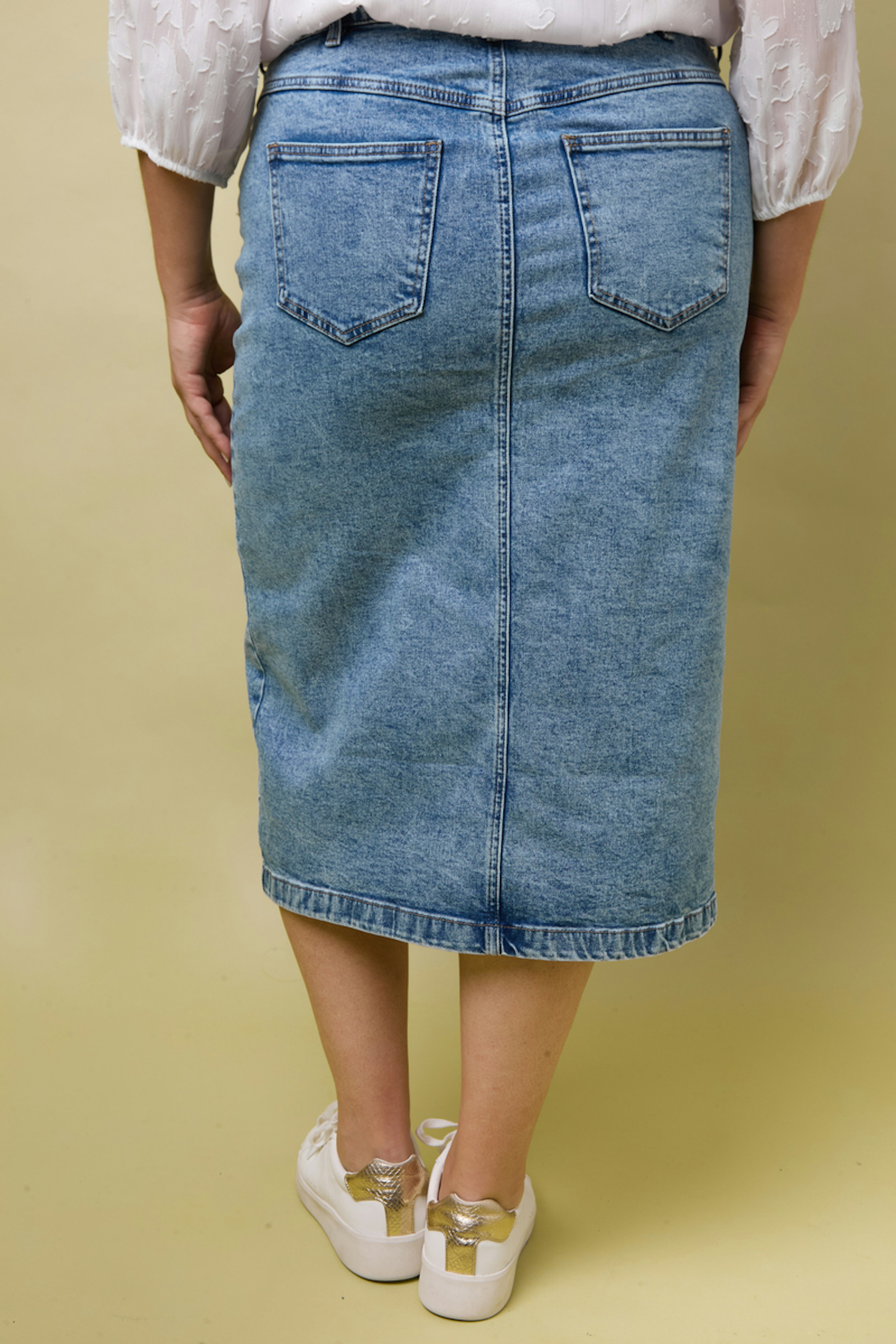 Associez cette jupe à une blouse vaporeuse et des bottines pour un look élégant en toute saison. • Jupe en jean • Coupe droite • Taille haute • Longueur midi • Fente avant