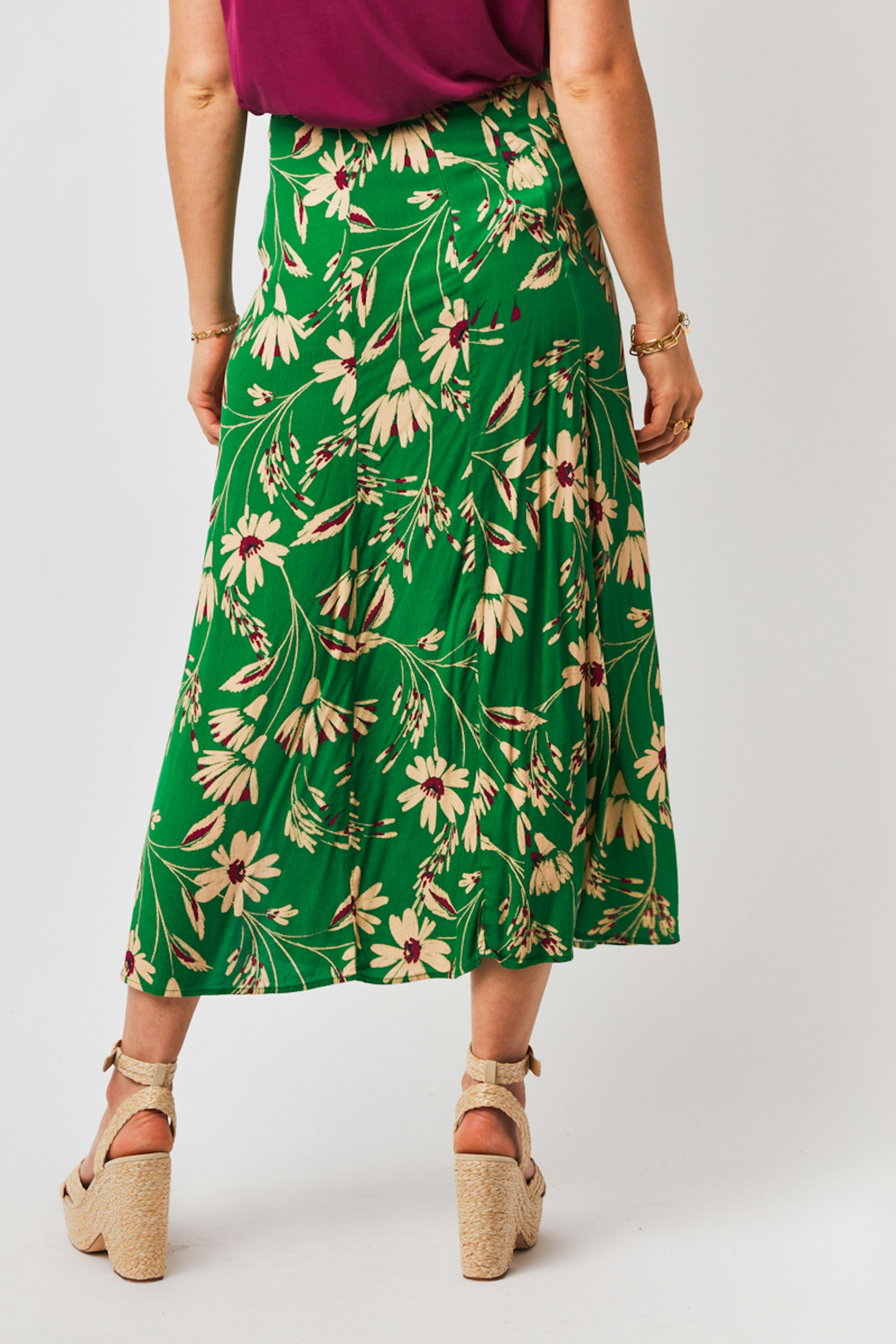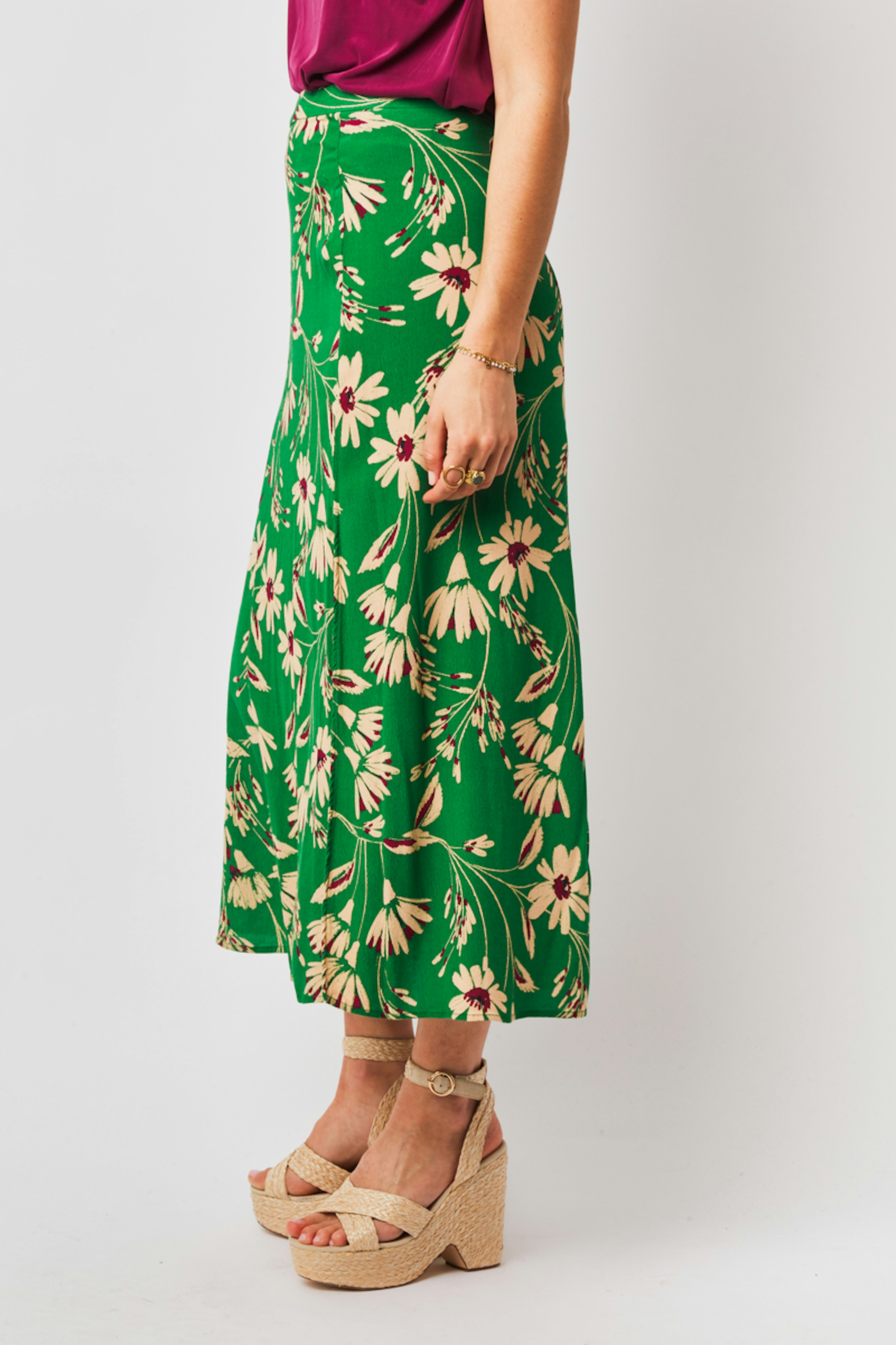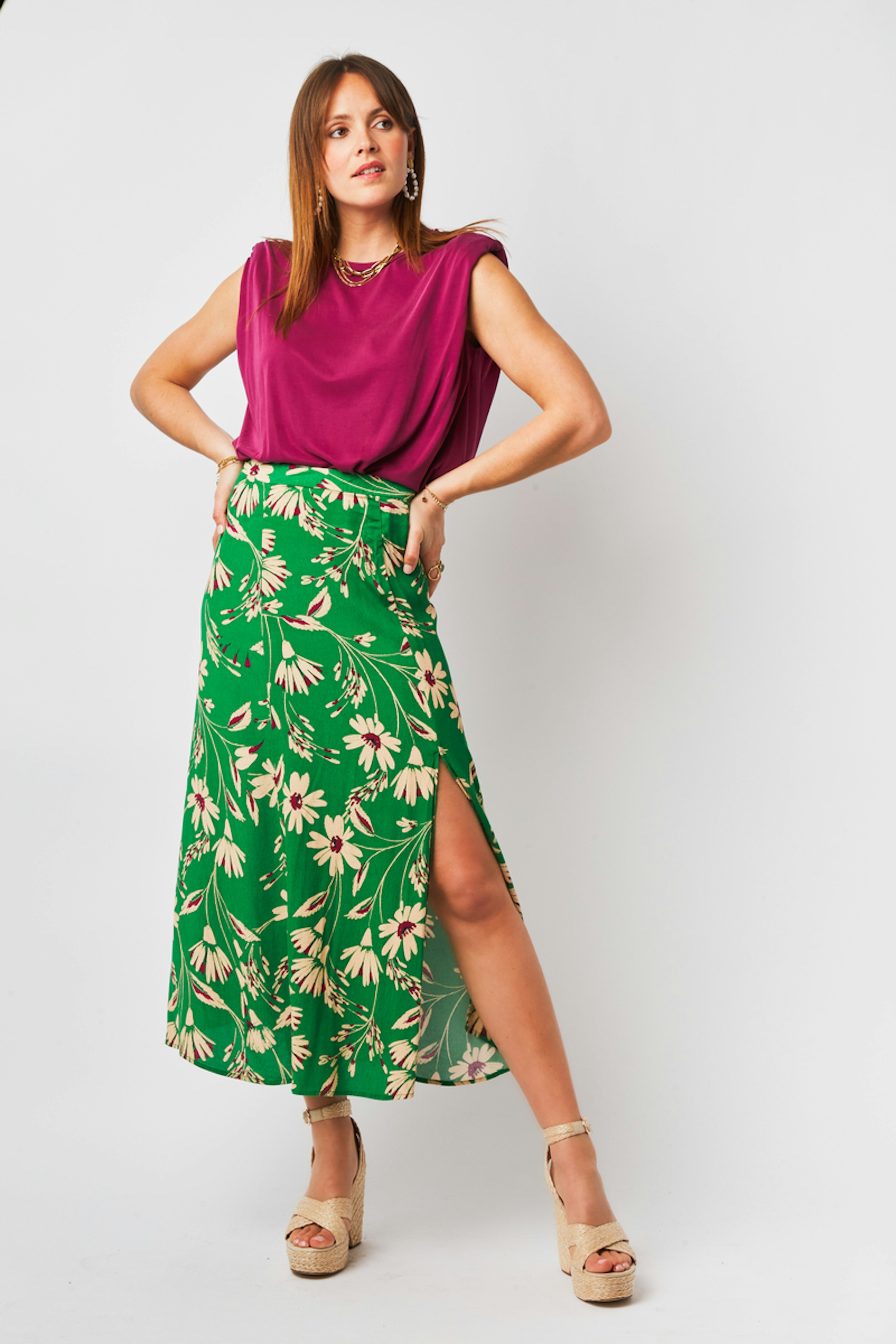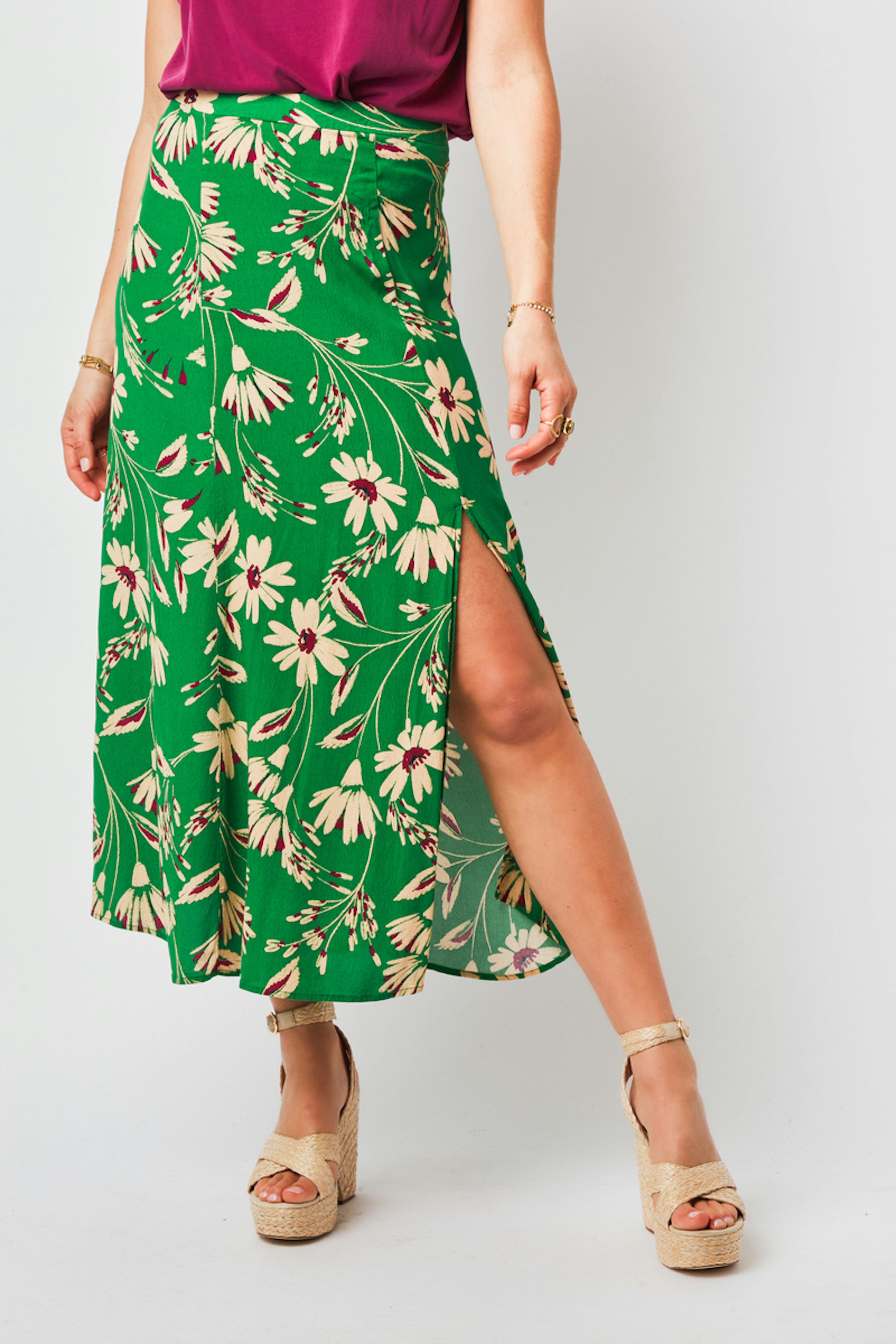 โข Jupe longue droite โข Imprimรฉ ร motif floral โข Grande fente sur le cรดtรฉ โข Zip invisible dans le dos