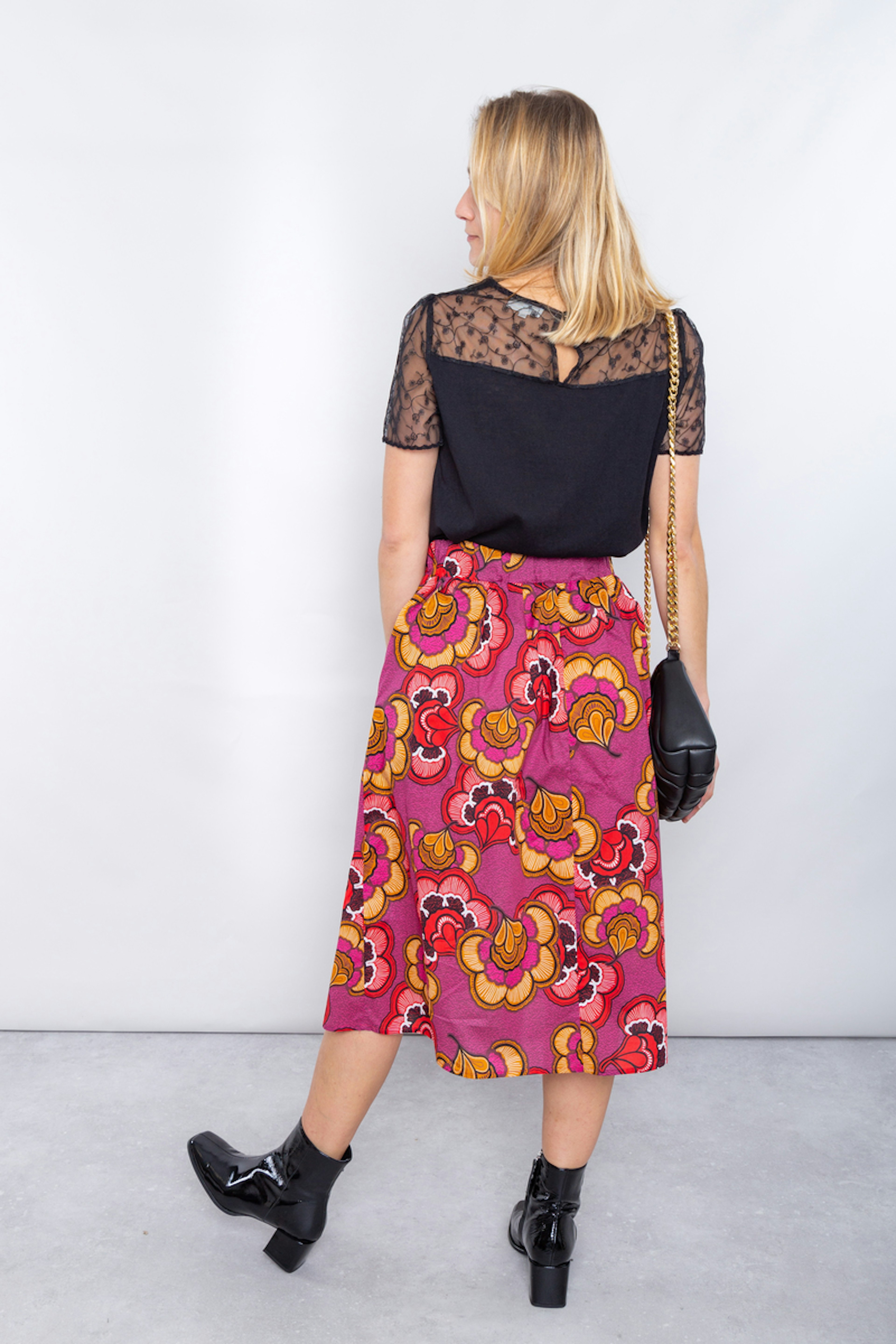 โข Jupe midi en popeline de coton imprimรฉe โข Motif faรงon Wax โข Taille รฉlastiquรฉe et forme รฉvasรฉe โข Poches italiennes โข Doublure : 100% coton
