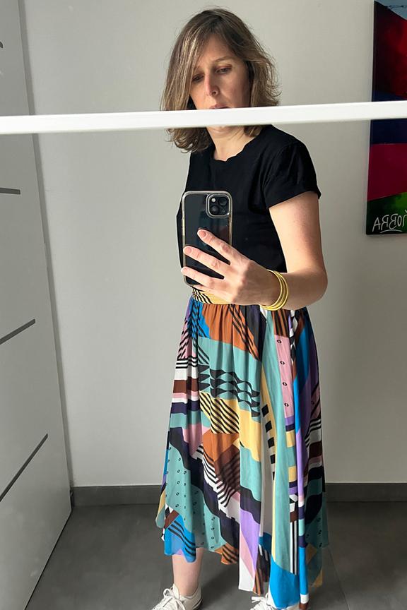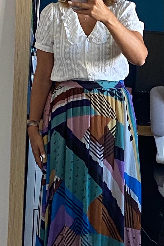 โข Jupe longue Fanja โข Motif gรฉomรฉtrique โข Resserรฉe ร la taille โข Tissu plissรฉ โข Coupe รฉvasรฉe